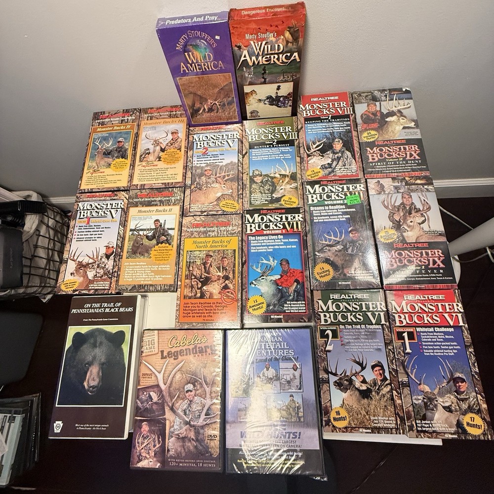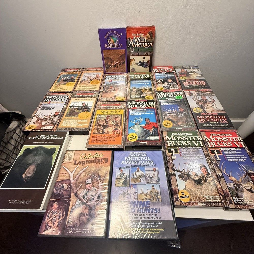 19-piece vintage hunting and outdoor video lot featuring some of the most sought-after names in whitetail and wildlife media, including Realtree Monster Bucks, Marty Stouffer’s Wild America, Pennsylvania Game Commission, Cabela’s Legendary Hunts, and Jim Shockey’s Canadian Whitetail Adventures. This lot is ideal for hunters, collectors, and VHS-era outdoor enthusiasts. Several items are still factory sealed, while others were previously viewed and remain in good collectible condition. 🎯 Included in This Lot (19 Total Pieces) • Realtree Monster Bucks VHS series – multiple volumes (I–X range) • Marty Stouffer’s Wild America VHS titles • Pennsylvania Game Commission – On the Trail of Pennsylvania’s Black Bears VHS • Cabela’s Legendary Hunts DVD • Jim Shockey’s Canadian Whitetail Adventures – Nine Wild Hunts! DVD (factory sealed) ⭐ Highlights ✔ Mix of VHS & DVD formats ✔ Several factory sealed copies (see photos) ✔ Iconic Monster Bucks titles — highly collectible ✔ Clean spines & good shelf presentation ✔ Perfect for collectors, man caves, hunting camps, or nostalgia displays ⸻ 📌 Condition • Overall Condition: Good to Very Good • Some items are new & factory sealed • Others were previously viewed • All cases show typical light shelf wear consistent with age • Untested beyond visual inspection • Sold as a complete lot only Please review all photos carefully — they are part of the description. ⸻ 📦 Shipping • Ships securely packed • Will combine media to protect cases and corners • Ships next business day after payment