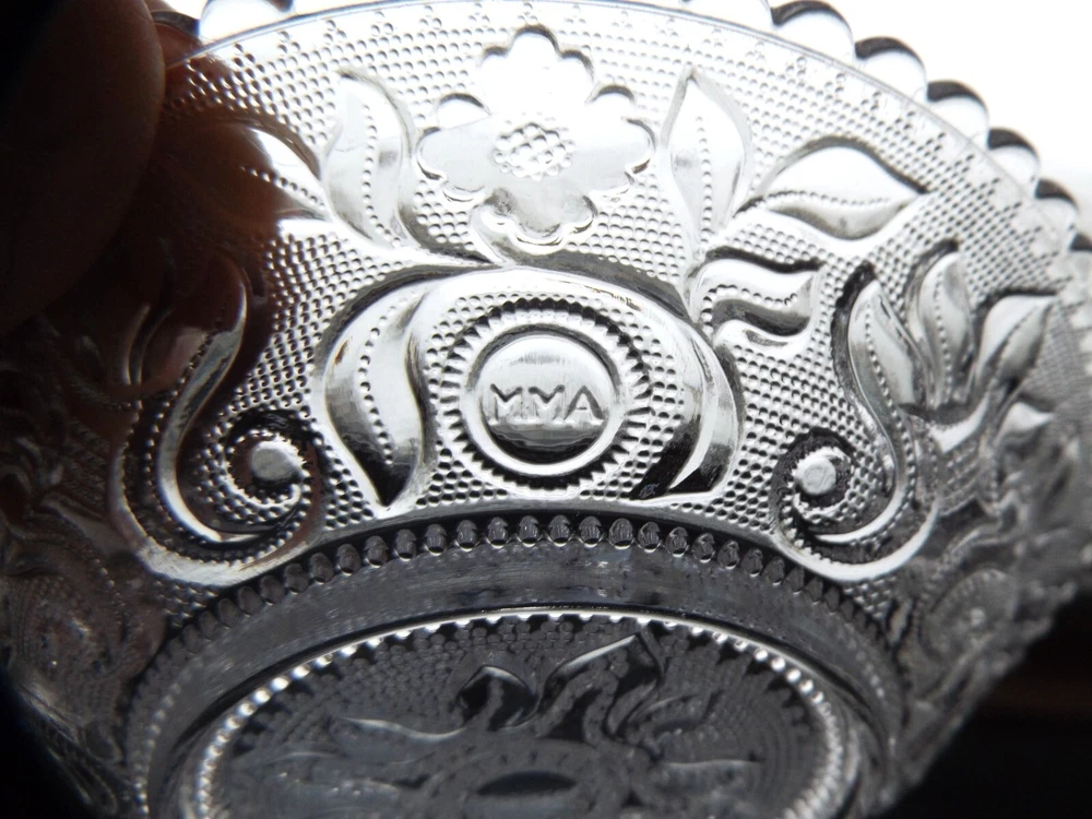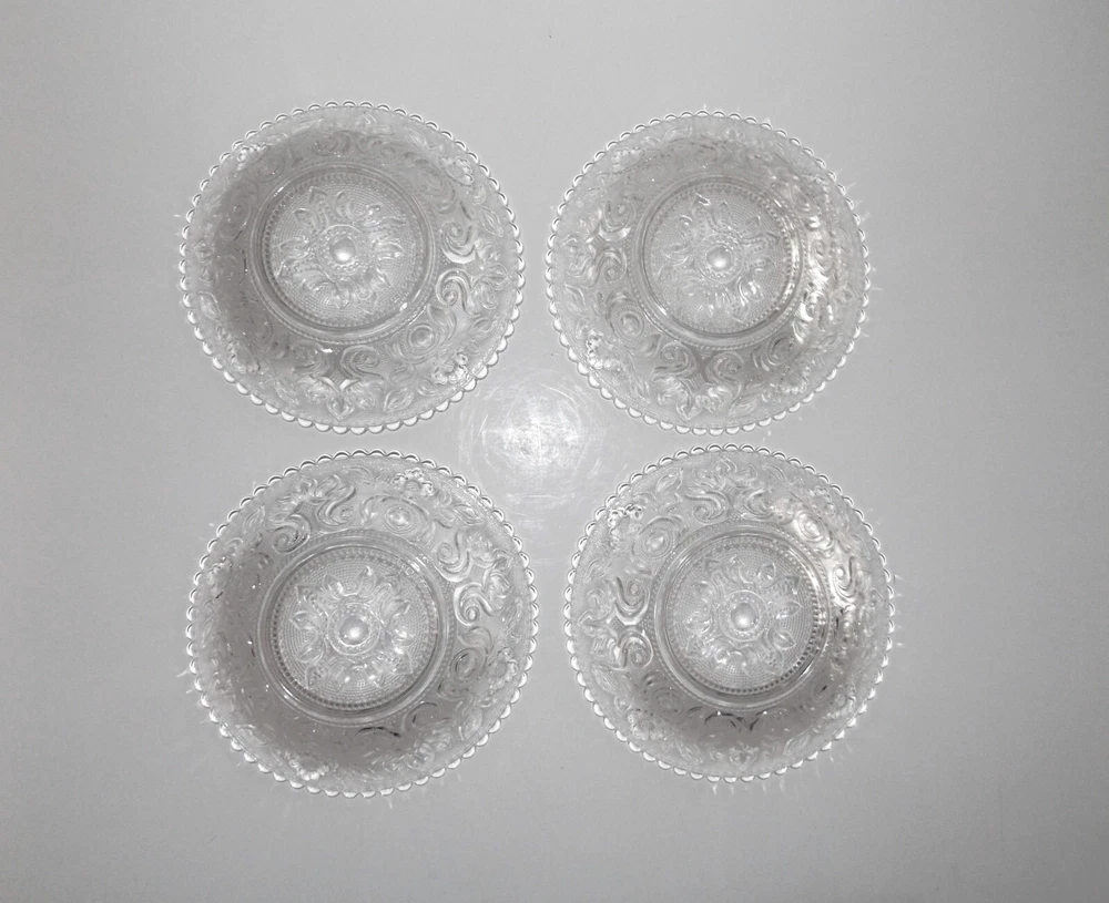 Set of 4 Vintage Imperial Clear Glass Lacy Bowls Metropolitan Museum of Art Set of 4 Imperial Glass clear pressed glass Boston and Sandwich Lacy Bowls commissioned by the Metropolitan Museum of Art to duplicate the style of early – mid 1800s. Floral design with beaded glass fill. Scalloped edges. Each bowl is marked with small MMA embossed in the bowl design. Bowls measure approximately 6 ¼” wide x 1 ¼” deep. No chips, cracks or breaks. May be some pre-owned surface marks. Selling as is. Use pictures as part of description. Stand for display only; not included.