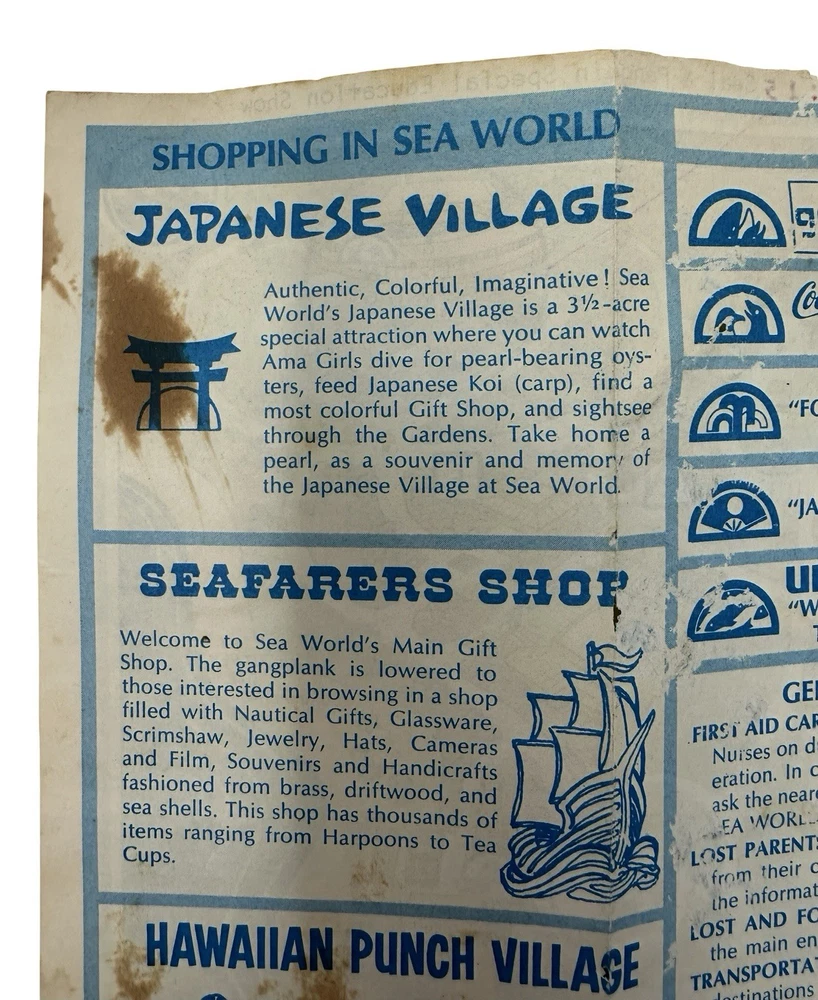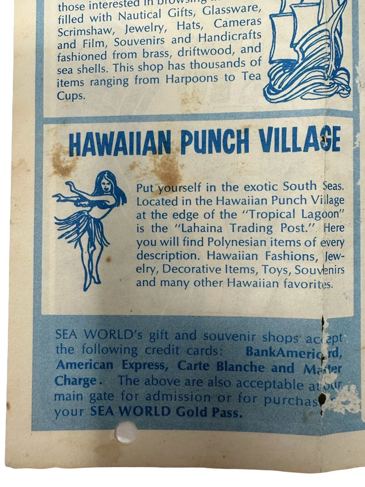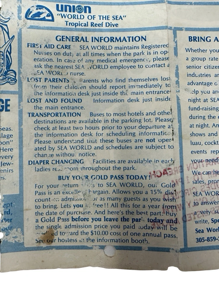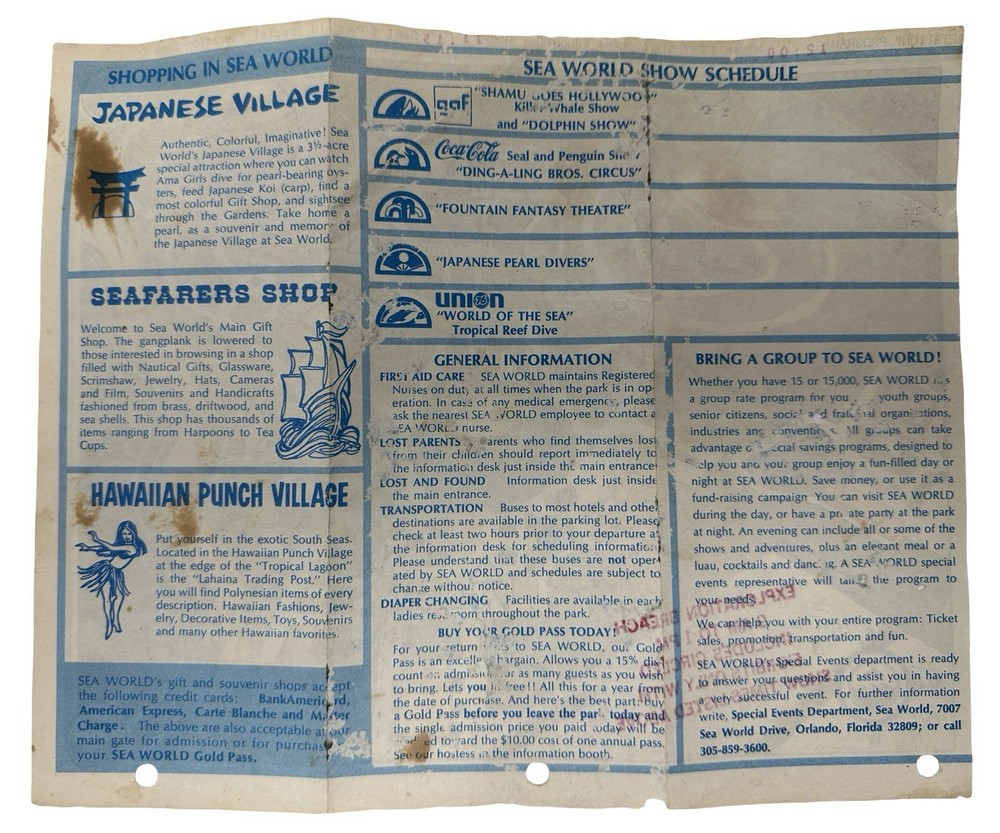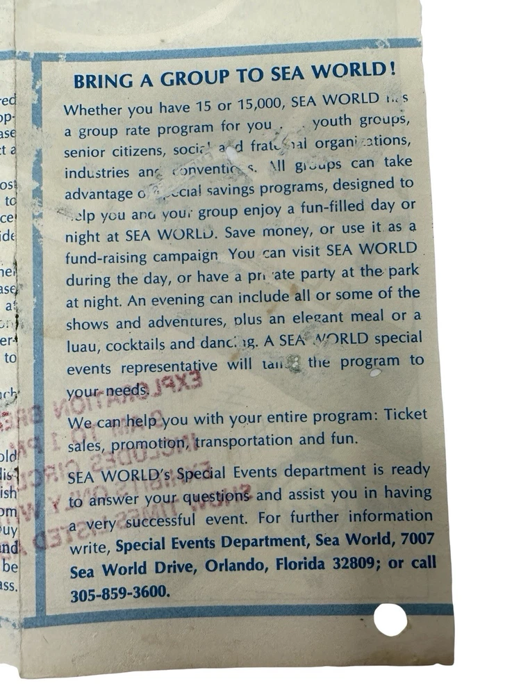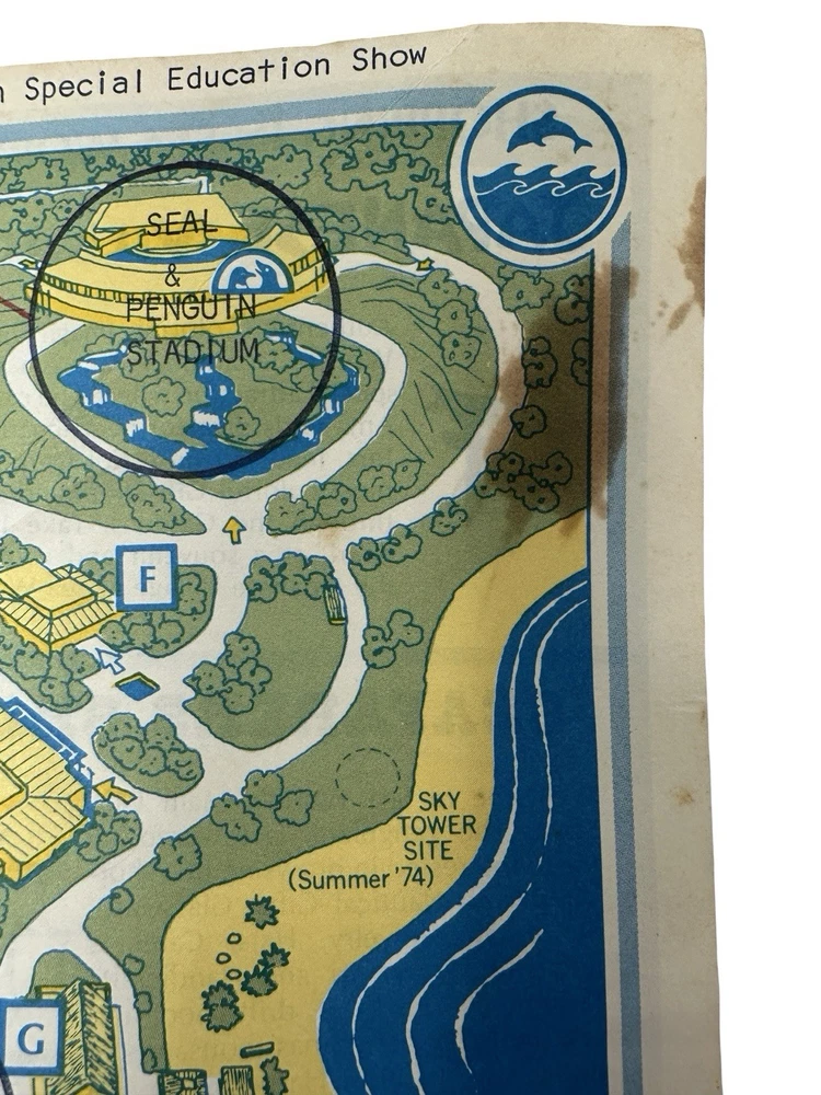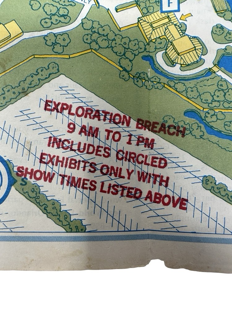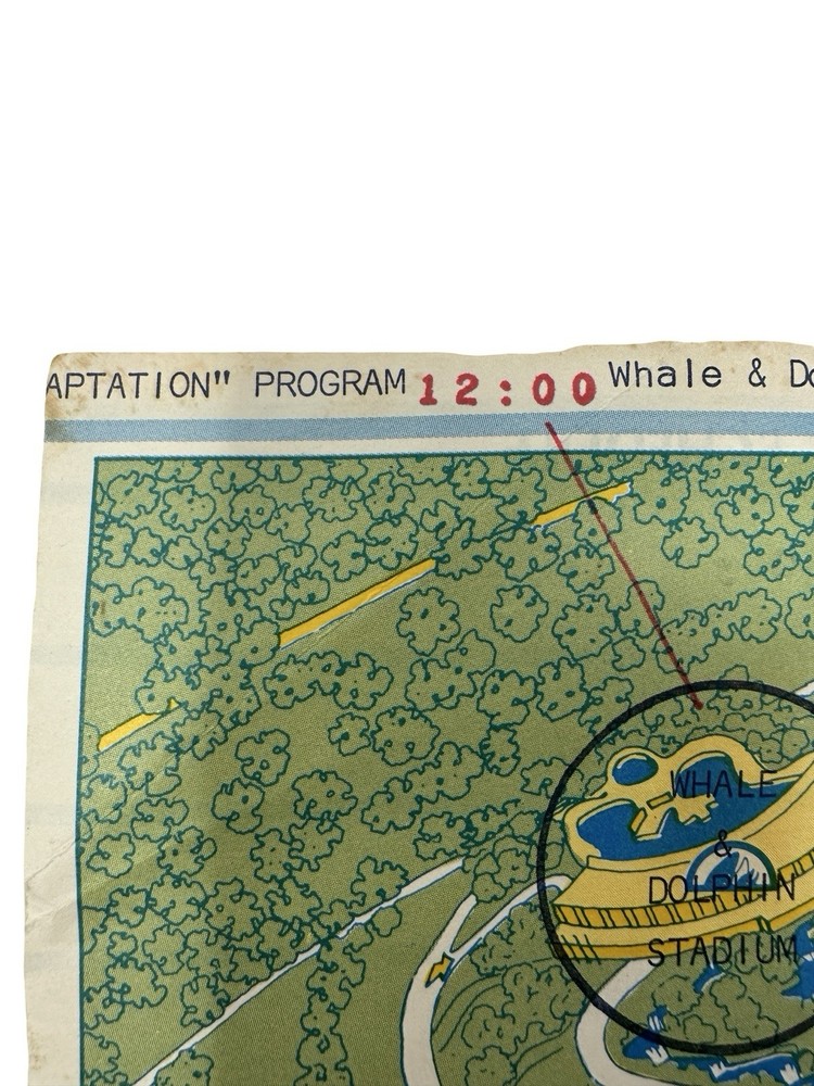 Offered here is an extremely rare early park map from the opening era of SeaWorld Orlando , dating to approximately 1973–1974 . What makes this example especially unusual is that it is not the standard tourist map , but rather the educational program version used for school groups , clearly marked with the bold red stamp: “EXPLORATION BREACH – 9 AM TO 1 PM – INCLUDES CIRCLED EXHIBITS ONLY WITH SHOW TIMES LISTED ABOVE.” The Exploration Breach program was SeaWorld’s early educational initiative designed for student groups visiting the park. Teachers and chaperones were given specially marked maps like this one to guide students through a curated schedule of marine-education exhibits and shows. The map also includes hand-drawn style circles identifying the approved exhibits , including: Whale & Dolphin Special Education Show Seal & Penguin Special Education Show Marine Aquarium Lunch / storage area for school groups These markings were printed specifically for the program itinerary, making this a distinct variant of the park map rather than a regular guest edition. Early SeaWorld Historical Features This map captures SeaWorld Orlando in its earliest years after the park opened in December 1973 , showing many of the original attractions and sponsor exhibits that defined the park’s early identity. Highlights include: Whale & Dolphin Stadium Seal & Penguin Stadium Marine Aquarium Japanese Village pearl divers exhibit Hawaiian Punch Village Union 76 “World of the Sea” exhibit Perhaps most interesting to collectors, the map also clearly marks the future location of the iconic SeaWorld Orlando Sky Tower with the text: “Sky Tower Site (Summer ’74)” This notation dates the map to before the tower opened , placing it firmly in the first year of park operations . Why This Map Is Rare Several factors make this piece particularly collectible: • Early 1973–1974 SeaWorld Orlando park map • Educational program edition rather than public guest version • Printed before the Sky Tower opened in 1974 • Shows the park during its original attraction lineup • Ephemera that was typically discarded after school visits Early SeaWorld Orlando material is far less common than Disney or Universal ephemera from the same era, making pieces like this very difficult to locate today . Features • Original SeaWorld Orlando park map brochure • Early Exploration Breach educational program edition • Shows Sky Tower site (Summer ’74) • Printed show schedule and educational routing for school groups • Early park attractions and sponsor exhibits displayed • Authentic 1970s theme park ephemera • Condition Summary: Fair vintage condition with staining, fold wear, creases, and small holes visible. Shipping & Returns • Free US Shipping • 30 day returns (must be returned in original condition)