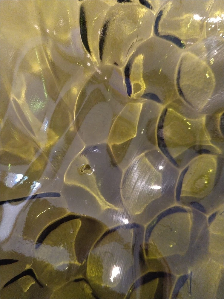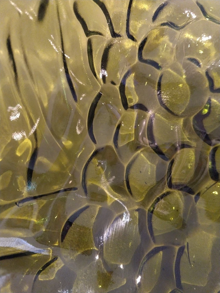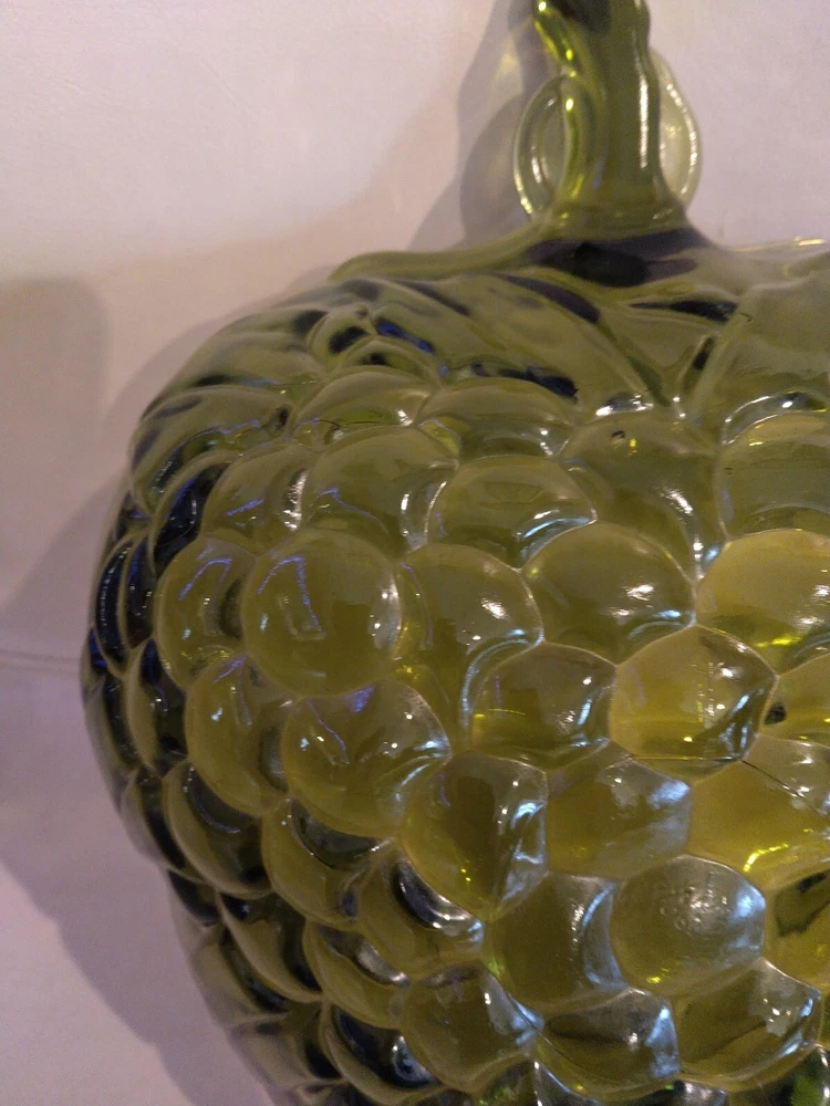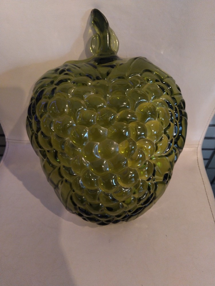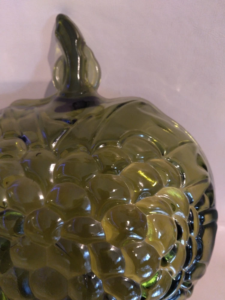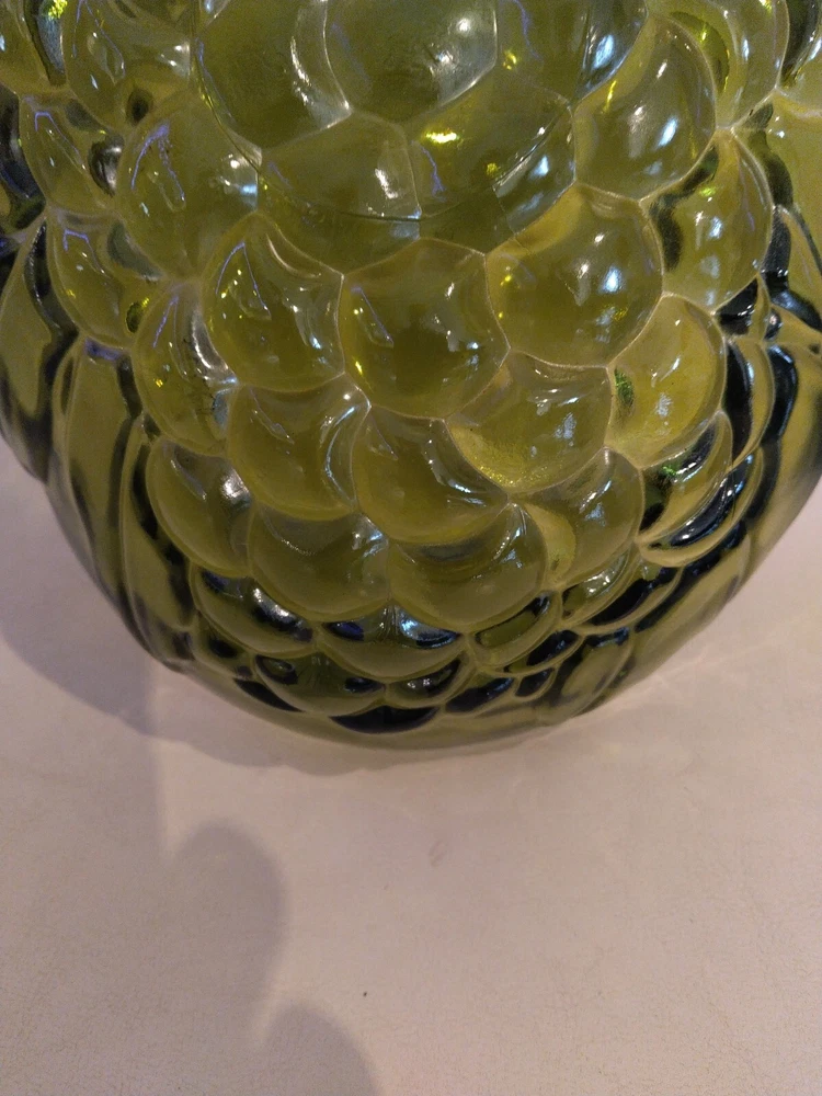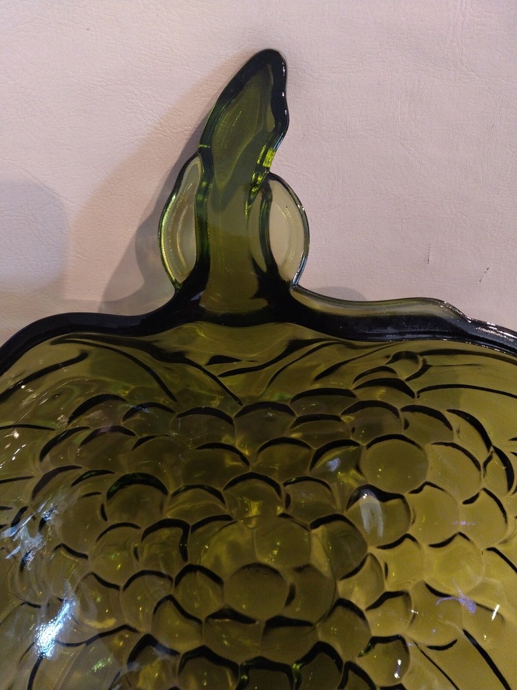 This vintage bowl from Indiana Glass features an abstract shape, with an avocado green glossy finish and an embossed grapes design. The bowl is made of fused glass and measures 13 inches in length, 9 1/2 inches in width, and 3 1/2 inches in depth. It is an antique mid-century modern piece, perfect for all occasions and as a decorative centerpiece. The bowl is an original, licensed reproduction from the Century product line and is hand wash only. This item is a great addition to any collection of decorative cookware, dinnerware, and serveware. One small manufacturer defect in bowl. No cracks, excellent condition. Please see photos. All offers considered. Will combine shipping on multiple items.