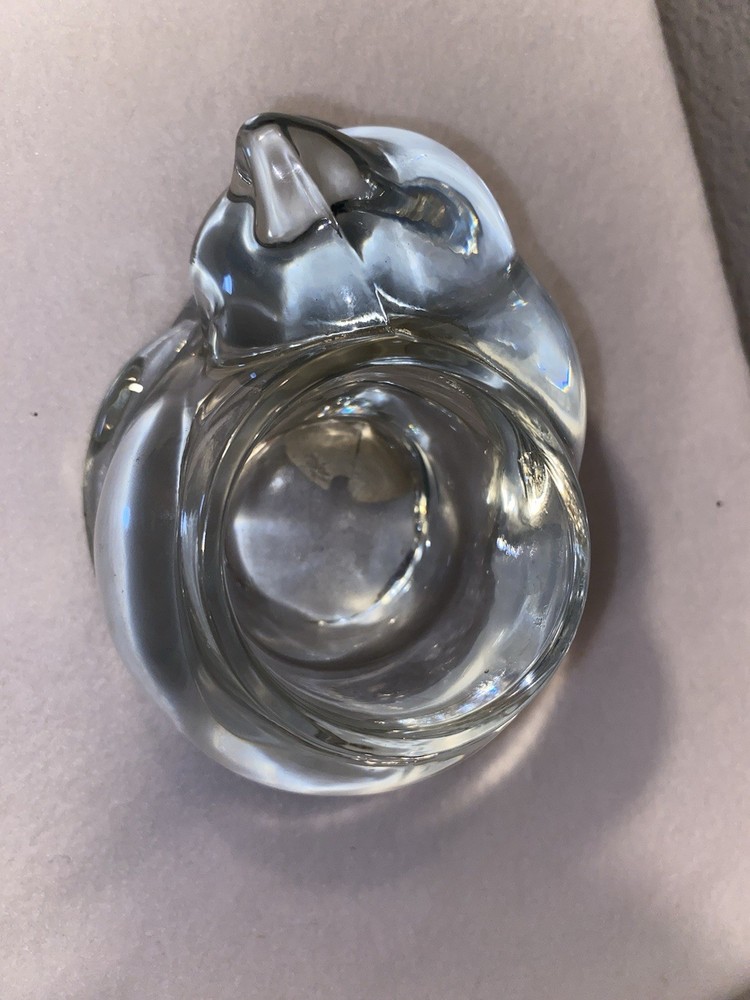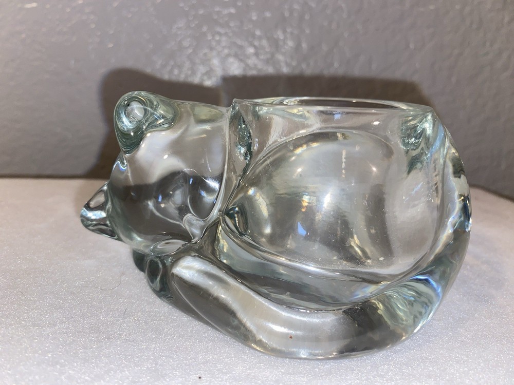 The Indiana Glass VOTIVE TEALIGHT HOLDER is a vintage piece featuring a clear glass design with a sleeping, curled up cat shape. This medium-sized candle holder is perfect for all occasions and is suitable for use with votive candles. Made in the United States in the 1980s by Indiana Glass, this art deco style piece is a charming addition to any decor, especially for cat lovers. The clear finish adds a touch of elegance to the overall design, making it a unique and eye-catching piece for any home.