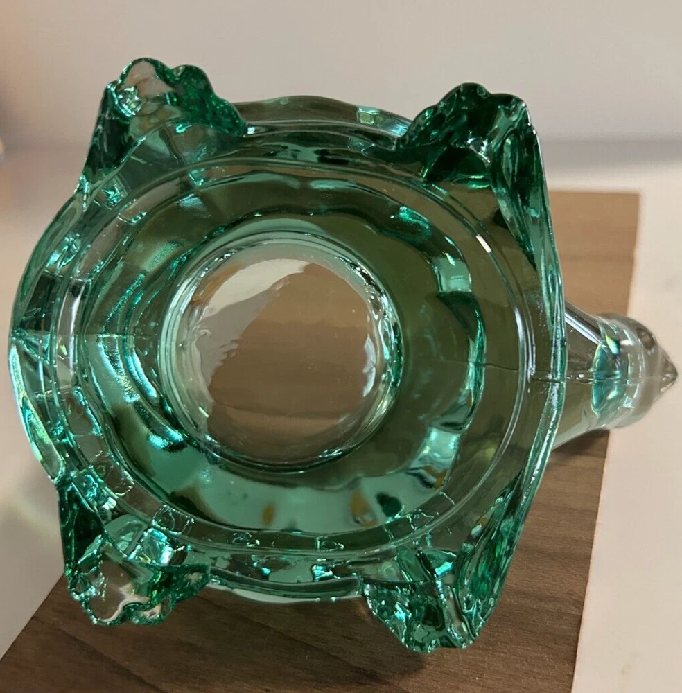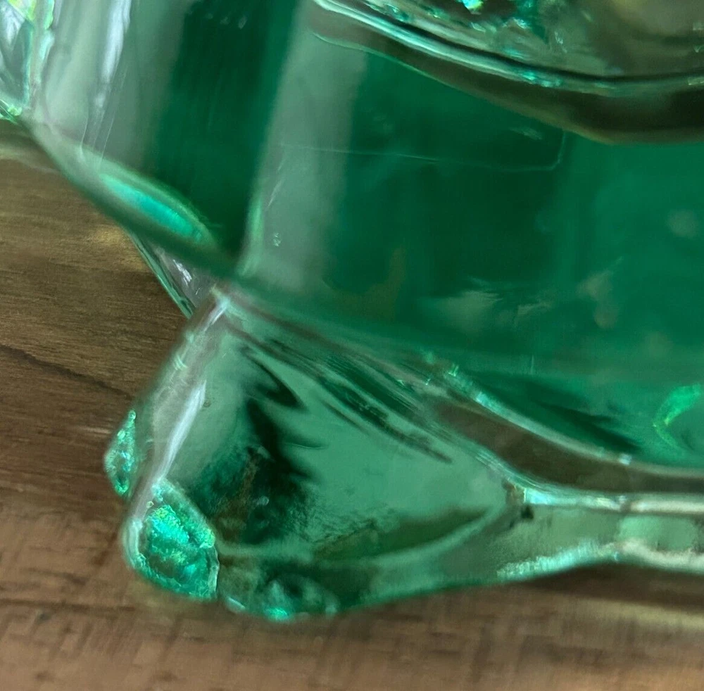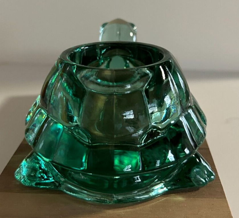 Vintage Indiana Glass Green Turtle Figurine Tea Light Votive Candle Holder 5.5" inches long 3.75" inches wide 2.5" inches tall Beautiful Emerald green color Vintage Indiana Glass Green Turtle Figurine Tea Light Votive Candle, is in great vintage condition. It does have a slight chip on one of its hind legs, which does not take away from how it is displayed. It has never been used. Please review all pictures for proper assessment of its great vintage condition.