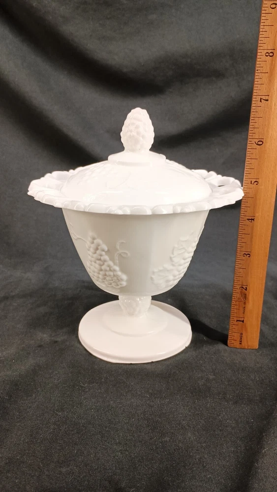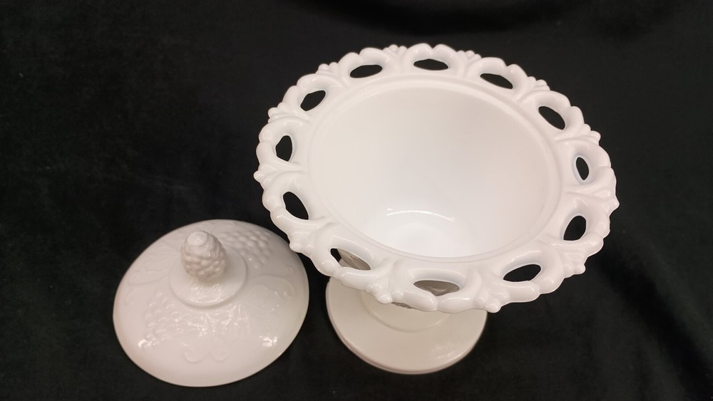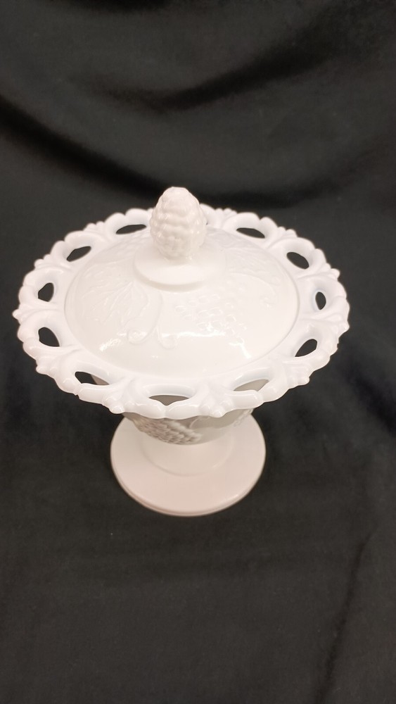 This vintage Indiana Glass compote is a beautiful addition to any collection. The open lace pattern on the milk glass gives it a unique and elegant look. The compote comes with a footed base and lid, making it perfect for serving or displaying. The white color of the glass adds a touch of sophistication to any table setting. Made of high-quality glass, this compote is durable and long-lasting. Ideal for any occasion, this piece is sure to impress. Thank you for visiting my listing today and thank you for your interest in this item! My goal is to have a pleasant transaction resulting in a satisfied customer. I hope any transaction between us leaves you with a feeling of confidence knowing you can trust me and the items I offer here. *Most if not all my listings are set to accept offers. Feel free to send an offer and I will be happy to consider it!! *Please contact me with any questions or concerns and I will be happy to help. *Always examine the photos carefully, and if in doubt, email me with any questions you may have. *Please note that condition statements are offered as a guide only. They will always be somewhat subjective and reflect our opinion, which may not necessarily agree with someone else's opinion. PLEASE READ: I aim to please and I want my buyers to have a positive transaction with me. If you have questions, concerns, or special requests related to any of my items I hope you will contact me so we can work them out to your satisfaction. I sell my items to give you a great item at a decent price while making a little profit at the same time. If you feel the item you are interested in is too pricey do not hesitate to send me a fair offer and I will consider it. My goal is to satisfy your needs and mine so both parties can benefit. SHIPPING: If you prefer a different shipping method or company please contact me and I will do all I can to make that happen. If you have concerns or requests about the packaging of your item contact me and I will do all I can to accommodate them. Shipping costs are based on location in each state or country, the costs always differ. After I have received your payment I will ship your item out within 3 business days or less excluding weekends and holidays. BEFORE PURCHASING & BIDDING: **Please see all the pictures. I do not have great photography skills but I try to get the most accurate photos I can. If you are unsure about something you see in a photo contact me so I can do what I am able to answer your concern about the item. **I cannot stress enough that if you have any questions or concerns please contact me before purchasing and bidding. Communication can solve so much. **As a customer myself, I understand the meaning of customer satisfaction and my goal is to have nothing but satisfied customers. If you are not unsatisfied with your purchase I ask that you please contact me so I can take care of your issue. My goal is for you to be 100% satisfied. INTERNATIONAL BUYERS WELCOMED - PLEASE NOTE: I welcome International buyers! Please be aware that any custom/duties/taxes that the parcel might incur once it is out of the USA are the responsibility of the buyer. Please check with your country's customs office to determine what these additional costs will be prior to bidding or buying. Please refer to the eBay Site Map for more information if needed.