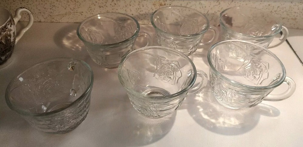 This vintage Celebration Rose Punch Bowl Set with 6 Cups from Indiana Glass is a stunning addition to any collection. The clear crystal glass is beautifully etched with a rose pattern, making it perfect for all occasions. The round shape and vintage original design make it a unique piece that will add character to any home. The set includes a bowl set and 6 cups, making it perfect for serving punch to guests. This pressed glass set is from the 1940s/1950s/1960s and is in excellent condition.