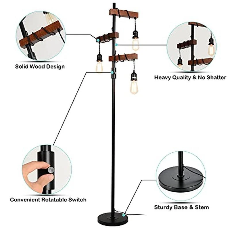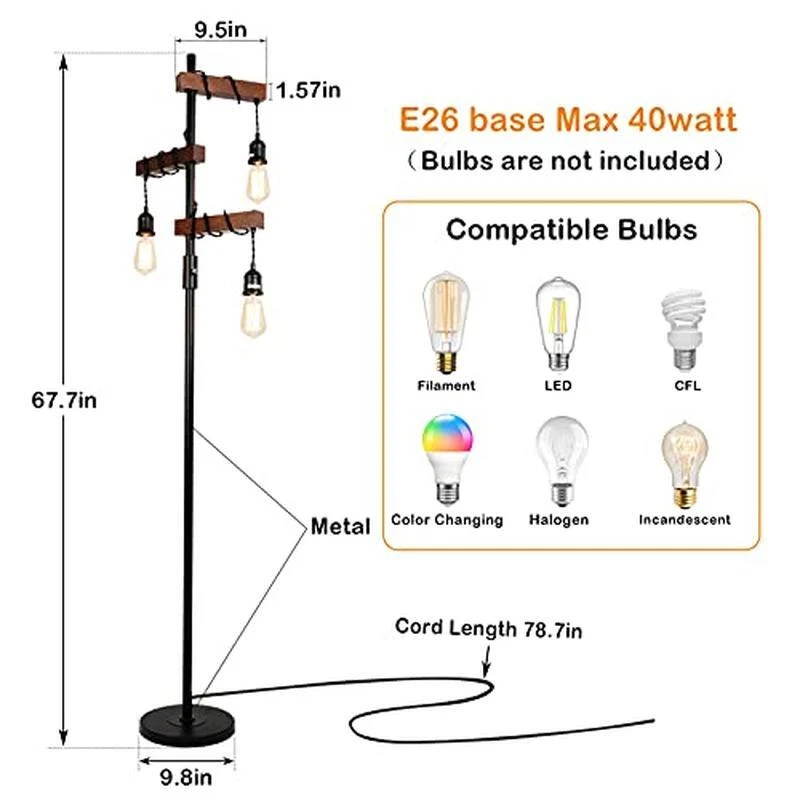 You may also like Compact Computer Desk Open Storage Shelves Study Home Office Workspace Home New 40.5 USD 42.63 USD Free shipping 5% off Handcrafted Rattan Storage Basket Lidded Organizer Decorative Home Wardrobe nEW 85.42 USD 89.92 USD Free shipping 5% off Arched Decorative Wall Mirror Farmhouse Design Living Room Bedroom Bathroom New 119.6 USD 125.89 USD Free shipping 5% off Single-Sided Library Book Cart 3 Slanted Shelves Heavy Duty Mobile Storage New 364.61 USD 383.8 USD Free shipping 5% off Hexagon Aquarium Kit Color Changing LED Bubble Disc Filter Air Pump 1 Gallon New 30.06 USD 31.64 USD Free shipping 5% off High-Quality Lockable Bookshelf Durable Contemporary Home Office Storage Unit 321.77 USD 338.71 USD Free shipping 5% off Metallic Computer Desk W/ Slide-Out Keyboard Tray Lightweight Office Workspace 40.63 USD 42.77 USD Free shipping 5% off Farmhouse Chicken Wire Shelf Rustic Countertop Organizer Kitchen Decor Storage 79.74 USD 83.94 USD Free shipping 5% off Stainless Steel Coffee Percolator 8-Cup Automatic Keep Warm Flavorful Brew New 64.82 USD 68.23 USD Free shipping 5% off Vintage Decorative Metal Storage Boxes Set Home Organization Farmhouse Touch New 62.82 USD 66.13 USD Free shipping 5% off Set 3 Handwoven Hyacinth Storage Baskets Removable Lid Insert Handles Organizer 69.81 USD 73.48 USD Free shipping 5% off Industrial Wire Shelving Kit 4Tier Heavy Duty Adjustable Storage Rack Silver New 141.34 USD 148.78 USD Free shipping 5% off About this item 【3-Heads Provide 360° Lighting】3 lights of this industrial floor lamp lie in 90° vertical separately on the tree lamp, no lightness angle. The multi-head design provides a great solution to the harsh brightness of traditional fixtures so that you feel relaxed. Under the light given off by this tall floor lamp, you can fully enjoy the comfortable ambience. 【Well-made & Sturdy Base】Our free standing lamp is made of superior metal from top to the base to ensure it keep standing steadily even on the carpet. The base of the floor standing lamp is made of metal which is not flimsy, heavy enough make sure children and pets' safety when they are playing in the room. 【Retro Appearance】With design of the elegant, simple black metallic construction make the tall tree lamp well matched to styles of industrial, vintage and farmhouse furnitute. The special solid wood design makes it ideal for multiple styles of decoration, such as minimalist, traditional and mid-century. 【Easy Assemble and Use】This 67. 7 inches tall floor lamp is easy to assemble without any tools, you just need to screw all the parts together via following the instruction on the page; 78. 7in cord and its compact base allow you to move the rustic floor lamp in any corner of your room, sliding it behind a sofa or place it beside a cabinet ; Besides, combined with the rotate switch, you can easily spin the floor lamp on or off with your hands; Easy to assemble and use, makes your life much easier. No Hassle to Return. › product details Finish Type Antique Base Material metal,wood Bulb Base E26 Product Dimensions 9. 8"D x 9. 8"W x 67. 7"H Lamp Type LED, Edison bulb, Incandescent,Halogen (Bulb not included) Versatile Wicker Storage Trunk Collapsible Home Office Dorm Living Room Rattan 151.65 USD 159.63 USD Free shipping 5% off Collapsible Storage Bins W/ Lids Clear Window Stackable Durable Fabric 3 Set New 54.84 USD 57.73 USD Free shipping 5% off Nesting Wooden Crates Rustic Storage Farmhouse Home Organization Nested Set 3 54.76 USD 57.64 USD Free shipping 5% off 360° Rotating Jewelry Box 5 Drawers Organizer Glass Window Vertical Storage New 79.78 USD 83.98 USD Free shipping 5% off Night Stand W/ Charging Station Small Dresser 4 Drawers Multi-Use Storage Table 59.81 USD 62.96 USD Free shipping 5% off Bamboo Storage Box W/ LED Light Lockable Organizer Lifting Handle Removable Tray 59.75 USD 62.89 USD Free shipping 5% off Handwoven Rattan Storage Basket W/ Lid Square Washable Durable Stackable Brown 159.58 USD 167.98 USD Free shipping 5% off 3-Tier End Table Compact Nightstand Bedside Storage Table Plastic Poles New 27.06 USD 28.48 USD Free shipping 5% off Wooden Jewelry Box Organizer Lockable W/ Mirror Drawers Compartments Women New 109.7 USD 115.47 USD Free shipping 5% off Bookshelf W/ Storage Cabinet 2 Shelves Open & Closed Durable Organizer Home New 46.01 USD 48.43 USD Free shipping 5% off Modern Marble Decorative Storage Boxes Set 3 Keepsake Container Gold Handle New 84.65 USD 89.11 USD Free shipping 5% off Cabinet Drawer Unit Wood Kenner Home Office Reclaimed Wood Rolls Easily Durable 155.75 USD 163.95 USD Free shipping 5% off