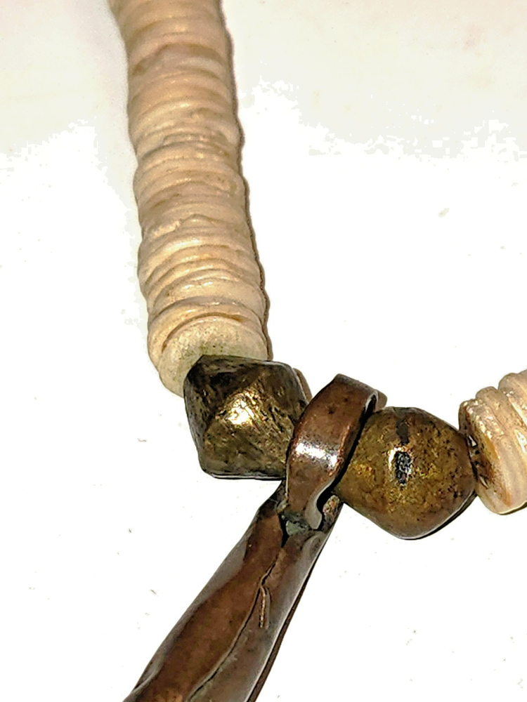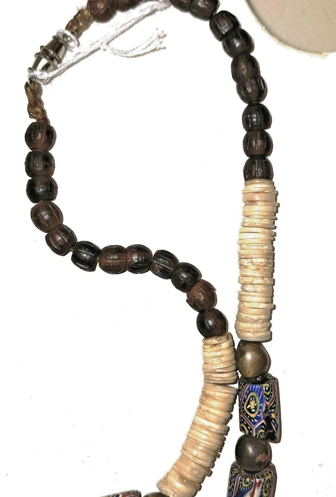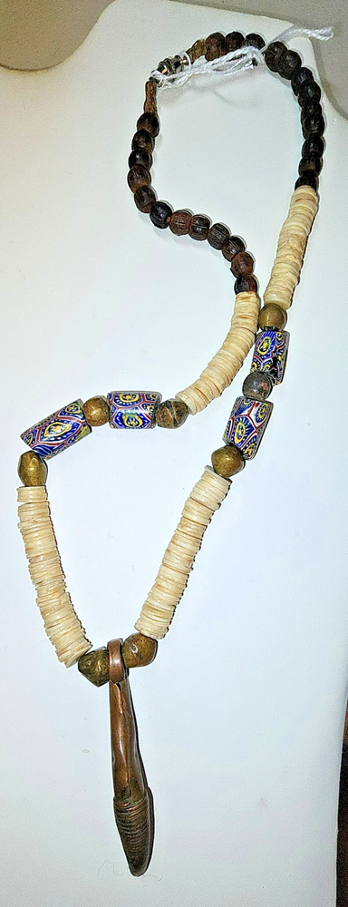 This necklace is a one of a kind, original vintage piece of jewelry that showcases rare Millefiori trade beads in a vibrant multicolor design along with handmade brass and bronze bicone beads and a centerpiece fertility amulet that drops 2 1/2 inches from the center of the 18 inch necklace. The necklace is crafted with shell disks, very intricate millefiori trade beads from Murano, and the handmade accents. The millefiori beads were made in a very intricate bundled fashion with deep blue, coal yellow, shite and brick red on black cores. The ends were ground to fit in a circlet and one has a chip. This was likely a Baule man's necklace - a standout piece of craftsmanship with a rich history and cultural significance. Ground Advantage; add other small things that I can fit in the same box and pay no extra for postage.