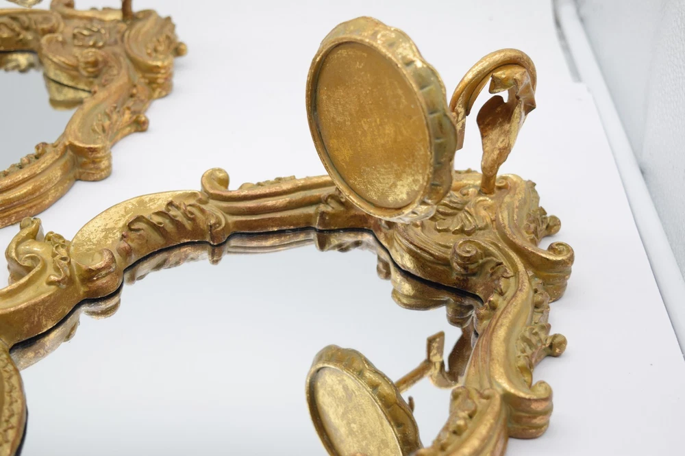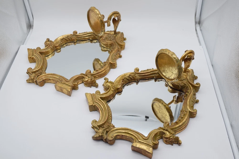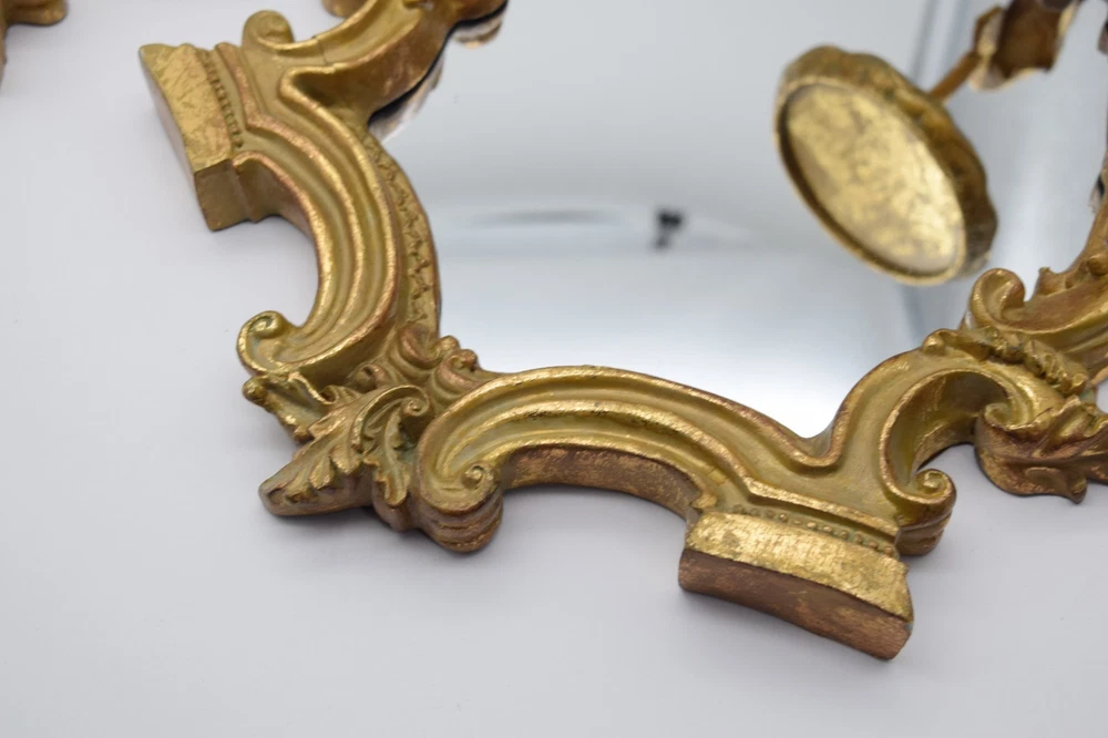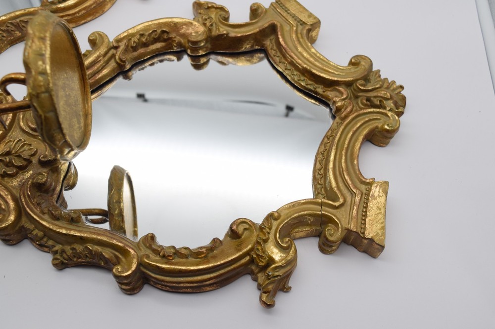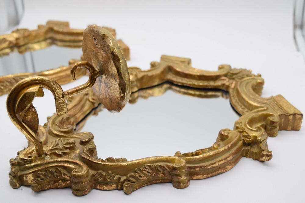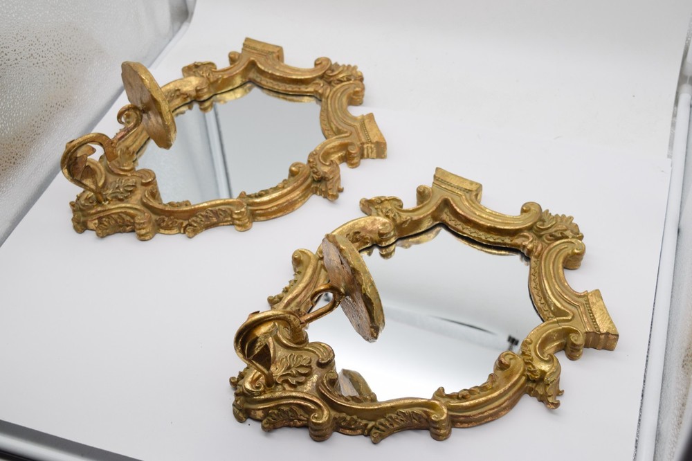 Vintage Italian Gilt Gold Wall Mirror Sconce Candle Holder Pair Baroque Decor