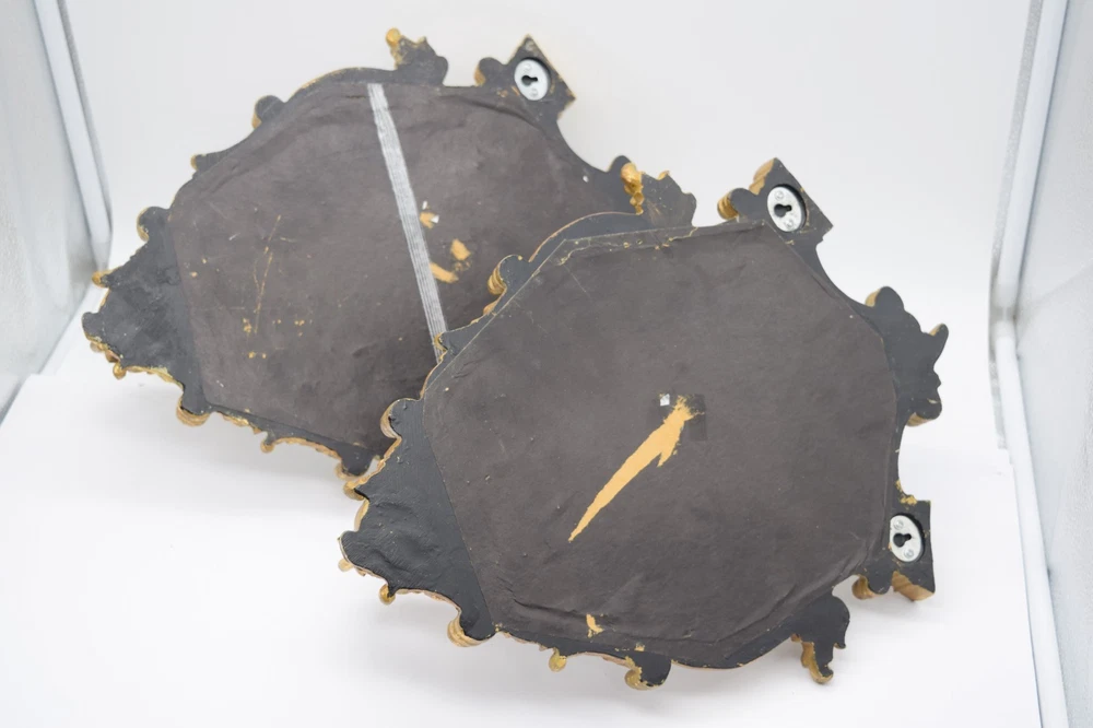 Striking vintage pair of Italian-style gilt gold wall mirror sconces featuring ornate baroque scrollwork and integrated candle holders. Highly decorative pieces with strong Hollywood Regency / vintage European aesthetic—perfect for wall decor, entryway, or accent lighting display. Mirror centers reflect beautifully and the sculptural frames give a high-end antique look. Brand: Unmarked Type: Wall Mirror Sconce Candle Holders (Pair) Material: Resin/Composite w Gilt Finish Style: Italian Baroque Hollywood Regency Mounting: Wall mount (hardware on back) Measurements: 14.5"x11.5" each Weight: approx 3 lb each Condition: Good vintage condition overall with visible wear to gilt finish including rubbing and patina. One piece has a noticeable crack in the frame (shown in photos) but remains structurally intact. Mirrors are in good shape with minor age wear. 📦 Shipping Information: We use eBay’s Calculated Shipping for all our items. Shipping costs are automatically determined by eBay based on the weight and dimensions of the package, as well as the buyer’s location relative to Connecticut . Please note, we do not control these rates and make no additional profit on shipping fees. Each piece weighs approximately 3 lb , and due to their size and careful packing requirements, the total shipping weight will be higher to ensure safe delivery.