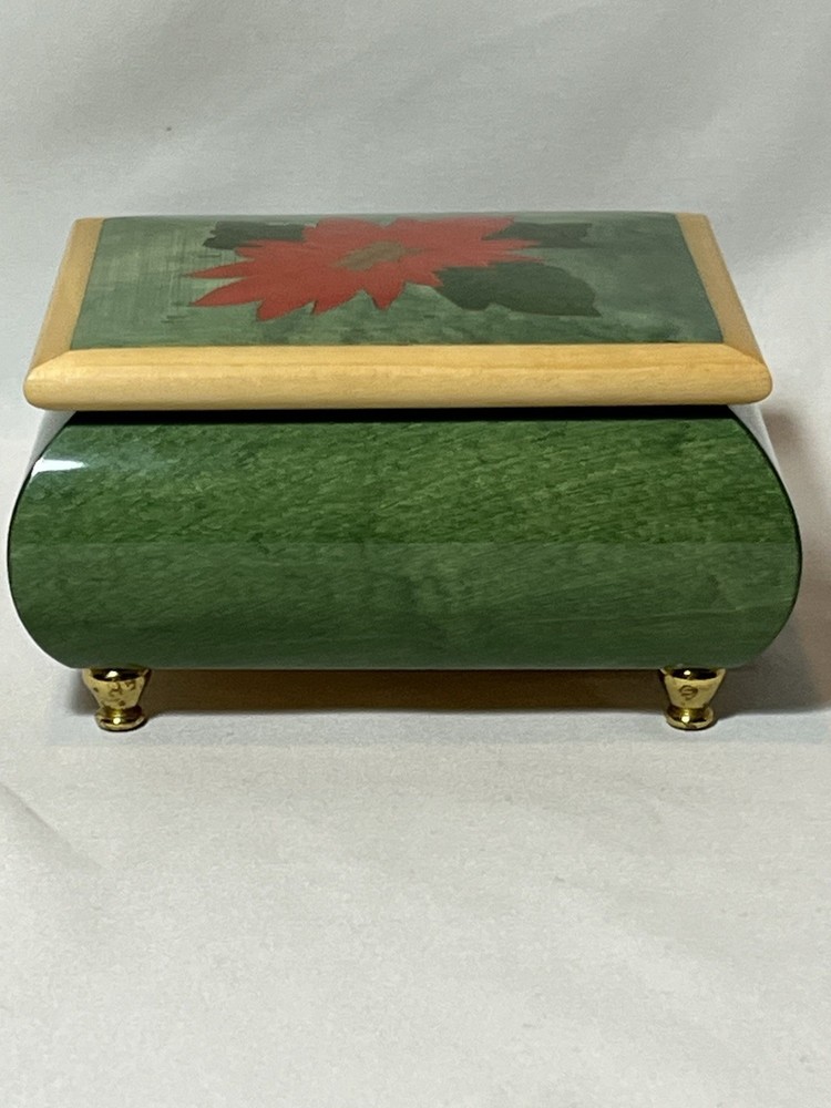 Vintage Italian Suede Wood Jewelry Box in Emerald Green with Poinsettia Design