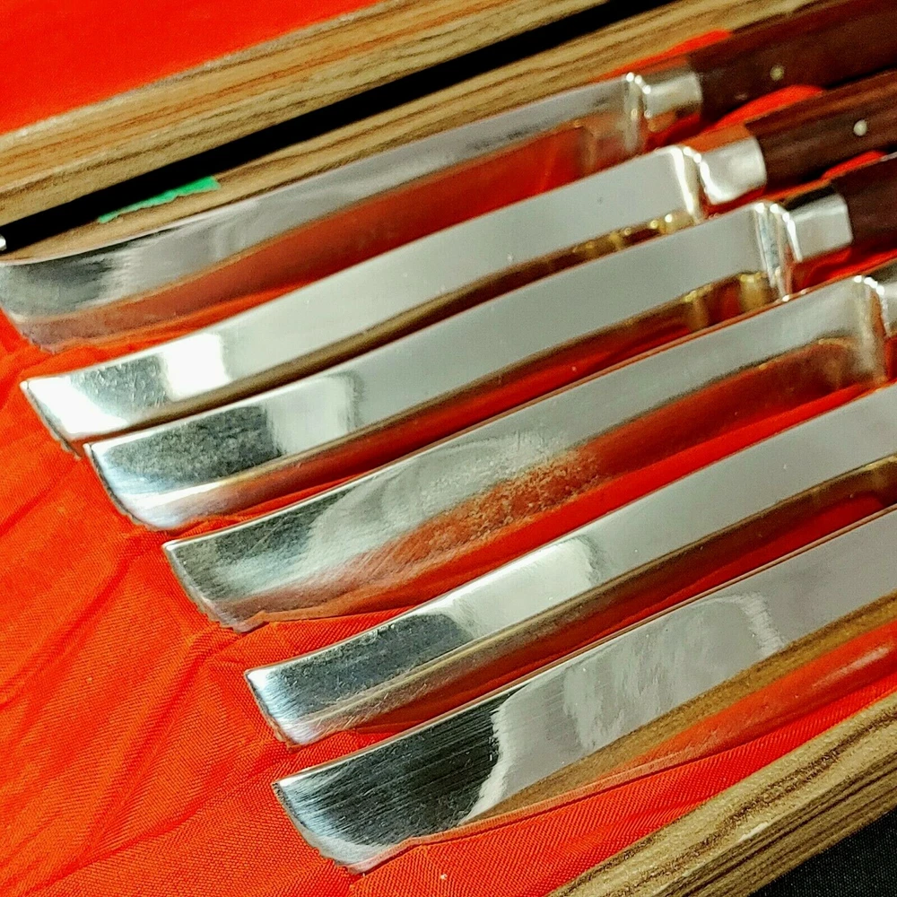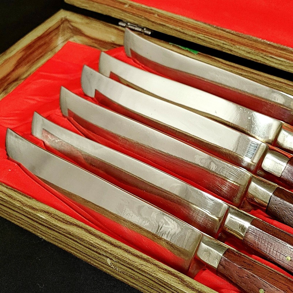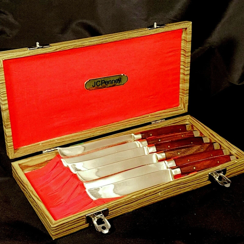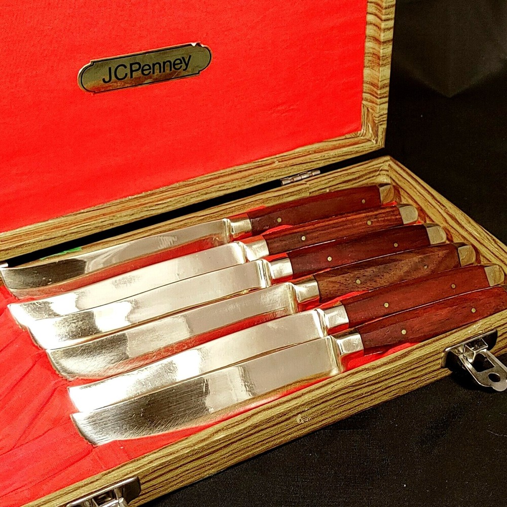 Vintage JCPenney Boxed Set of 6 Brass and Wood Steak Knives Solid Tang Double Rivet Excellent condition of all, some tarnish which can be easily removed. This set is beautiful. Good weight, super sharp, serrated edge, beautiful solid brass blade with what appears to be mahogany handles. The knife itself is a solid piece of brass including the hilt , tang and end piece. These are in near mint condition. Knife length is 19.5 cm (7-3/4" appx) Blade width 2 cm (appx 3/4") Handle width 14 x 14 mm (appx 5/8") The box is faux wood with red lining. I could not find out when these were made, but judging from the box style, I would say 1950s to 70s roughly. Likely a special edition set. Ships FAST from Canada with Tracking Have a Great Day!.USA buyers save with currency exchange on purchase.We ship UPS, Canada Post and Fedex as postage requires. Thank you for being a valued customer!