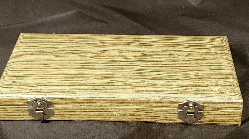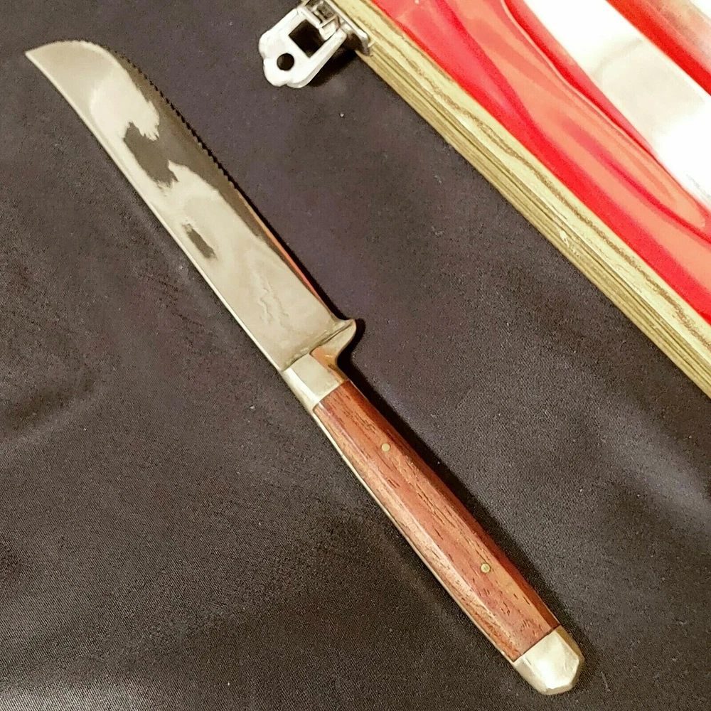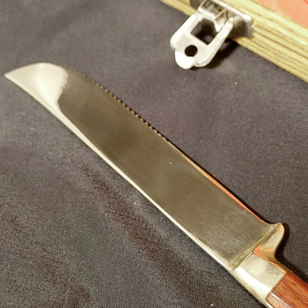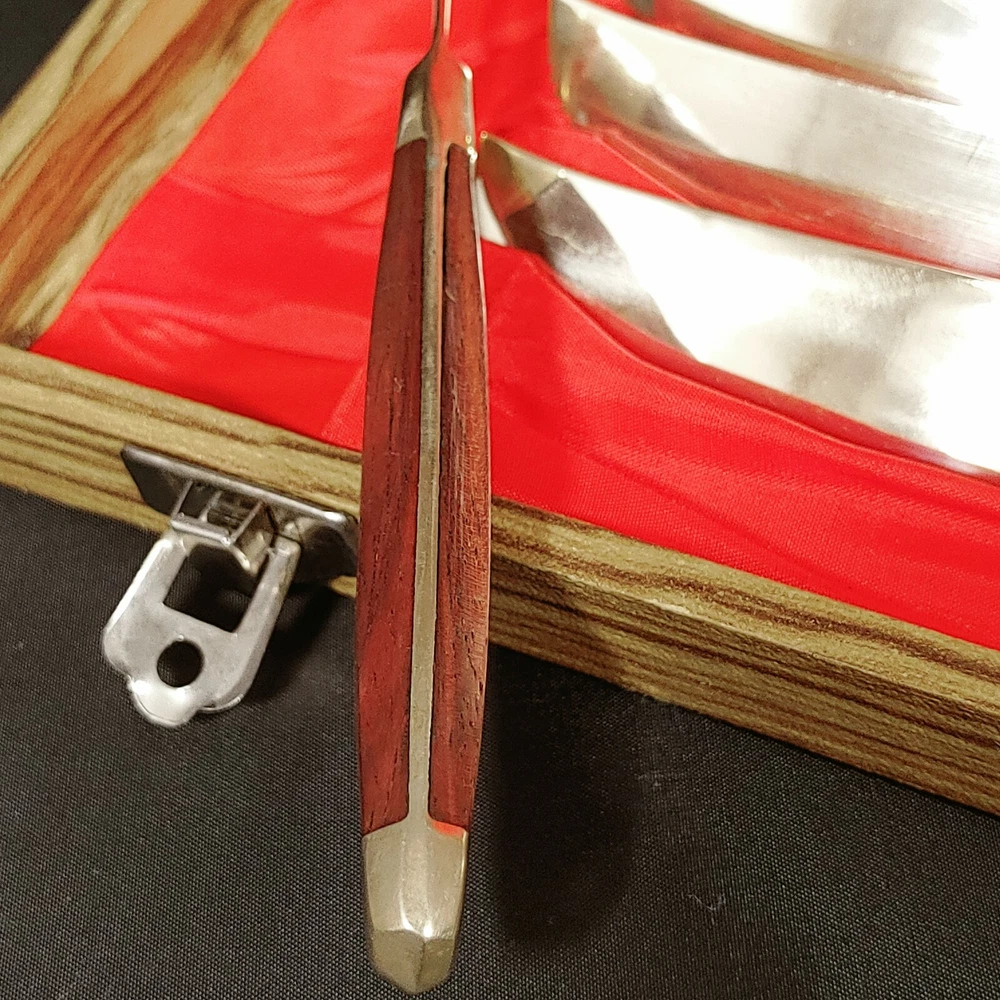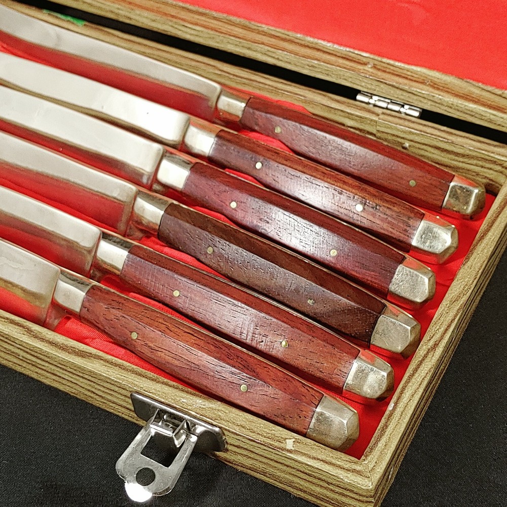 Vintage JCPenney Boxed Set of 6 Brass and Wood Steak Knives Solid Tang Double Rivet Excellent condition of all, some tarnish which can be easily removed. This set is beautiful. Good weight, super sharp, serrated edge, beautiful solid brass blade with what appears to be mahogany handles. The knife itself is a solid piece of brass including the hilt , tang and end piece. These are in near mint condition. Knife length is 19.5 cm (7-3/4" appx) Blade width 2 cm (appx 3/4") Handle width 14 x 14 mm (appx 5/8") The box is faux wood with red lining. I could not find out when these were made, but judging from the box style, I would say 1950s to 70s roughly. Likely a special edition set. Ships FAST from Canada with Tracking Have a Great Day!.USA buyers save with currency exchange on purchase.We ship UPS, Canada Post and Fedex as postage requires. Thank you for being a valued customer!