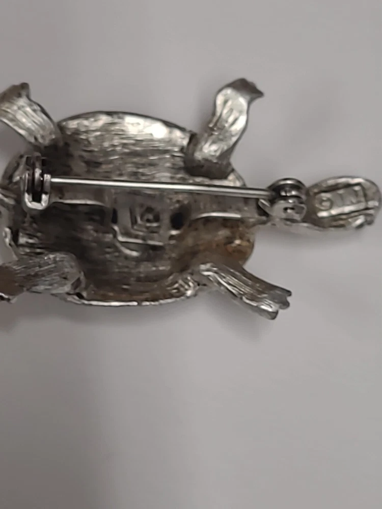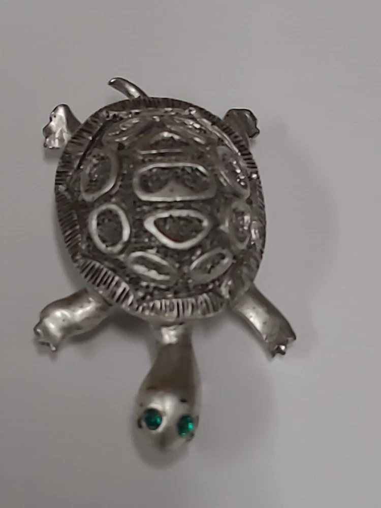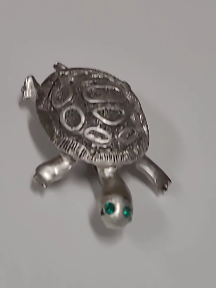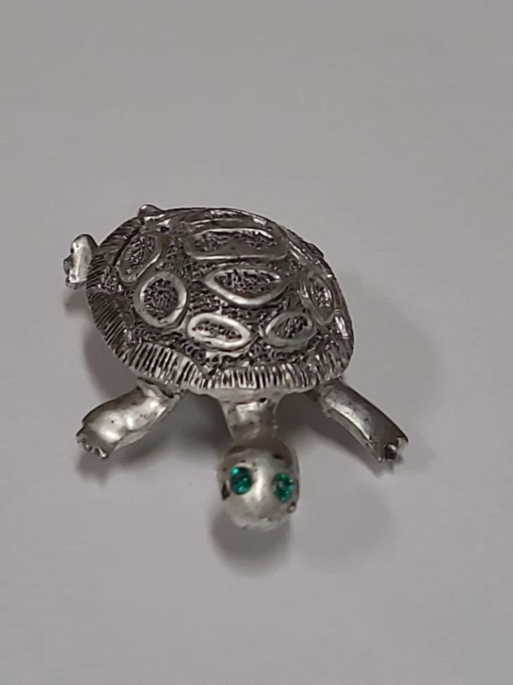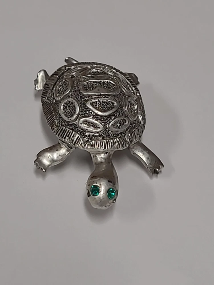 This vintage brooch from J&J features a charming turtle design with green rhinestone eyes. The silvertone metal adds a touch of elegance to any outfit. It is signed by the designer and is ideal for special occasions such as Christmas, anniversaries and birthdays. The piece is perfect for collectors of vintage and antique jewelry, with its unique animal and insect theme.
