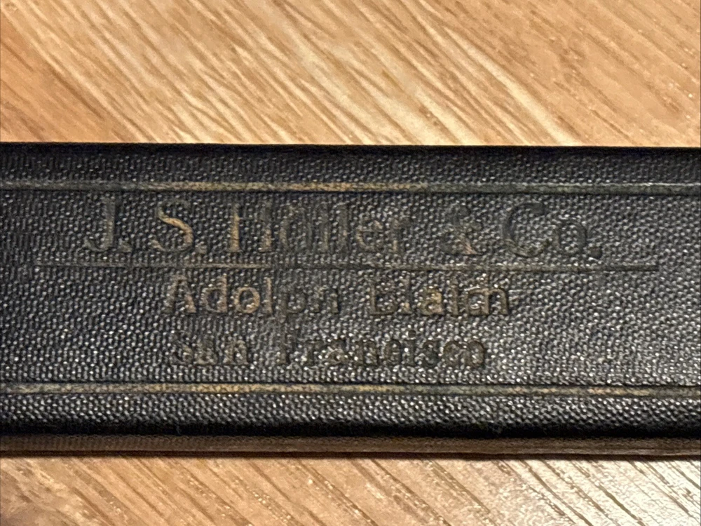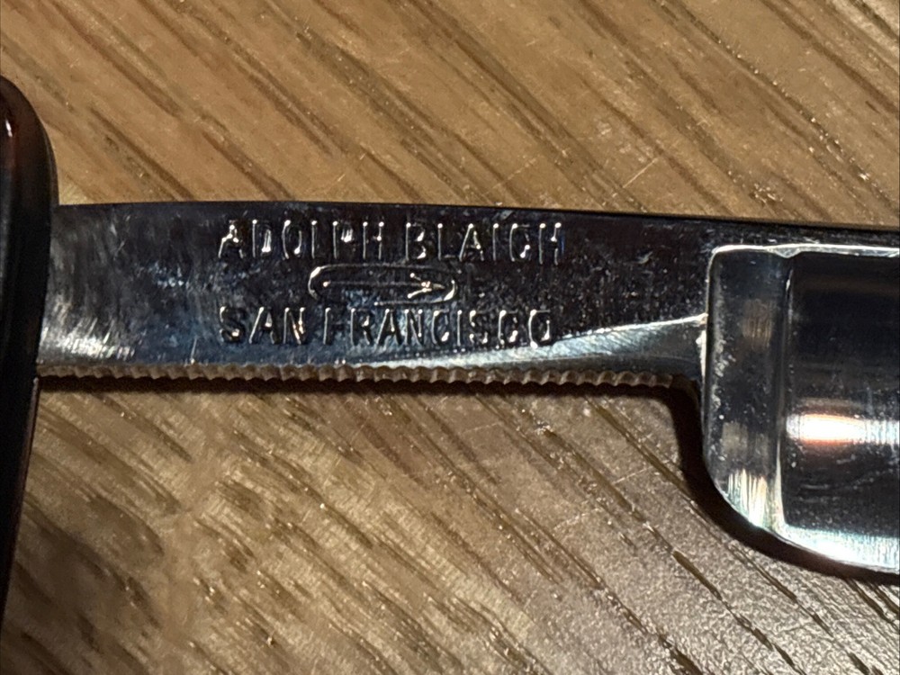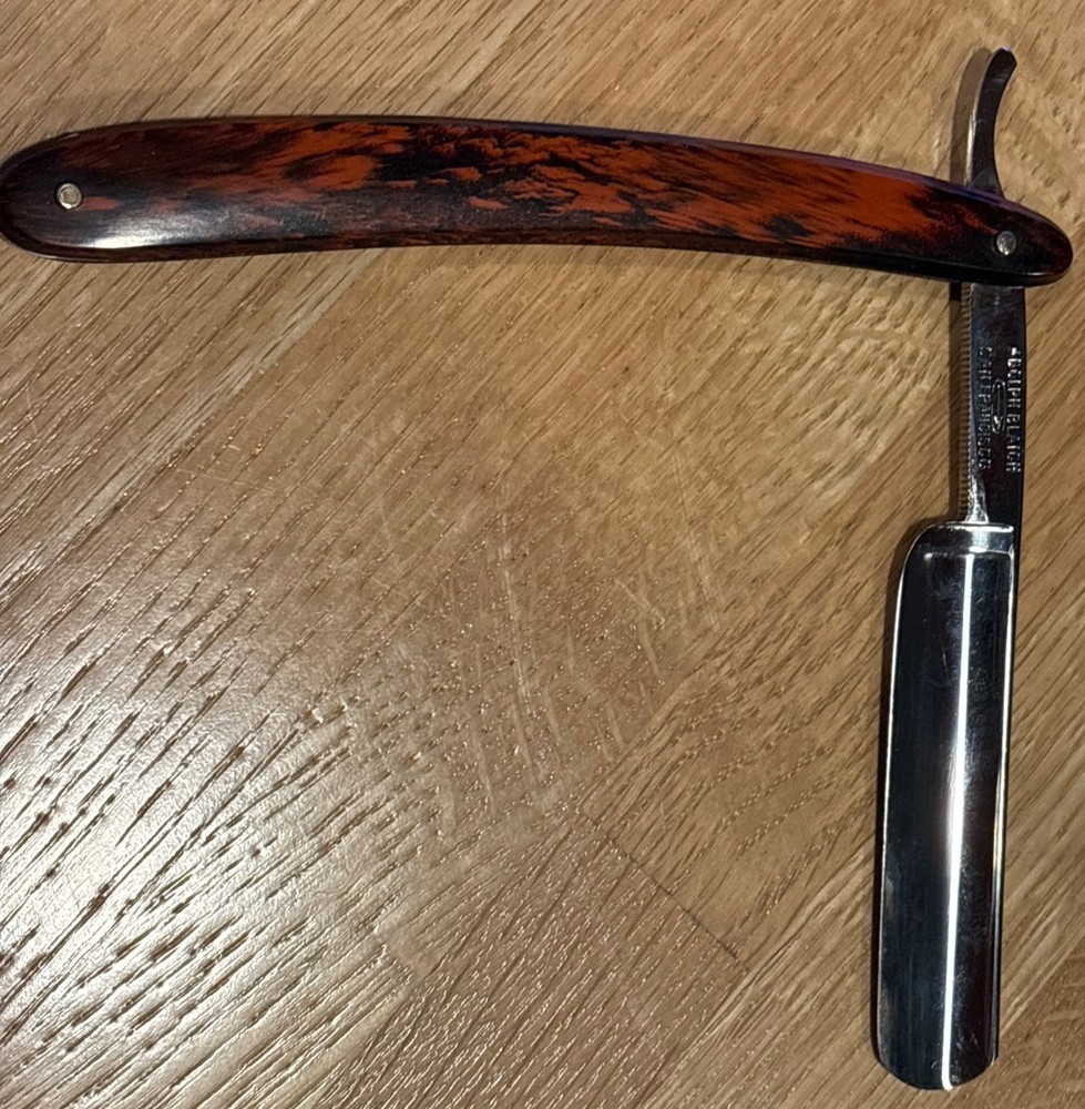 Vintage J.S. Holler & Co Straight Razor with Original Case Antique straight razor made by J.S. Holler & Co. of Solingen, Germany, one of the classic and respected razor makers of the late 19th and early 20th century. The razor comes with its original fitted case, stamped: “J. S. Holler & Co. – Adolph Blaich – San Francisco – Trade Mark” Adolph Blaich was the U.S. importer/distributor, indicating this razor was manufactured in Germany and sold in the American market. Details: • Manufacturer: J.S. Holler & Co. (Solingen, Germany) • Distributor: Adolph Blaich, San Francisco • Era: Circa 1890–1915 • Blade: Steel straight razor, full hollow grind • Scales: Faux tortoiseshell (celluloid) • Case: Original hard case with intact markings Condition: • Blade intact with no visible cracks or chips • Scales are solid and attractive • Case shows normal wear consistent with age • Razor has not been cleaned or polished, preserving originality This razor would make an excellent addition to a straight razor collection, barber memorabilia display, or could be professionally restored for shaving use. Great find!