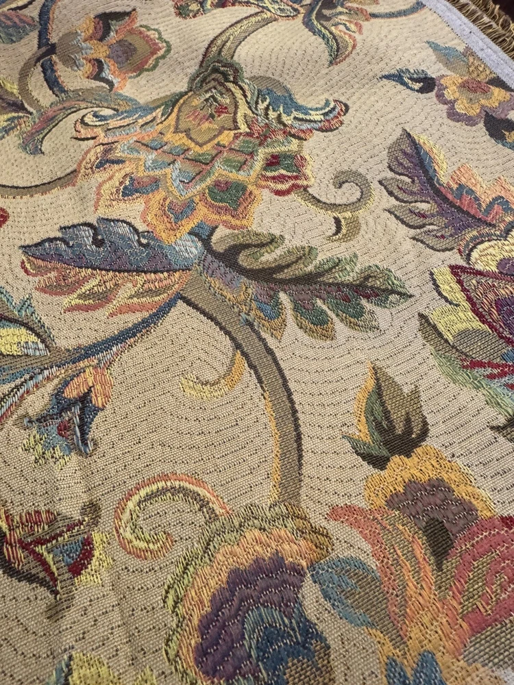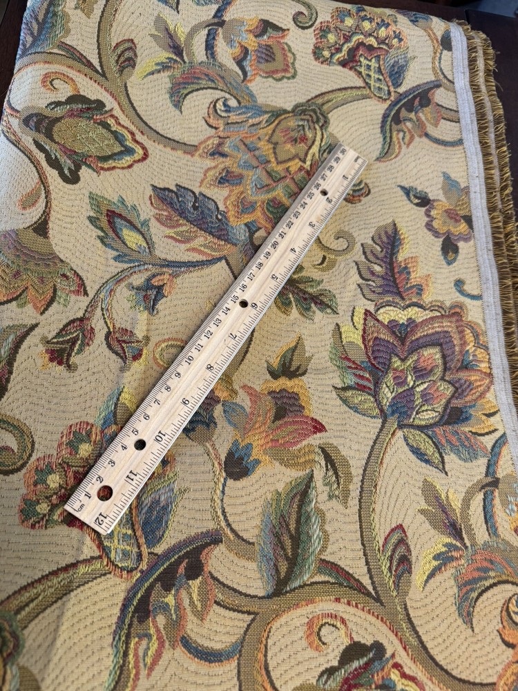 This vintage Jacobean floral upholstery fabric is a classic piece with an antique vibe, perfect for Victorian cottage interiors. The heavy fabric features a multicolor floral pattern, adding a touch of botanical charm to any space. Measuring 90 x 55 W inches, this original United States-made fabric is ideal for various occasions and exudes a timeless style that will enhance the aesthetic of any room. Please see all photos Smoke Free Home ALWAYS happy to COMBINE for SHIPPING SAVINGS$$$