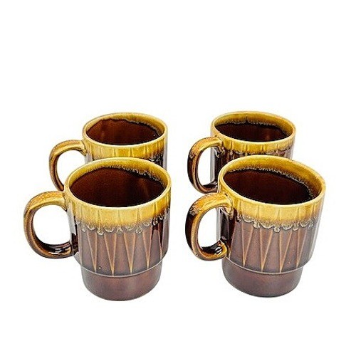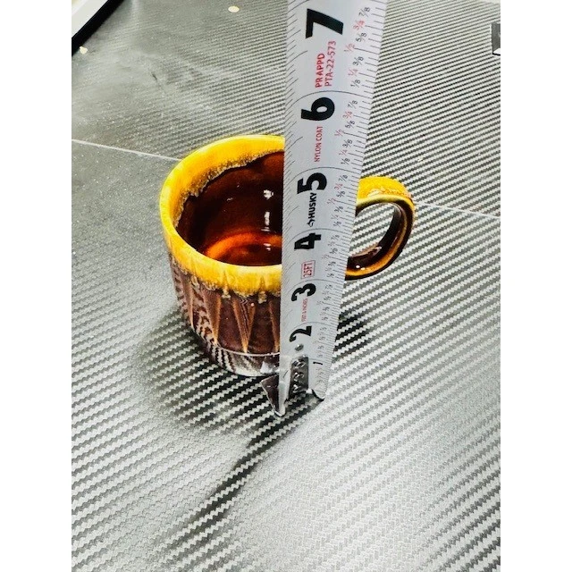 Vintage drip glaze coffee mugs in a rich brown and ochre color palette, crafted in Japan. These mid-century modern style mugs feature a textured, geometric relief pattern around the base and a classic glossy drip glaze along the rim. The stackable design makes them practical for storage while adding a retro aesthetic to any kitchen or coffee bar. Each piece is marked "Japan" on the bottom, showcasing quality vintage stoneware craftsmanship. Measurements: • Height: 4" • Rim Diameter: 3" • Total Weight (Set of 4): 3lb 11.4oz