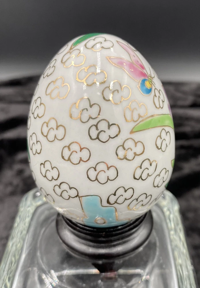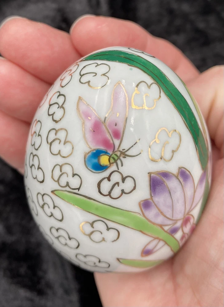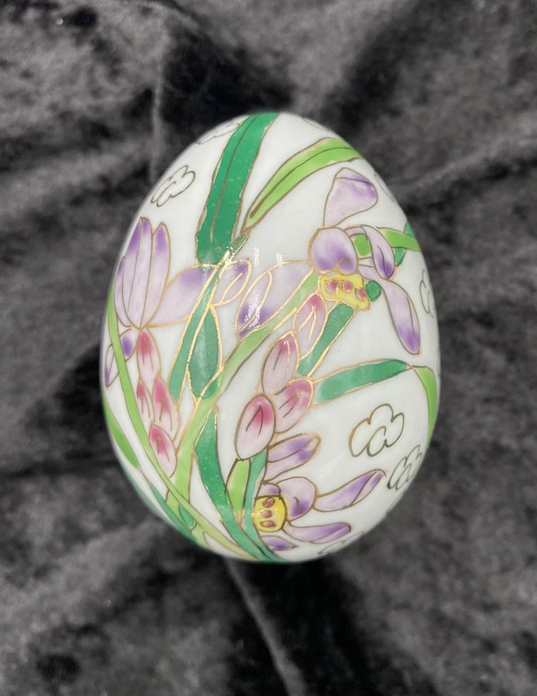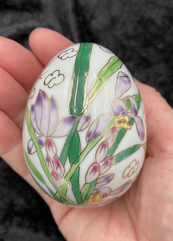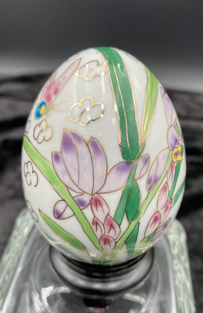 This vintage Japanese porcelain egg is a beautiful addition to any collection. The egg is hand-painted with delicate purple irises, green leaves, and a lovely floating butterfy, all surrounded by, and highlighted with, gold gilt. The egg stands at 2.7 inches tall and measures 2.1 inches in width. The egg comes with a wooden three-footed stand, adding to its charm and ease of display. Its weight is 3.2 ounces with the stand, making it easy to move and display in any room of your home. This is a beautiful egg in excellent condition. There are no chips, cracks or signs of wear. I have another egg of similar design, but with pink lotus flowers. If you would like both, I am happy to combine shipping and give you the savings. Please see my listing at 2cuddlebugs24. Thank you!