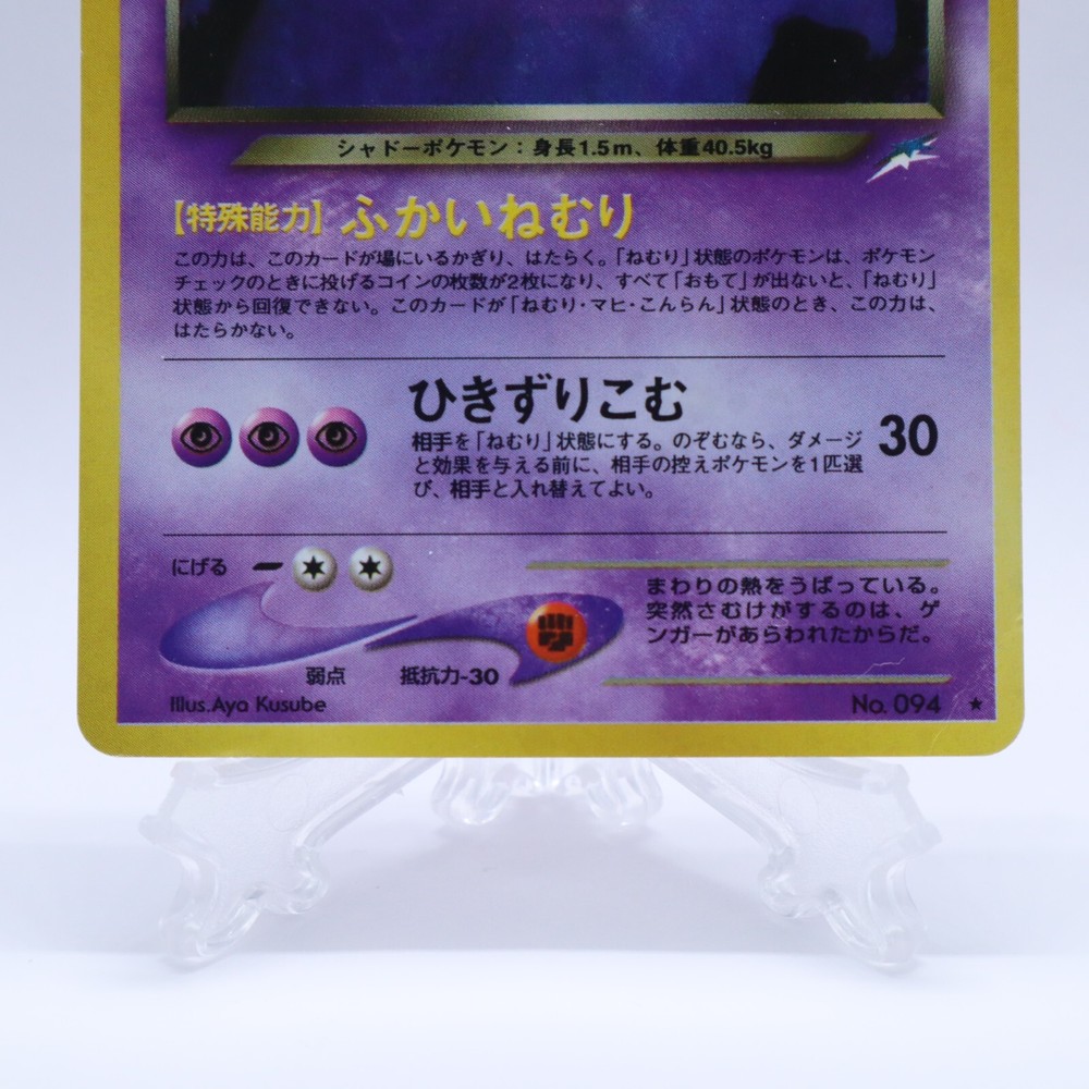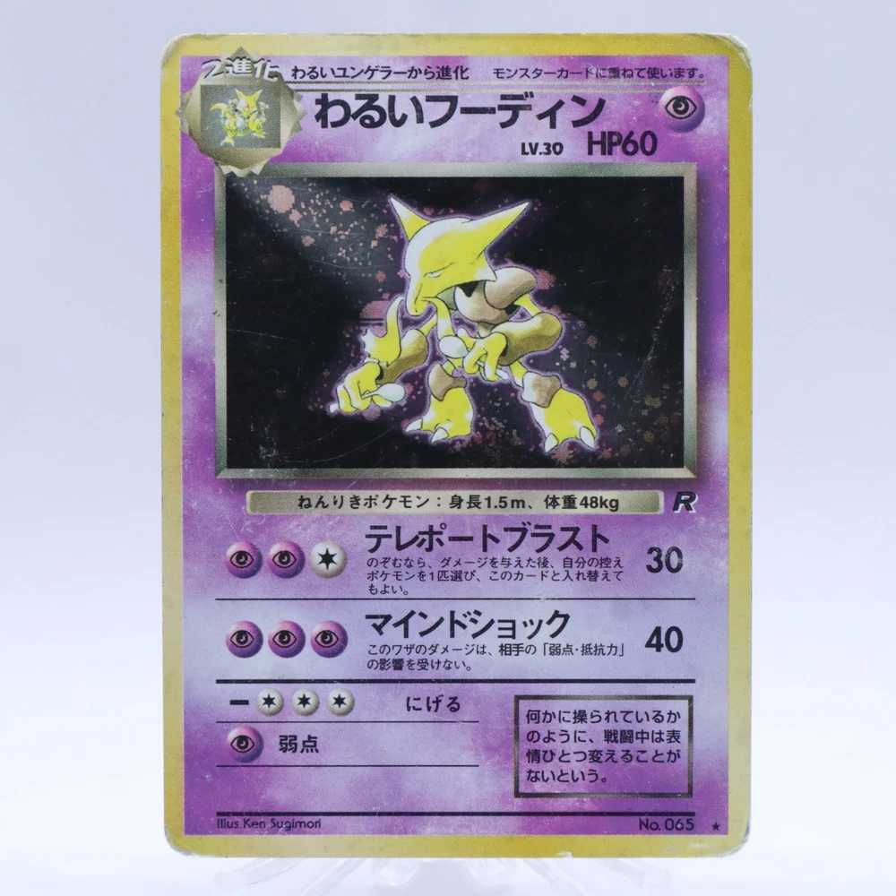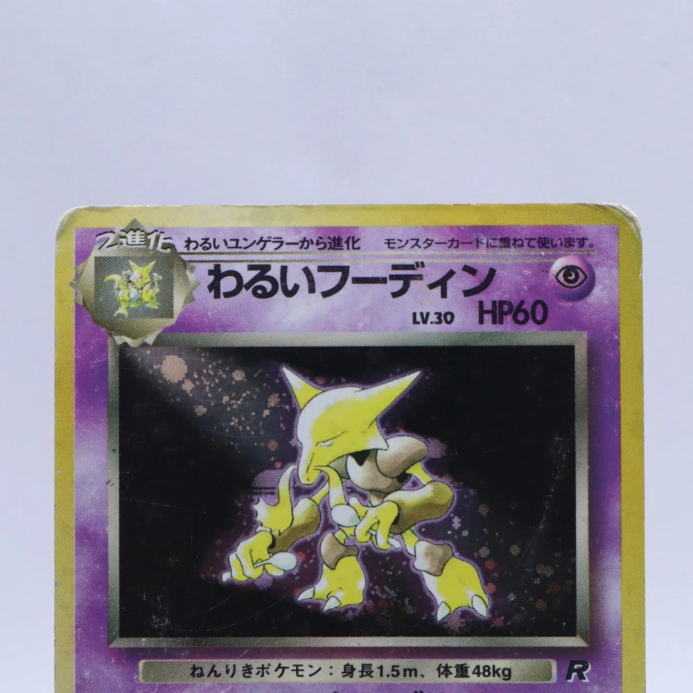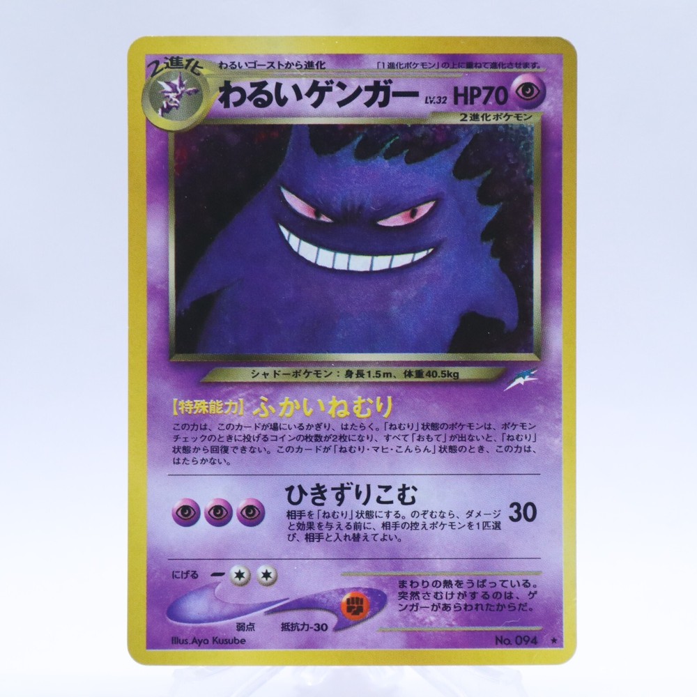 Attribute/MTG:Color: Dark, Multi-Color Number of Cards: 6 Card Number: 094 Age Level: 4+ Game: Pokémon TCG Material: Paper Vintage: Yes Card Condition: Heavily Played (Poor) Country/Region of Manufacture: Japan Year Manufactured: 1997 Illustrator: Aya Kusube Set: Team Rocket Card Name: Dark Gengar Features: Holo Card Size: Japanese Language: Japanese Character: Alakazam, Dugtrio, Gengar, Golbat, Slowbro Finish: Holo Autographed: No Manufacturer: Nintendo Card Type: Pokémon
