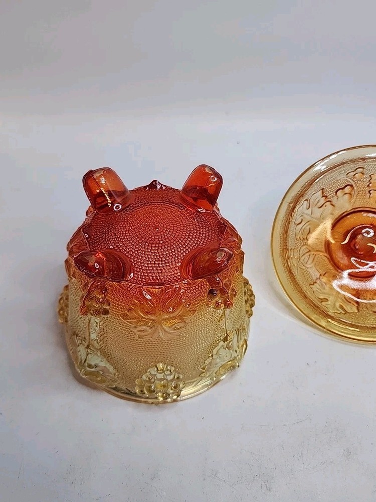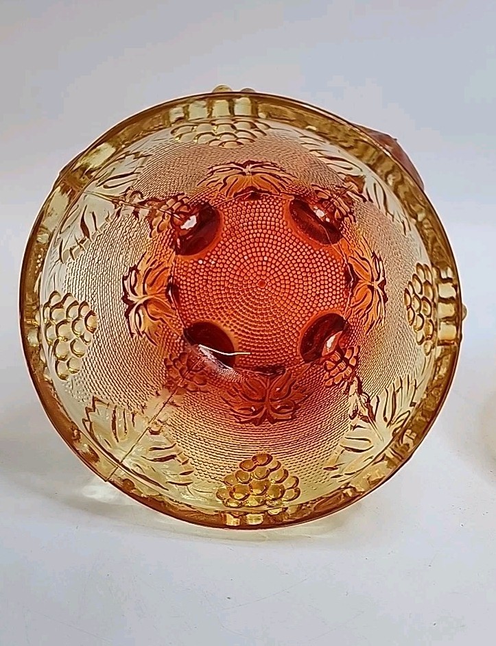 The Vintage Jeanette 1960s Amberina Grapes & Vine Footed Candy/Trinket Dish with Lid is a decorative collectible made of glass. Featuring a beautiful amberina color and a design of grapes and vines, this original piece from the 1960s adds a touch of retro charm to any space. The footed design and lid make it a unique and functional addition to a collection of decorative items, showcasing the craftsmanship and style of the Jeanette brand during this time period. No chips or cracks. Has some color fading on bottom of feet due to rubbing on surface probably