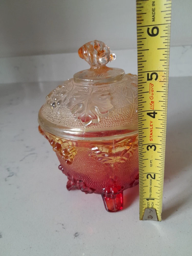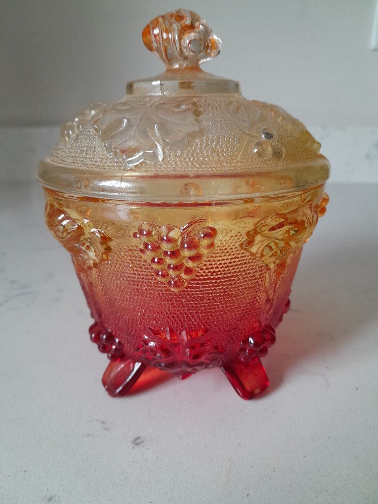 This vintage Jeanette candy dish is a round red glass compote with a lid. It is American-made, dating back to the 1960s. The pressed glass technique gives it a unique appearance, and it has a capacity of 1 cup. Its amberina color adds to its vintage appeal, making it a charming addition to any collection. Some color wear on lid