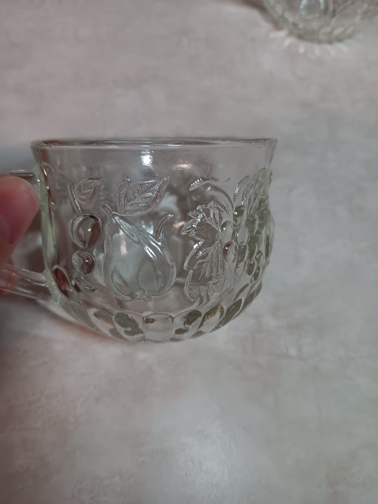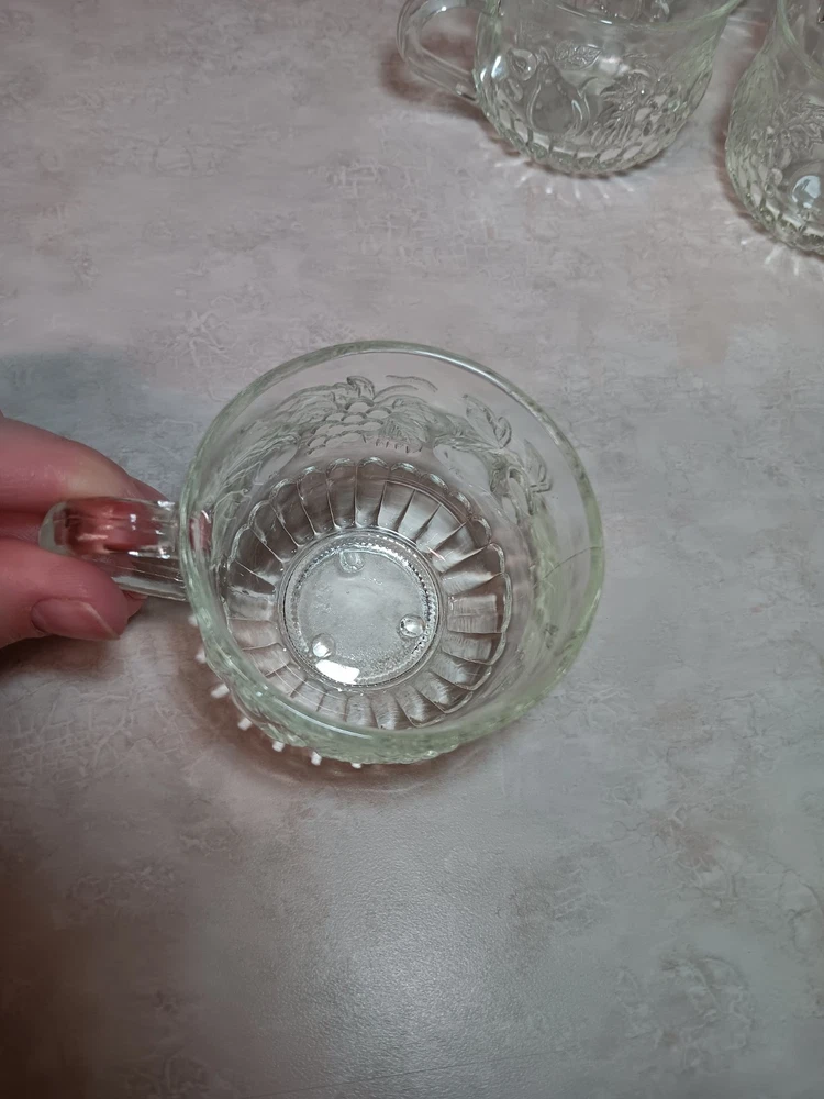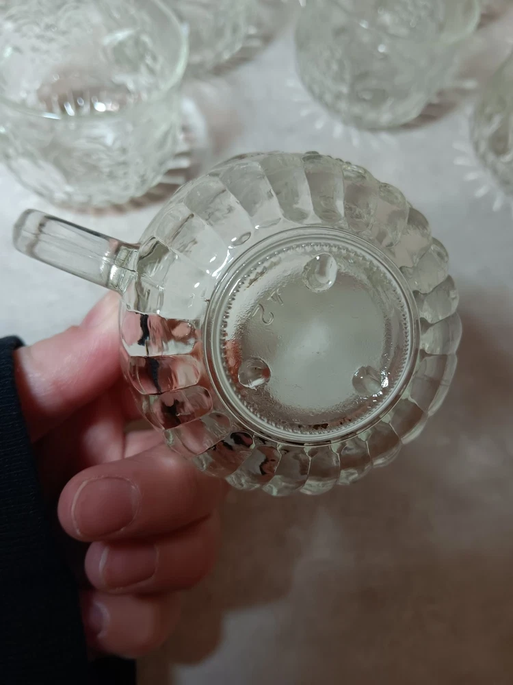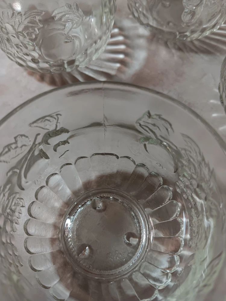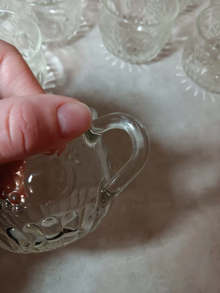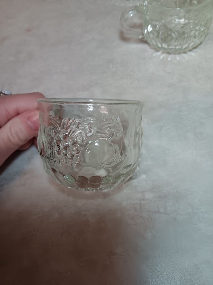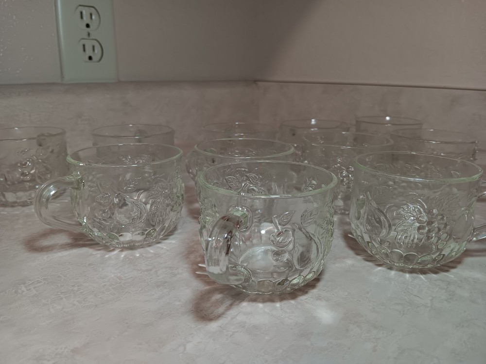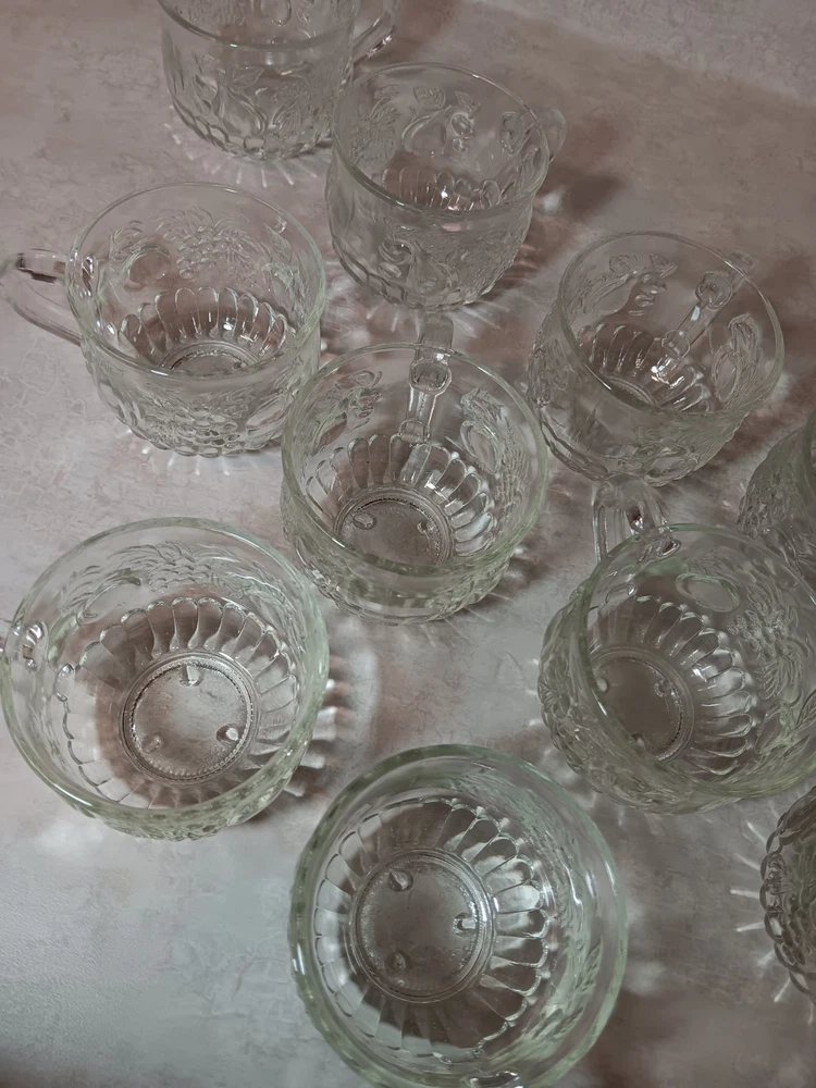 11 Cups all beautifully clear with no cracks or chips seen or felts. Some have minor imperfections over the years, but incredibly minor! Each glass cup is 2.25" tall with a diameter of 2.75"