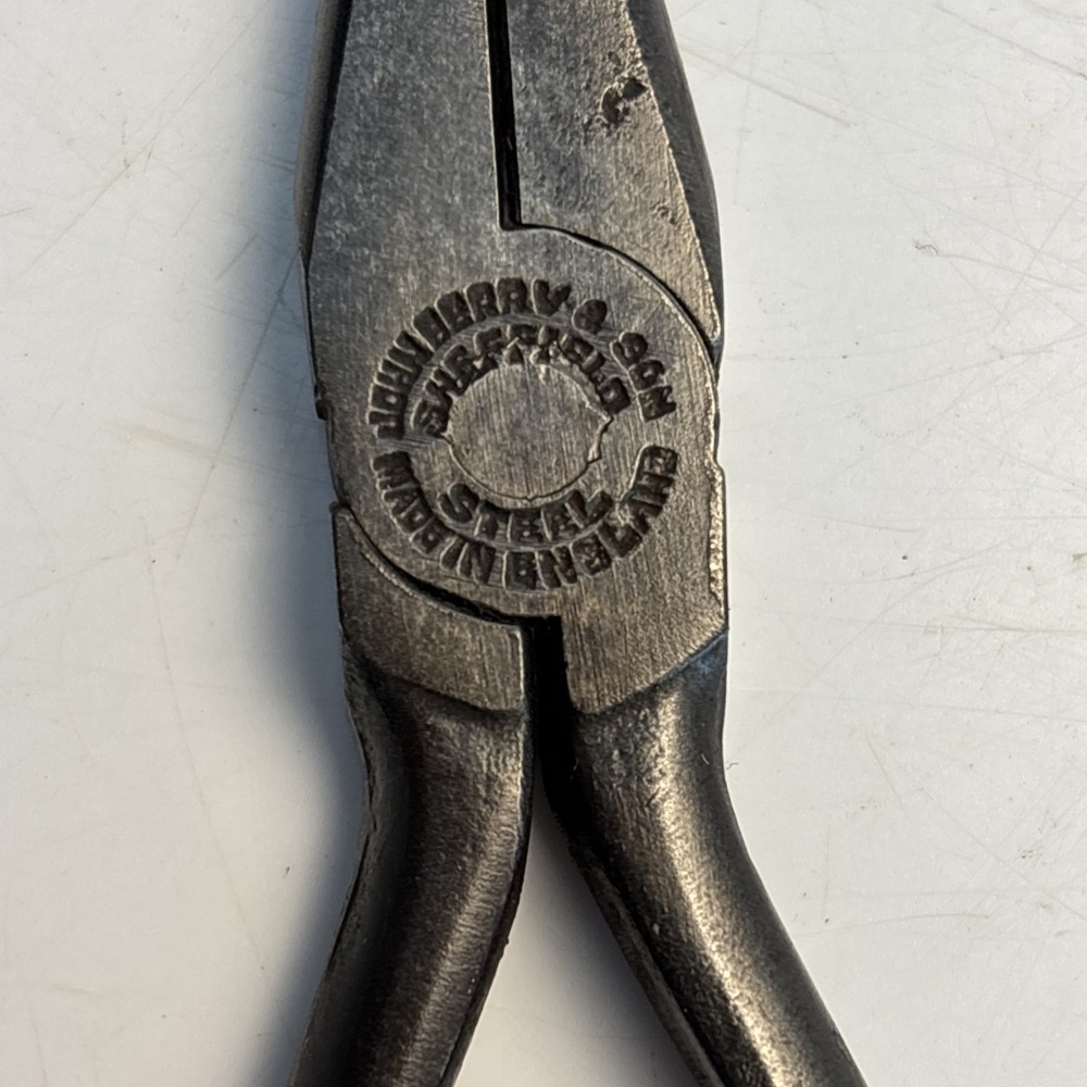 Vintage forged needle nose pliers made by John Berry & Son of Sheffield, England. Marked “Sheffield Steel” at the pivot. Solid all-steel construction with tapered jaws and integral handles. Measures approximately 5 1/2 inches overall. Traditional English-made hand tool with classic forged profile. Condition Vintage used condition. Surface wear, patina, and darkening consistent with age and use. No cracks or repairs observed. See photos for complete condition details.