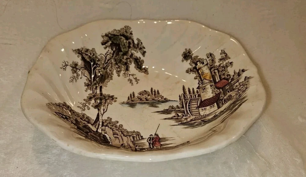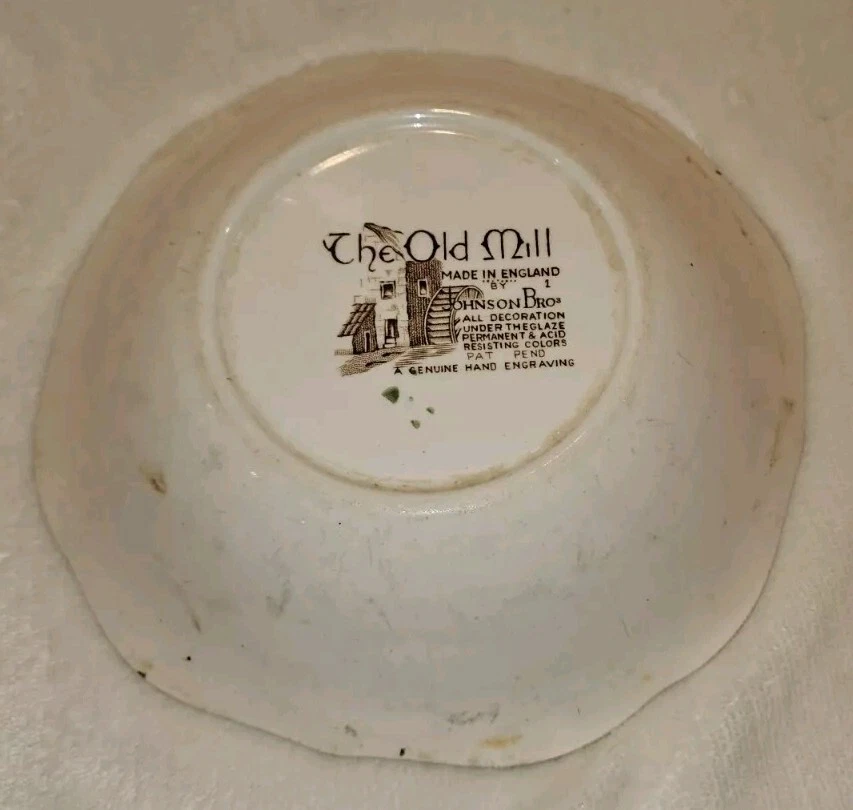 This vintage Johnson Brothers serving bowl is a beautiful addition to any collection. The oval-shaped porcelain bowl features a glossy finish and is adorned with an engraved, decorative pattern of The Old Mill. The two-piece set includes a serving bowl and is perfect for all occasions. The bowl is made in England and is 9 inches in length, 7 inches in width, and 2.5 inches in height. It weighs 2 pounds and has a printed backstamp. The item is a vintage piece from an unknown era and is perfect for those who appreciate colonial style. Care instructions advise hand washing only.