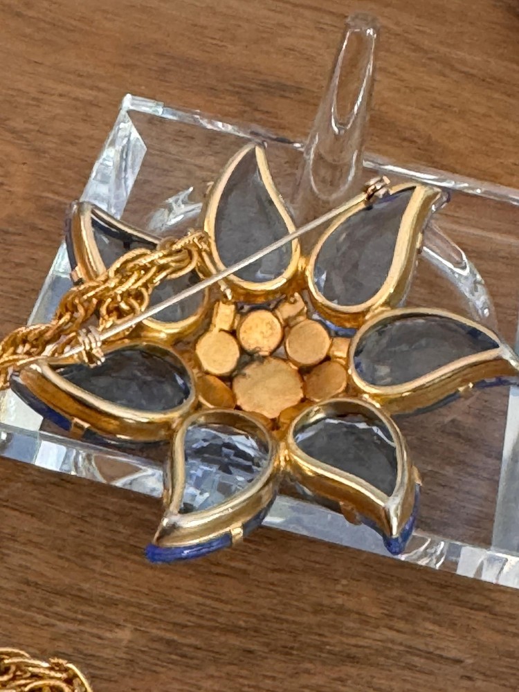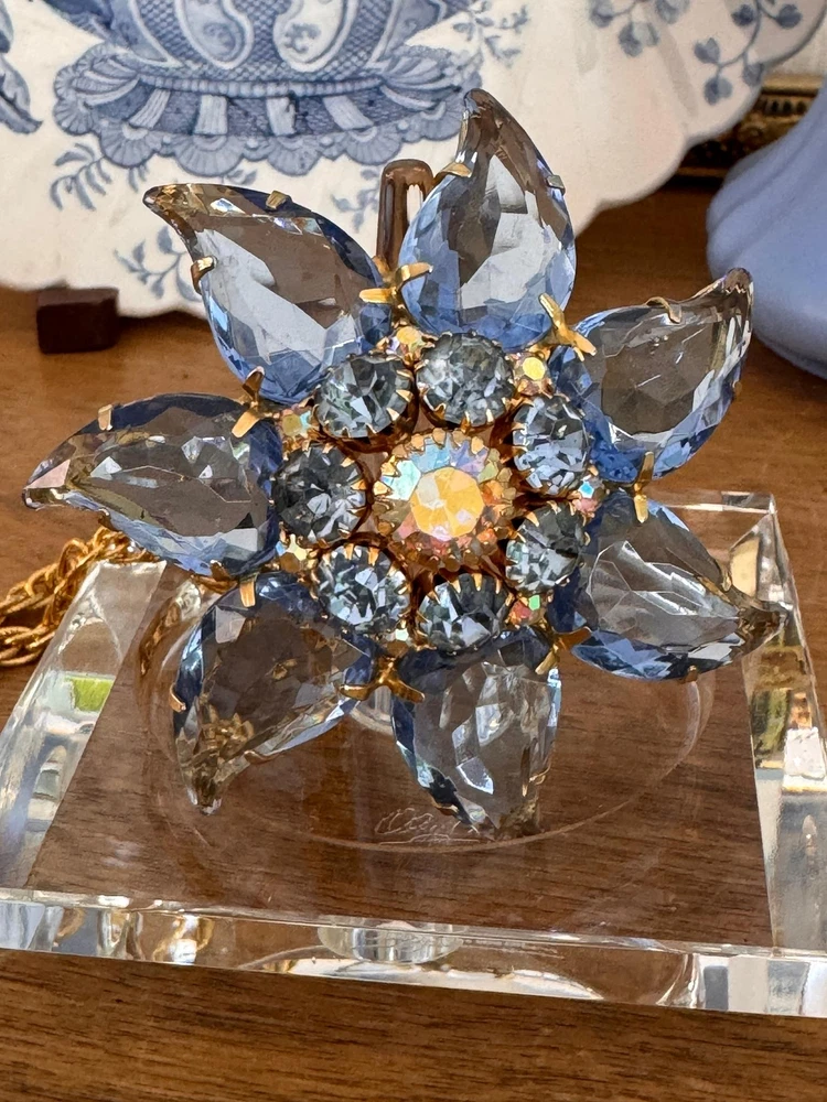 Elevate your style with this breathtaking Vintage Juliana Delizza & Elster Blue Rhinestone Stylized Floral Brooch Pendant. Crafted by renowned designers D & E, this showstopping piece features a stunning large multi-faceted rhinestone in shades of blue, green, yellow, and purple, surrounded by smaller soft blue rhinestones. The elegant gold tone metal setting is adorned with intricate open rhinestone petals, creating a truly luxurious look. Wear it as a pendant with our included vintage gold tone metal chain, or switch it out for your own personal touch. This pendant measures 2-5/8" wide x 1-1/4" high, and the 30" chain is secured with a spring ring clasp. Elevate your accessories collection with this exquisite piece. Listing and template services provided by inkFrog