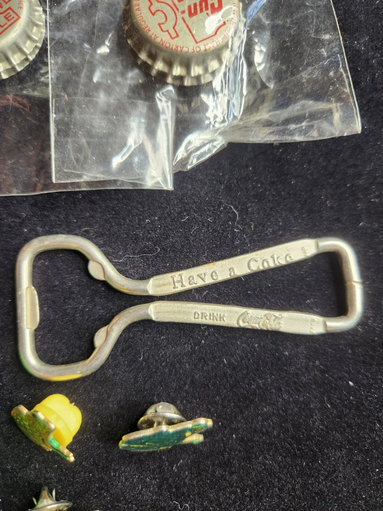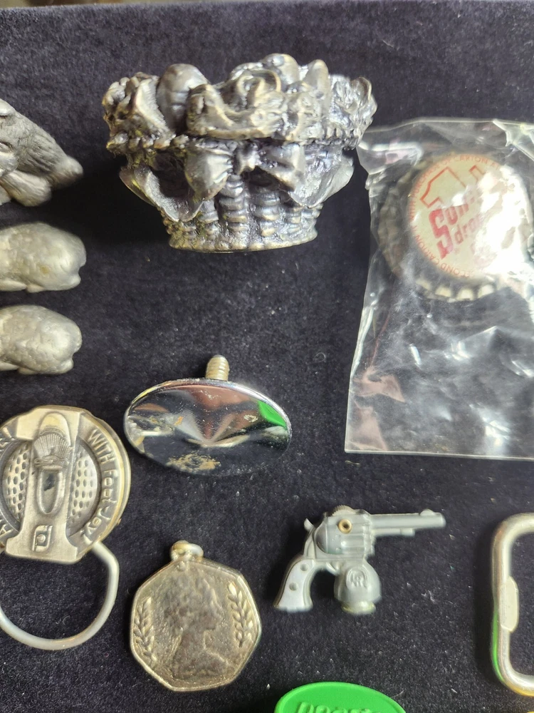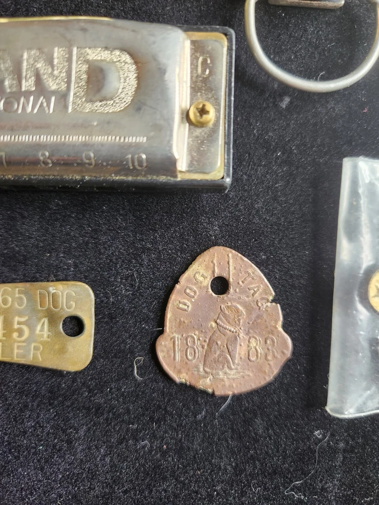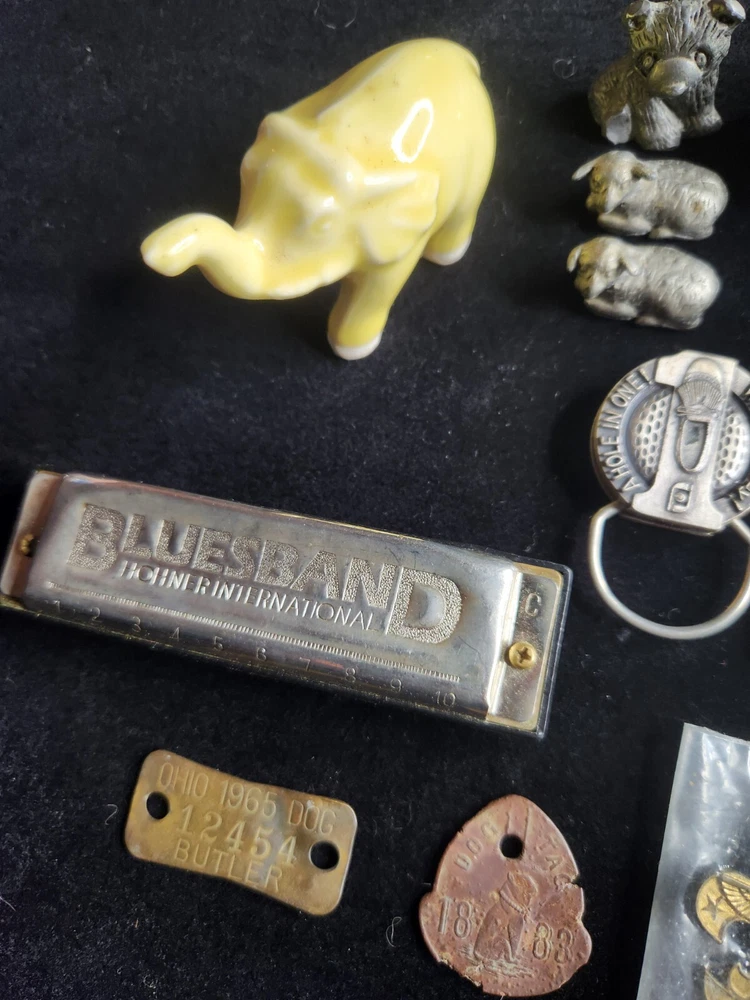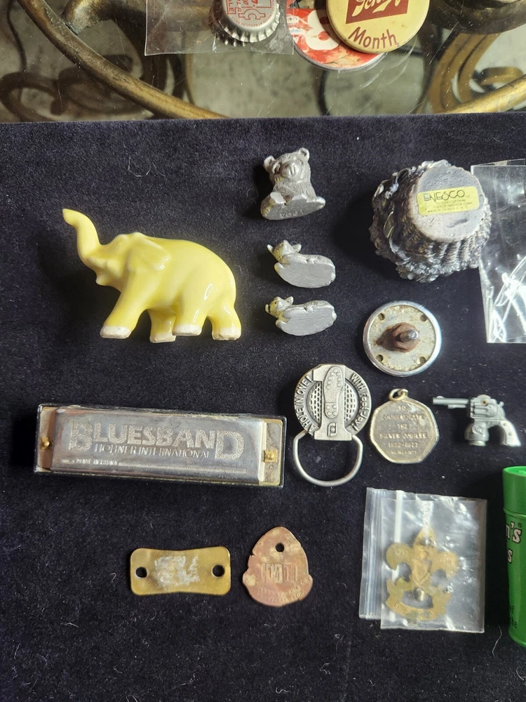 This vintage junk drawer lot includes items related to Silver Jubilee, Hohner, BSA, an 1883 dog tag, a vintage "trunk up" elephant, purported to bring good luck, a vintage Coca Cola bottle opener, etc. The collection consists of 20 items with a variety of unique pieces for collectors. Condition varies between pieces, as shown in pictures. See pictures for condition. LOT 7
