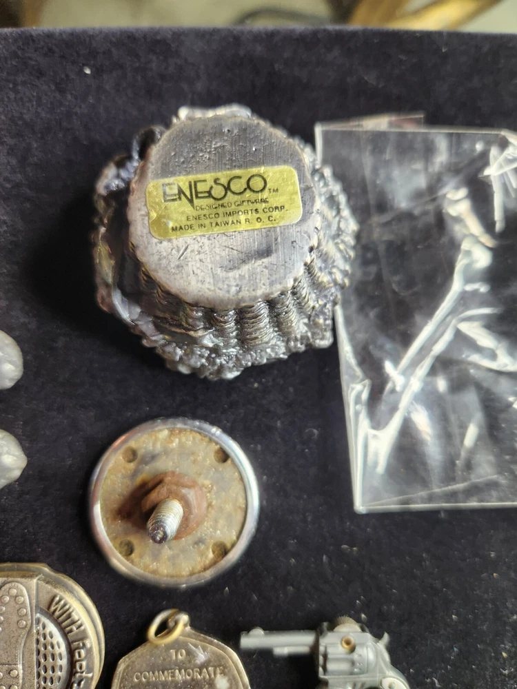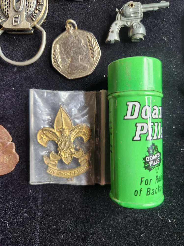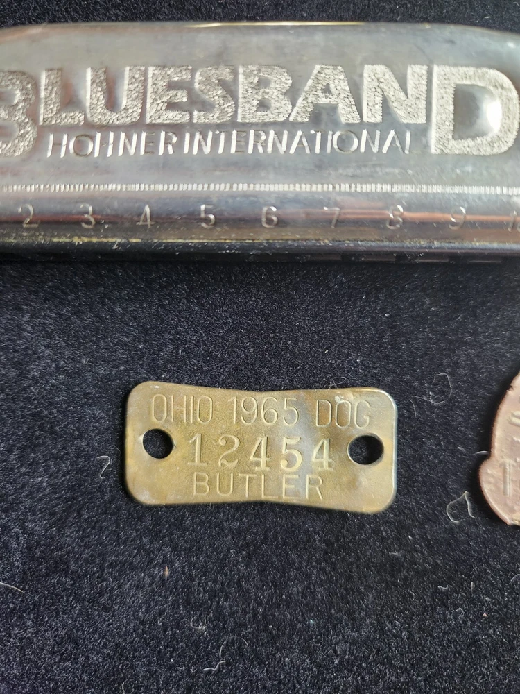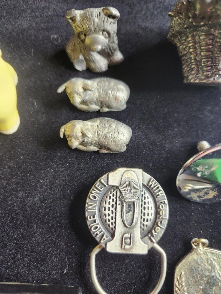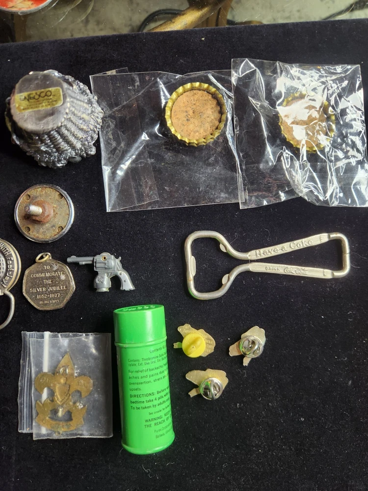 This vintage junk drawer lot includes items related to Silver Jubilee, Hohner, BSA, an 1883 dog tag, a vintage "trunk up" elephant, purported to bring good luck, a vintage Coca Cola bottle opener, etc. The collection consists of 20 items with a variety of unique pieces for collectors. Condition varies between pieces, as shown in pictures. See pictures for condition. LOT 7