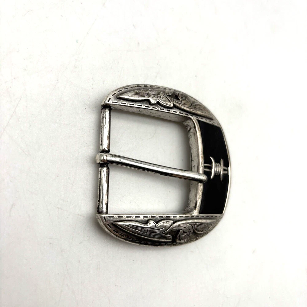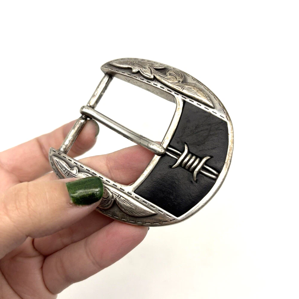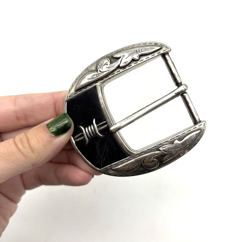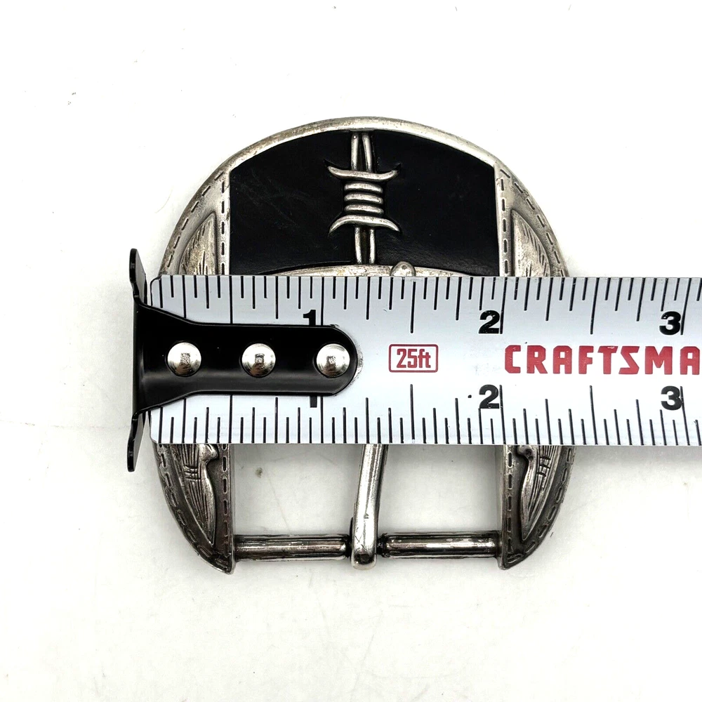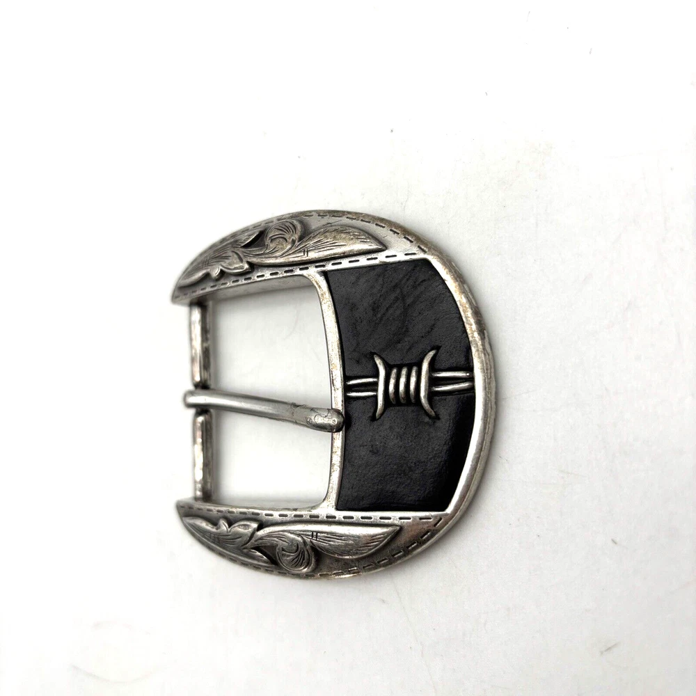 Vintage Justin 'Fenced In' Buckle Silver-tone Black Leather Inlay Barded Wire Design Western Filigree Accents Fits 1.5" Belt Measurements: 2.5" long 2.5" wide Great vintage pre owned condition. Gently owned. Some scuffing/scratches from age/use. Does not come with belt! Clean and from a smoke free home.