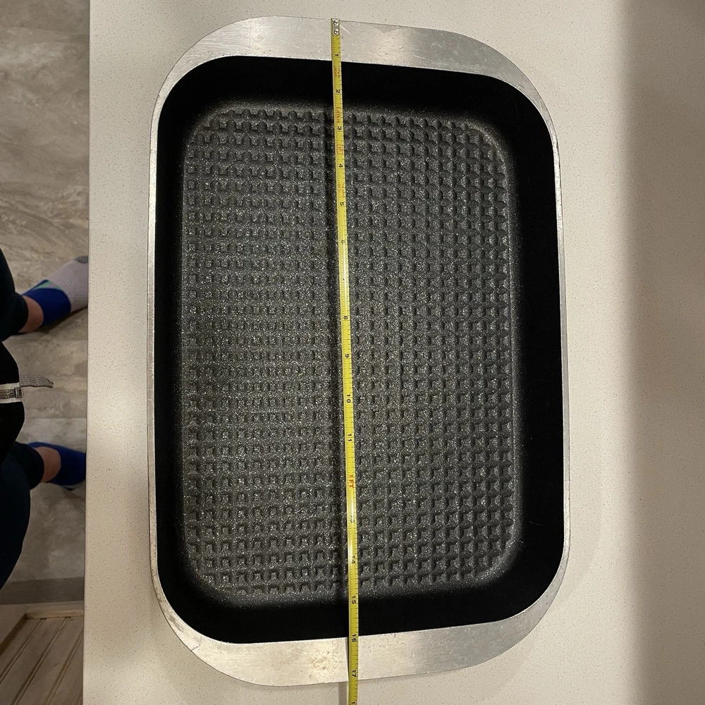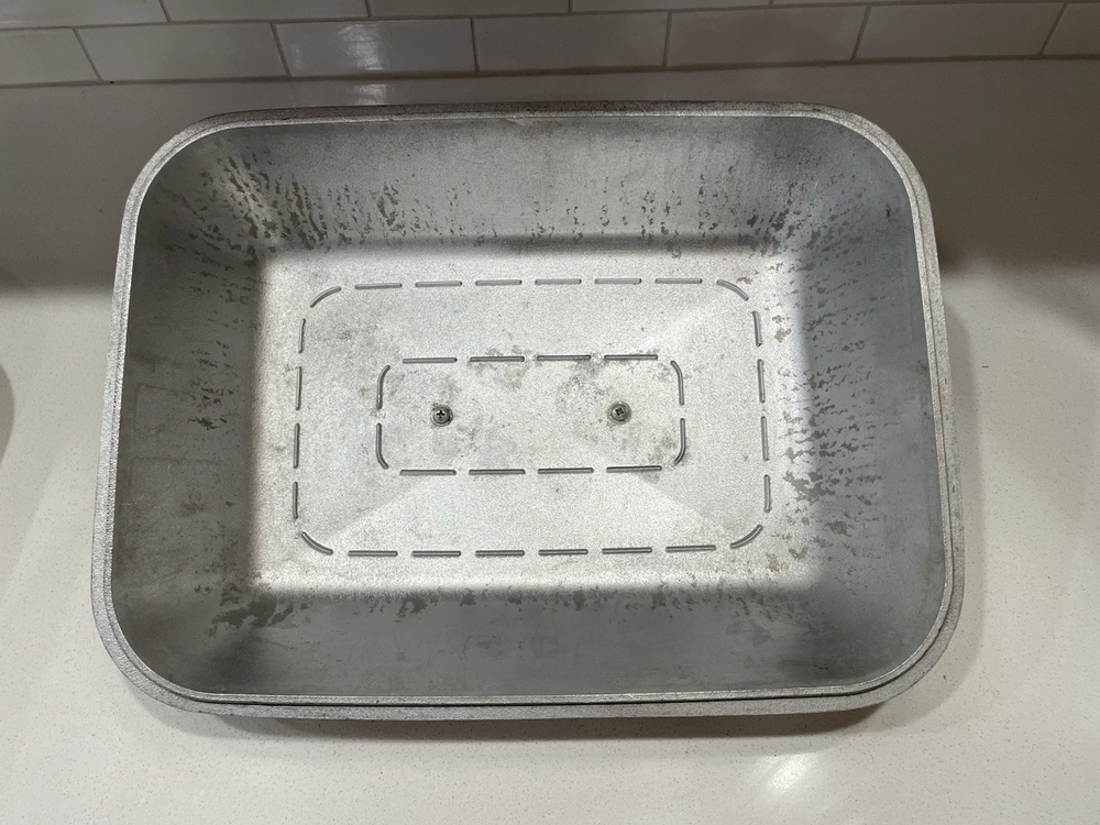 15" x 10 3/4 interior Gently Used Condition with minor scrapes and scratches on the outside of the pan and a few minor scratches inside the pan. Please review photos closely. This vintage KF Kitchen Fair roaster pot in a speckled white color is a must-have addition to any kitchen. It's perfect for cooking on electric or gas stoves and comes with a lid for convenient covering. The color is a unique blue that will add a pop of color to your kitchen. It's an original piece and not a licensed reproduction. This Dutch Oven is a collectible item and will make a great addition to any collection.