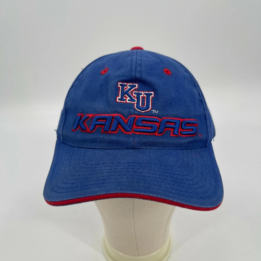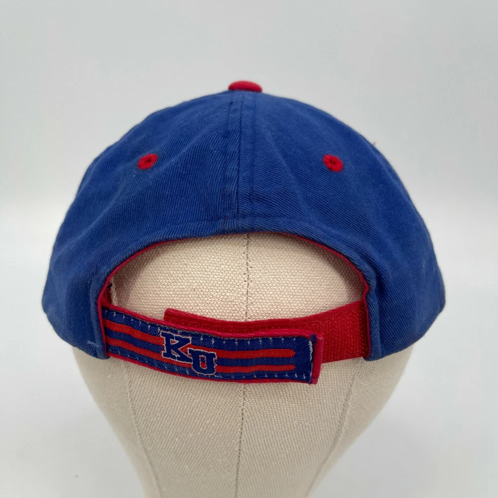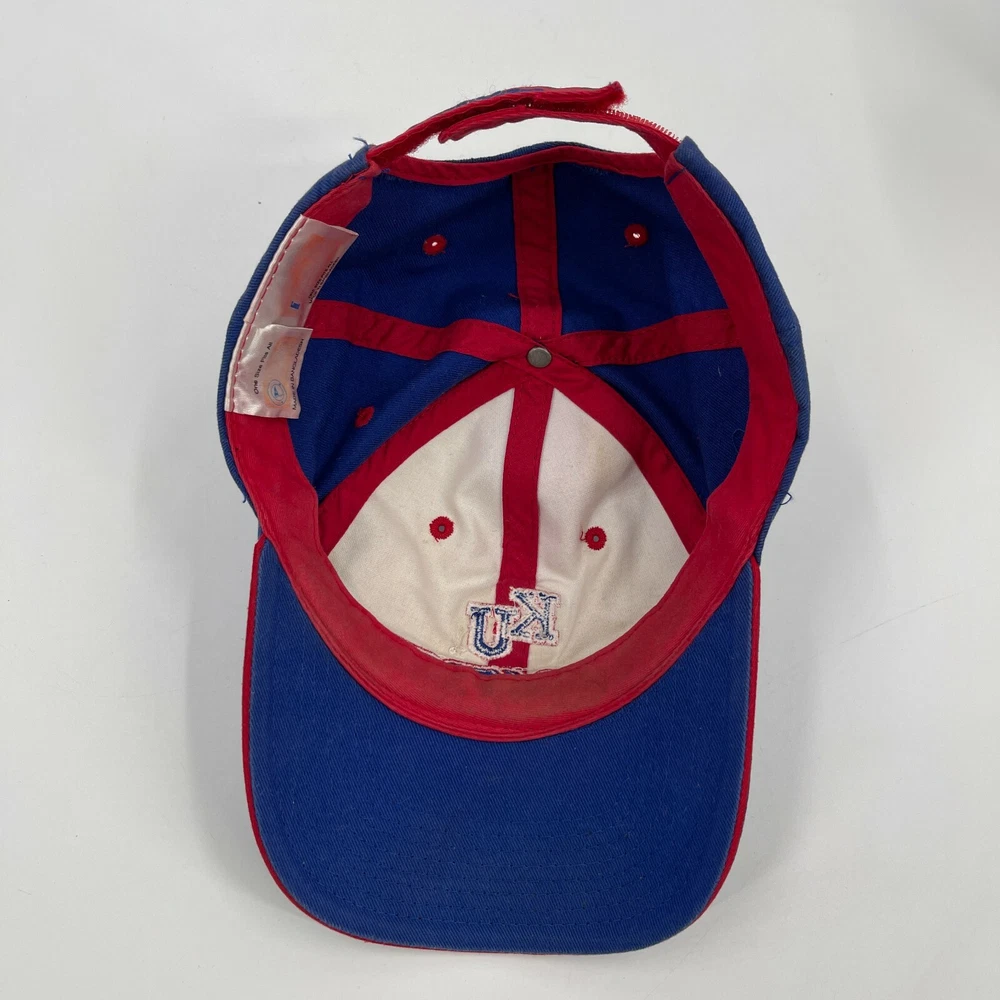 Vintage Kansas University Jayhawks Blue Adjustable Strap Back Cap Dad Hat This hat is in used condition. Please see photos for exact details and condition. Some light fading here and there due to age as shown.