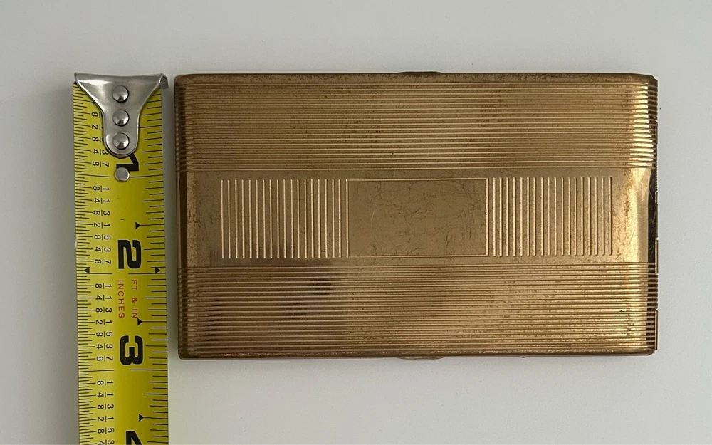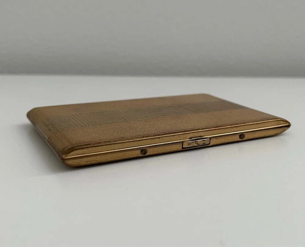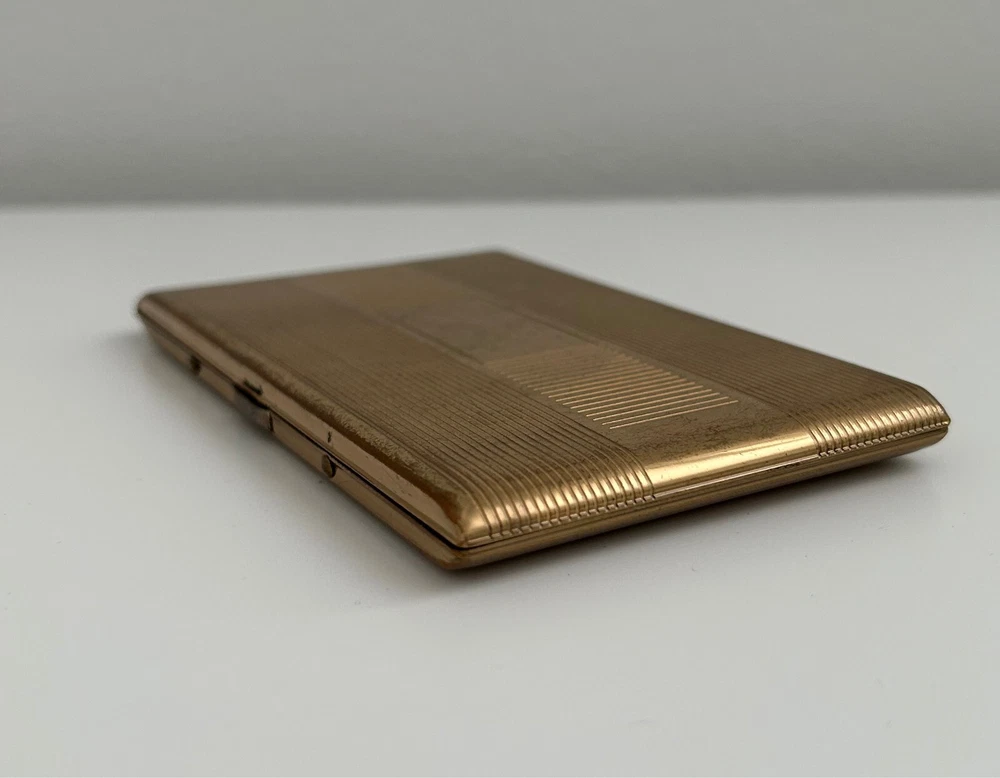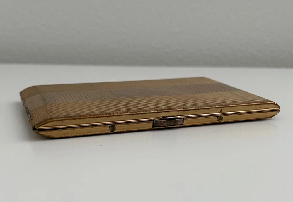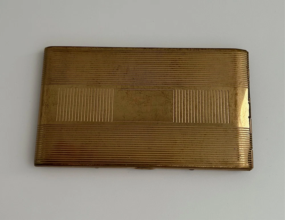 Vintage Karnee Metal Brass Compact Art Deco Cigarette Case Etched Design The case is gold-toned metal with a cool art deco style designe. It measures approximately 5" x 3". The case is in good used condition with minor wear. There are some light scratches on both the inside and outside. See photos for more details.