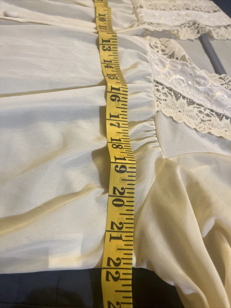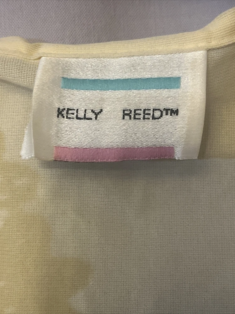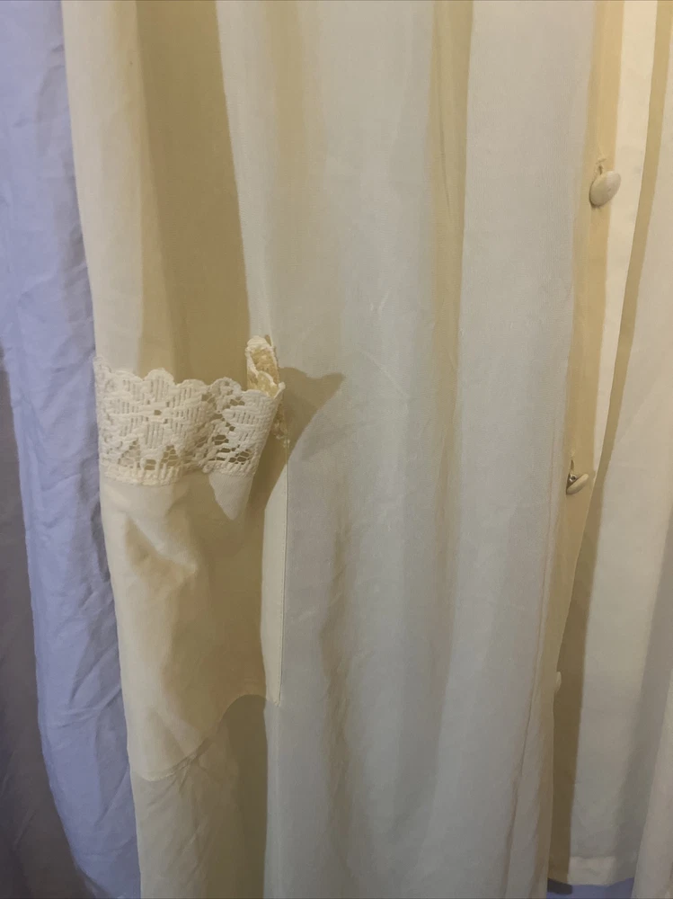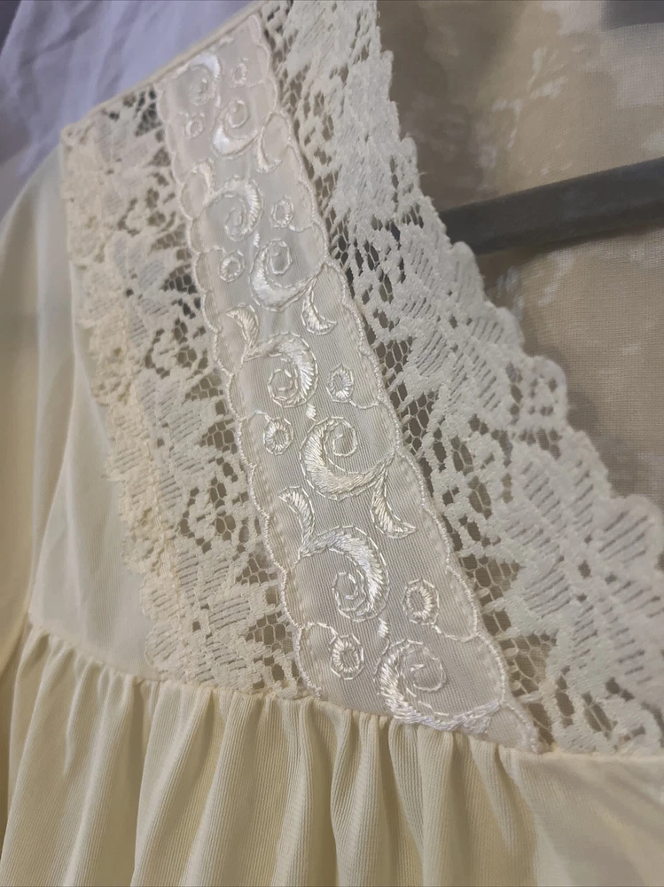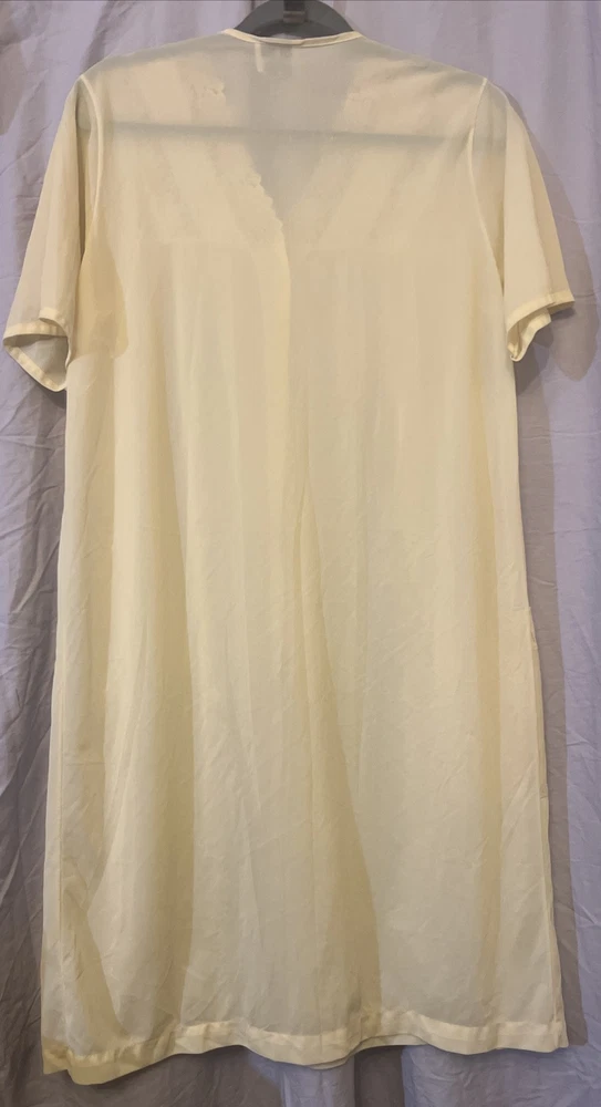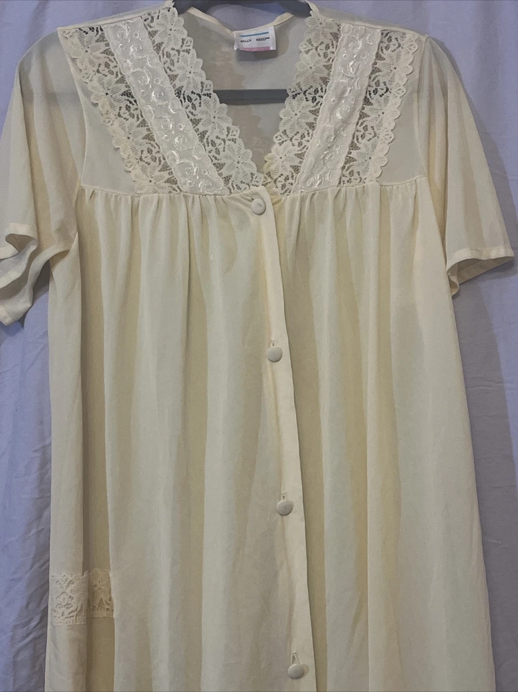 This is a vintage pre loved item and may have a blemish or minor flaw, however it is in wonderful condition and This is a vintage Kelly Reed robe/gown made of soft, lightweight, and packable pale yellow nylon fabric. It features a V-neckline, short sleeves, and a roomy A-line silhouette. The robe/gown is adorned with lace pocket buttons and has a solid pattern. It is suitable for summer, fall, and spring seasons. The robe/gown is machine washable and has a lovely, feminine, and pretty theme. It is available in size S and is part of the Kelly Reed product line.