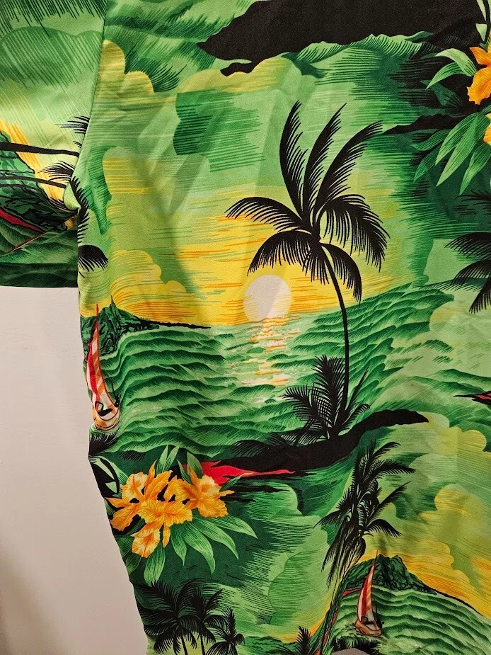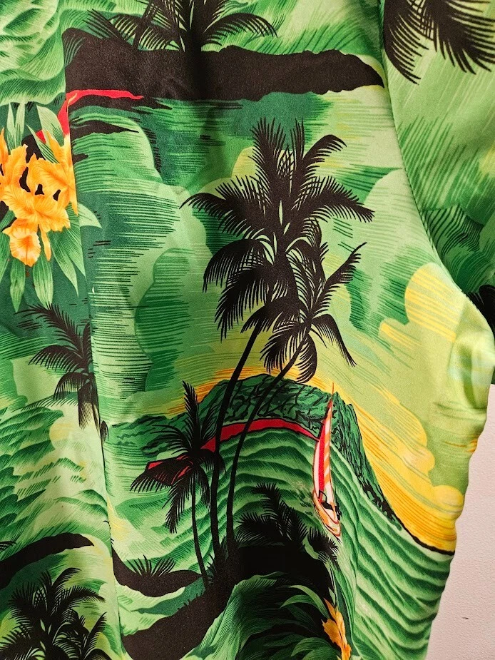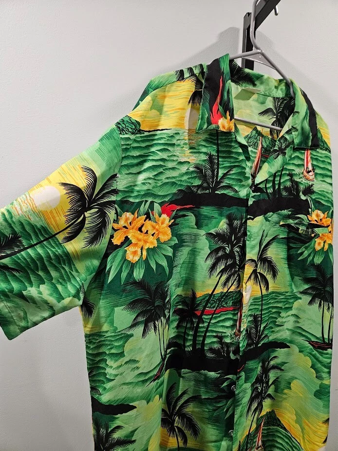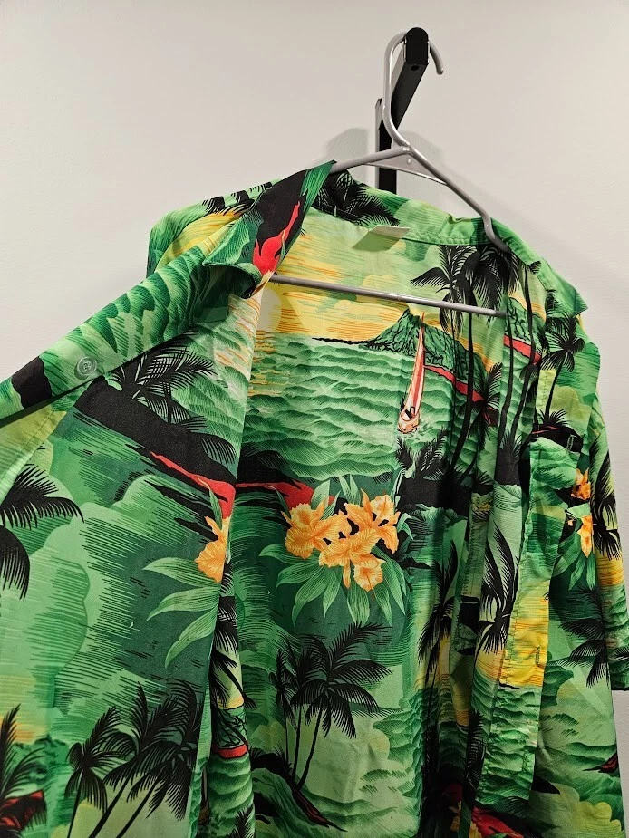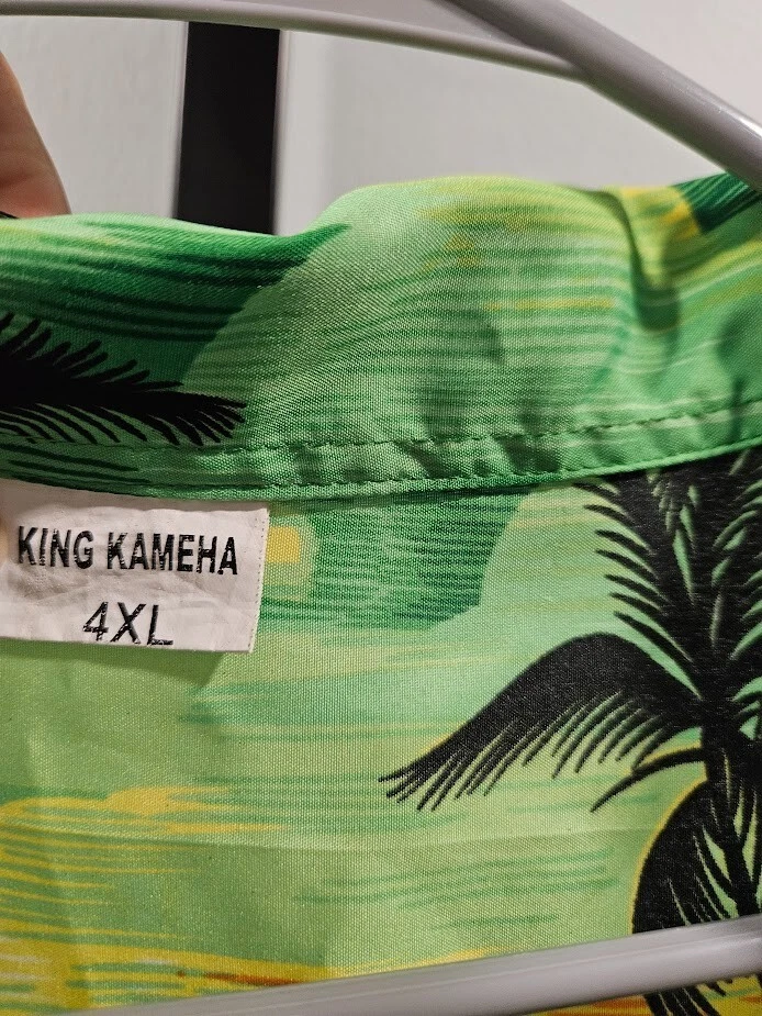King Kameha button-up shirt, green floral Hawaiian pattern and sea flower palms, lightweight, quick-drying, and breathable, size 4XL. Ships from a smoke free home! Please see all photos for exact item condition. Thank you for checking out my store! All items are shipped within 1 or 2 business days. Make a bundle to save on shipping cost. Wash to Wear