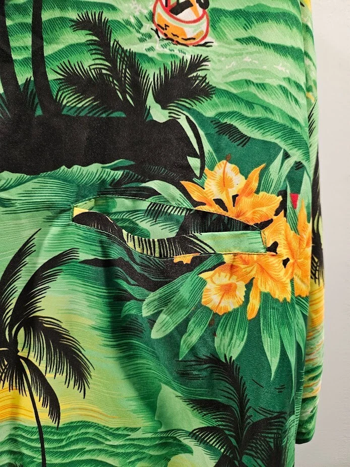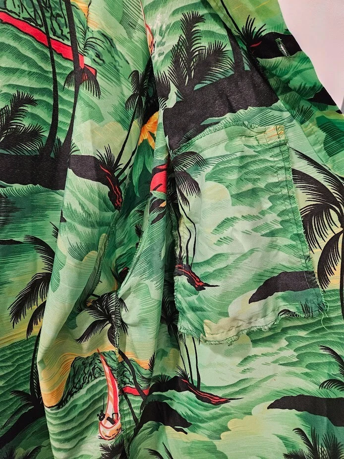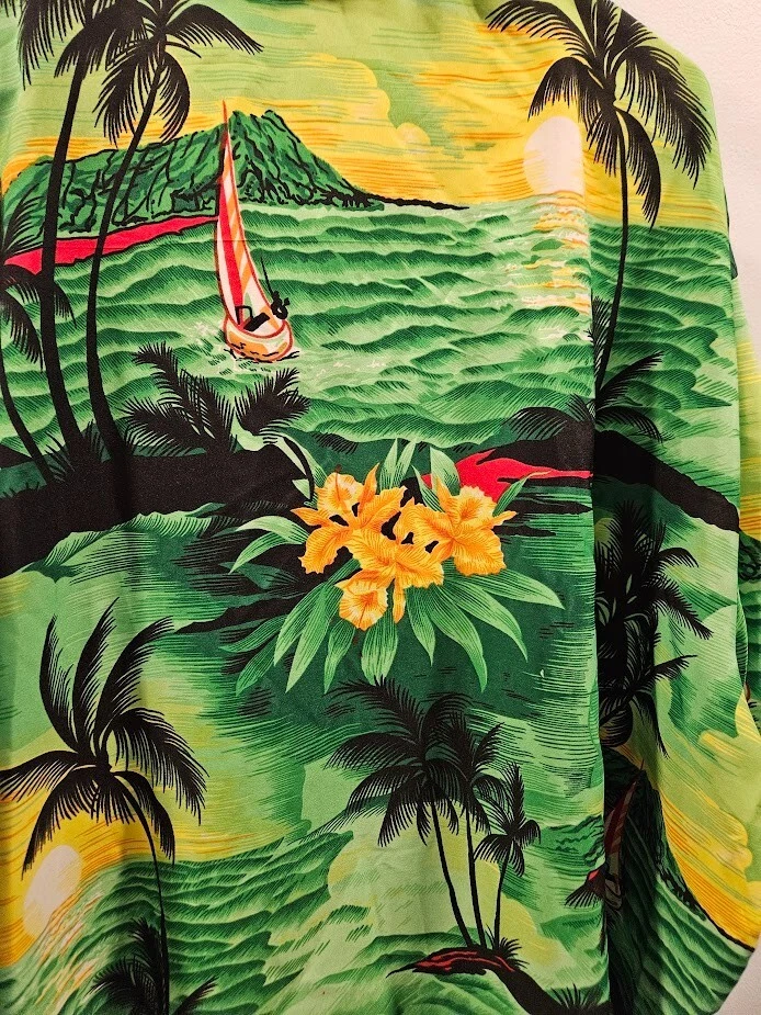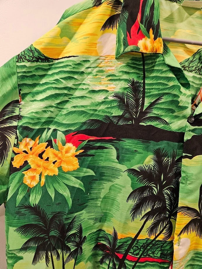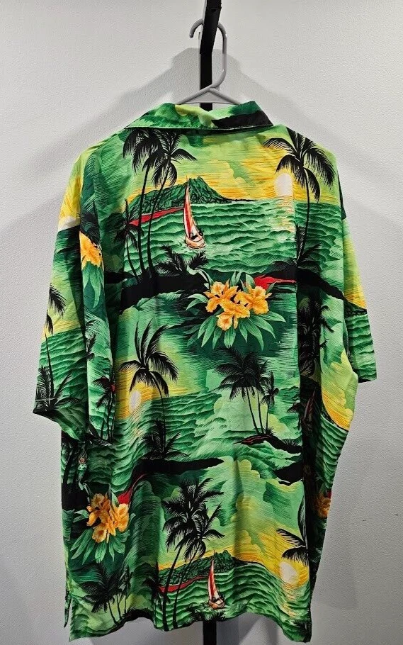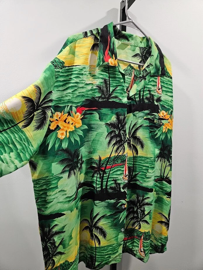 King Kameha button-up shirt, green floral Hawaiian pattern and sea flower palms, lightweight, quick-drying, and breathable, size 4XL. Ships from a smoke free home! Please see all photos for exact item condition. Thank you for checking out my store! All items are shipped within 1 or 2 business days. Make a bundle to save on shipping cost. Wash to Wear