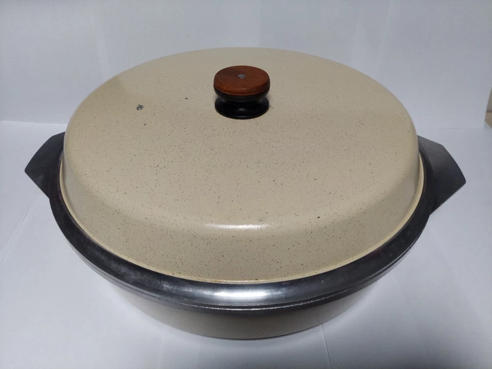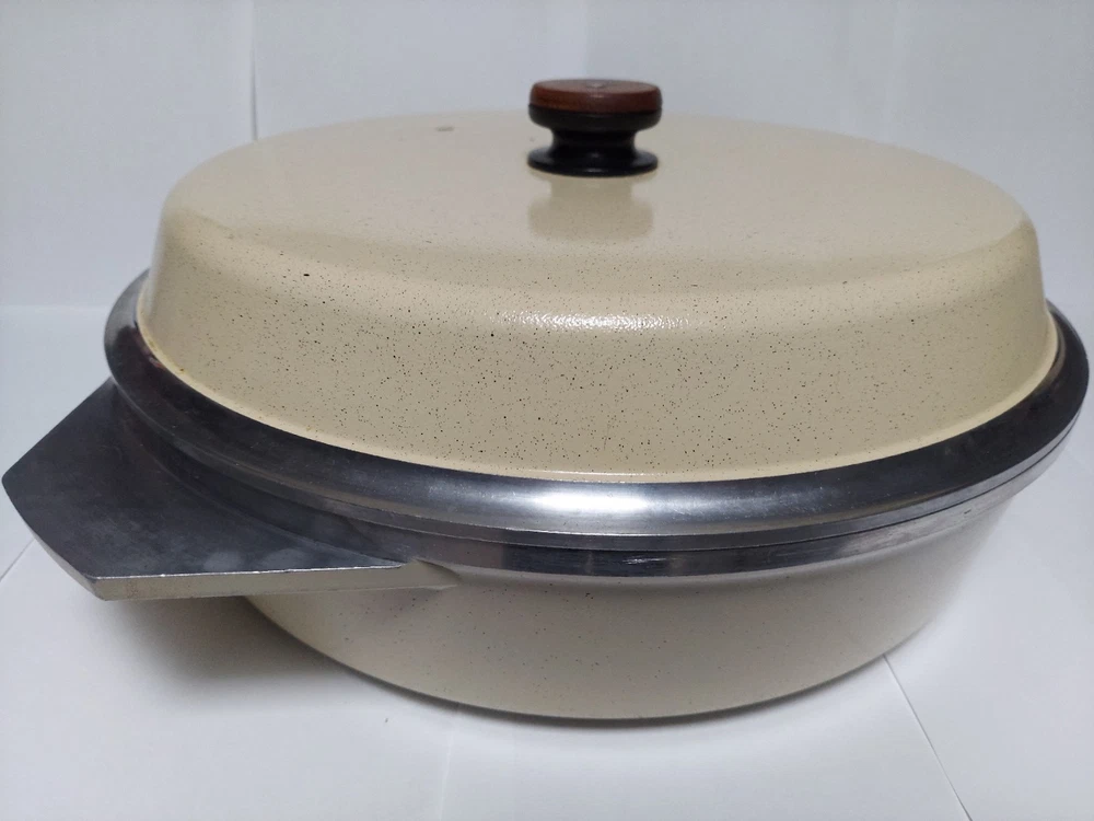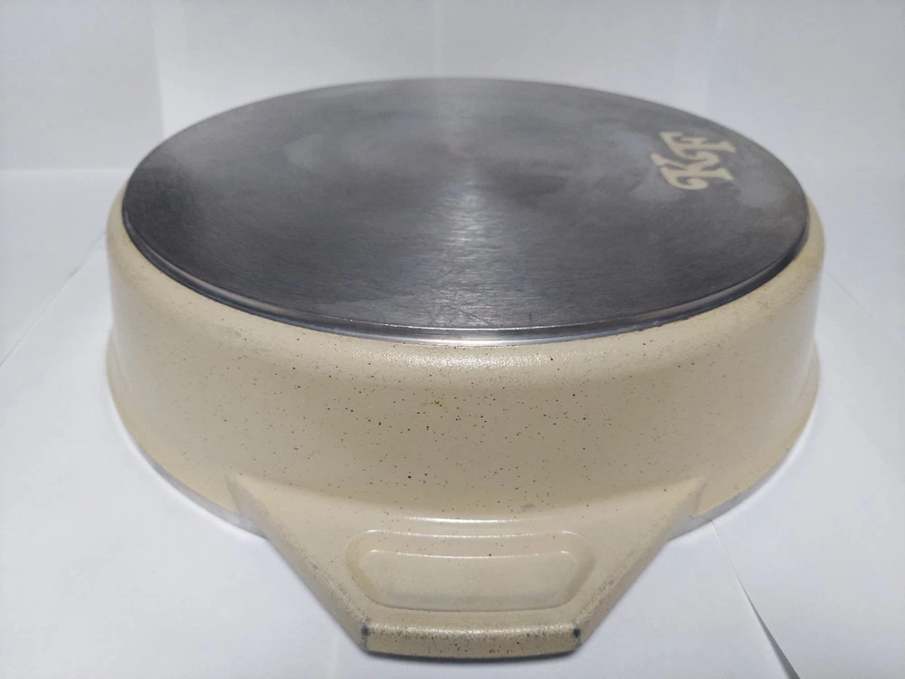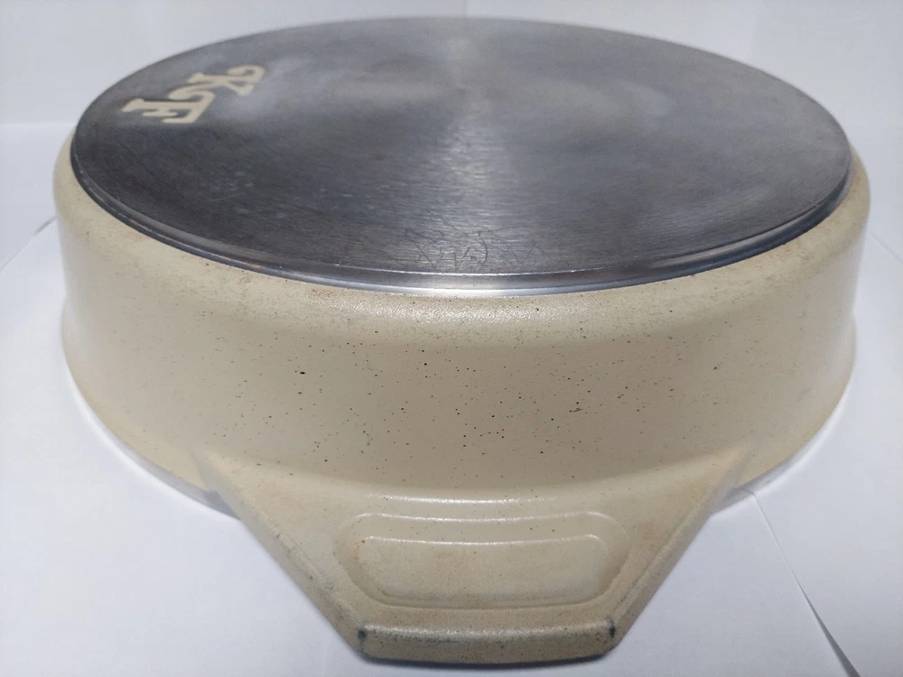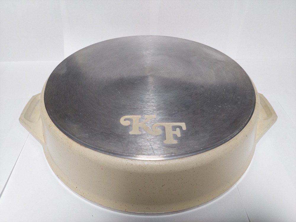 Will ship fast and protected. See photos for exact condition. Cleaned/sanitized and in good condition for its age. Chipping on the lid looks more like a manufacturer defect than damage from a ding because the enamel doesn't have jagged edges. The Kitchen Fair KF Cast Aluminum Double Handle Skillet is a vintage 14" yellow skillet with a lid, perfect for cooking on electric or gas stoves. This set includes a pot and lid, featuring a double handle design for easy transportation. Made of aluminum, this casserole pan/pot is an original piece from the brand KF, adding a unique touch to any kitchen collection.