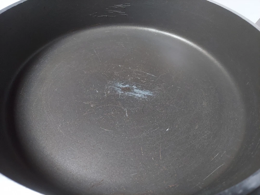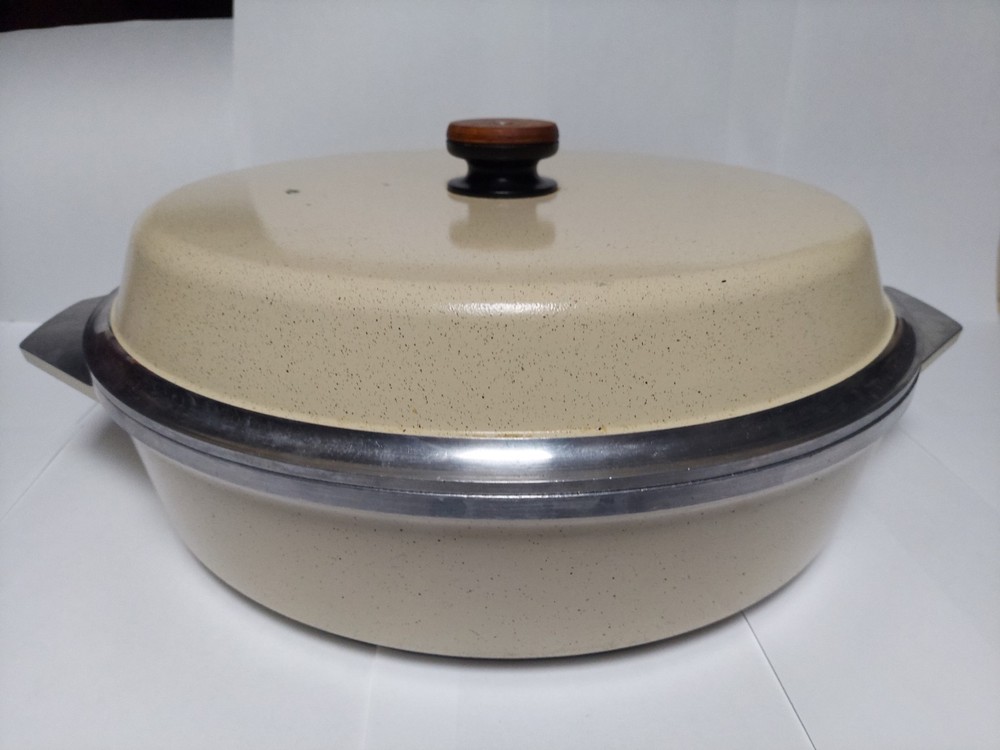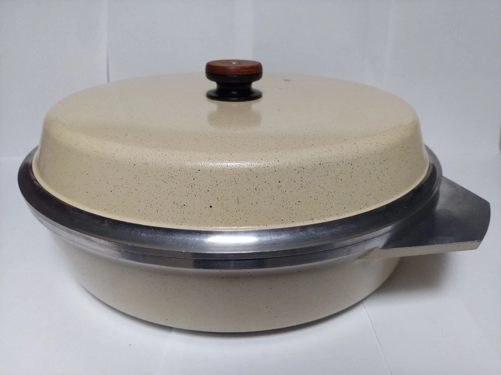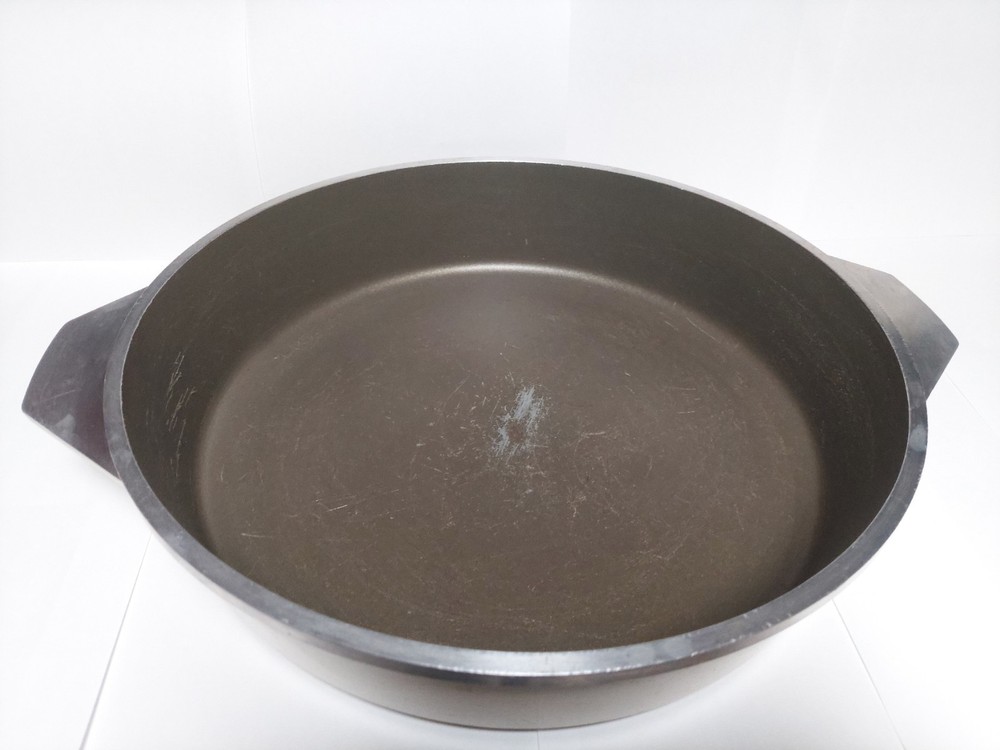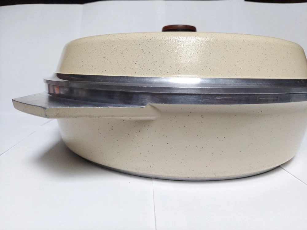 Will ship fast and protected. See photos for exact condition. Cleaned/sanitized and in good condition for its age. Chipping on the lid looks more like a manufacturer defect than damage from a ding because the enamel doesn't have jagged edges. The Kitchen Fair KF Cast Aluminum Double Handle Skillet is a vintage 14" yellow skillet with a lid, perfect for cooking on electric or gas stoves. This set includes a pot and lid, featuring a double handle design for easy transportation. Made of aluminum, this casserole pan/pot is an original piece from the brand KF, adding a unique touch to any kitchen collection.