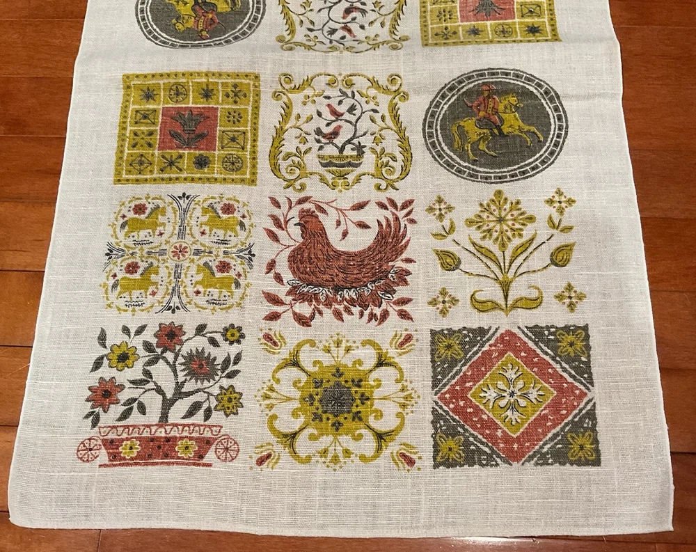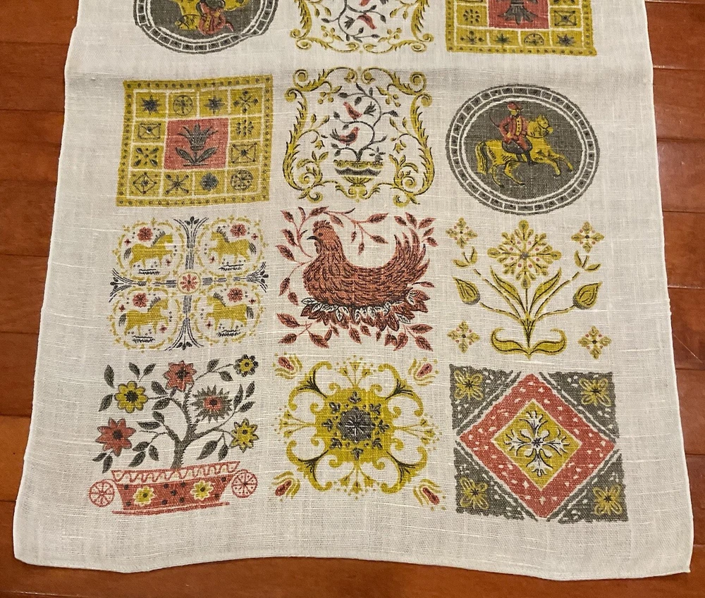 We have for sale a vintage linen kitchen tea towel. It measures approximately 28.5" x 17.5" and is in nice used condition. It features a design of horses, perching birds, chickens on their nests, flowers, and horses w/riders. This is from my mother Dorothy's (a Rosie the Riveter in WWII) collection. She was a fun, strong, and vibrant lady who had an eye for unique and beautiful items. Our hope is that these items find their way to people who will appreciate them as much as she did. Please look at all pictures and ask questions before purchase. Thank you!