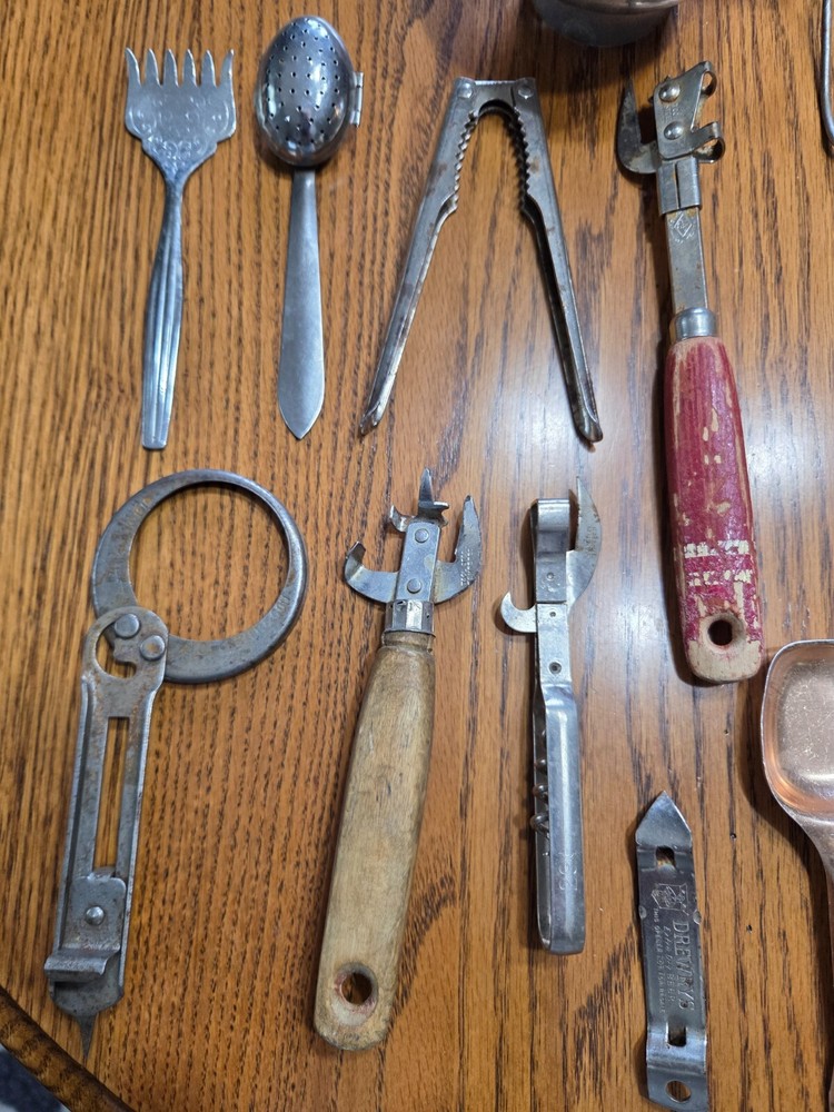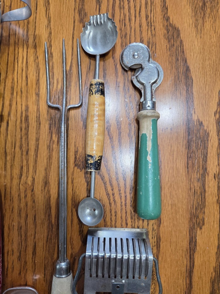 A vintage lot of 14 pcs. A variety of can openers, pasta cutter, melon baller, knife sharpener, canning funnel, nut cracker, tea infuser, sardine fork. Some of the paint is coming off of the wooden handles.