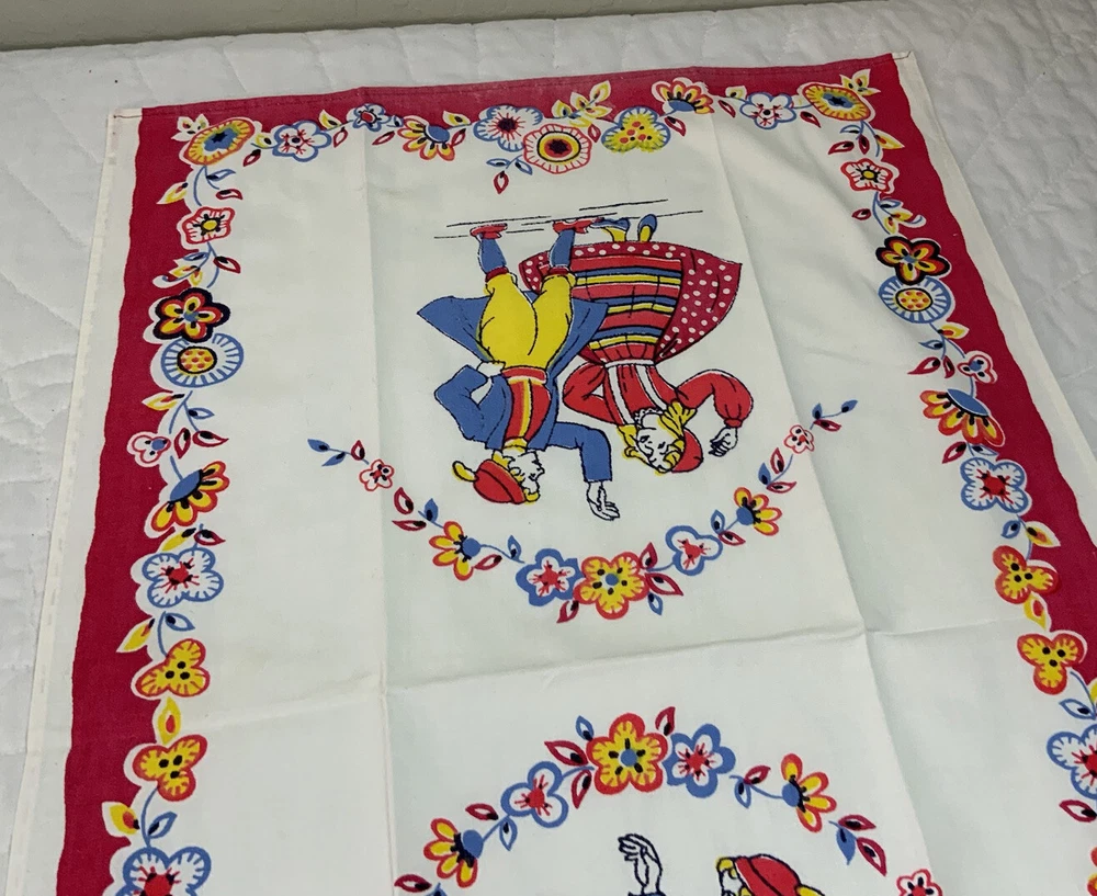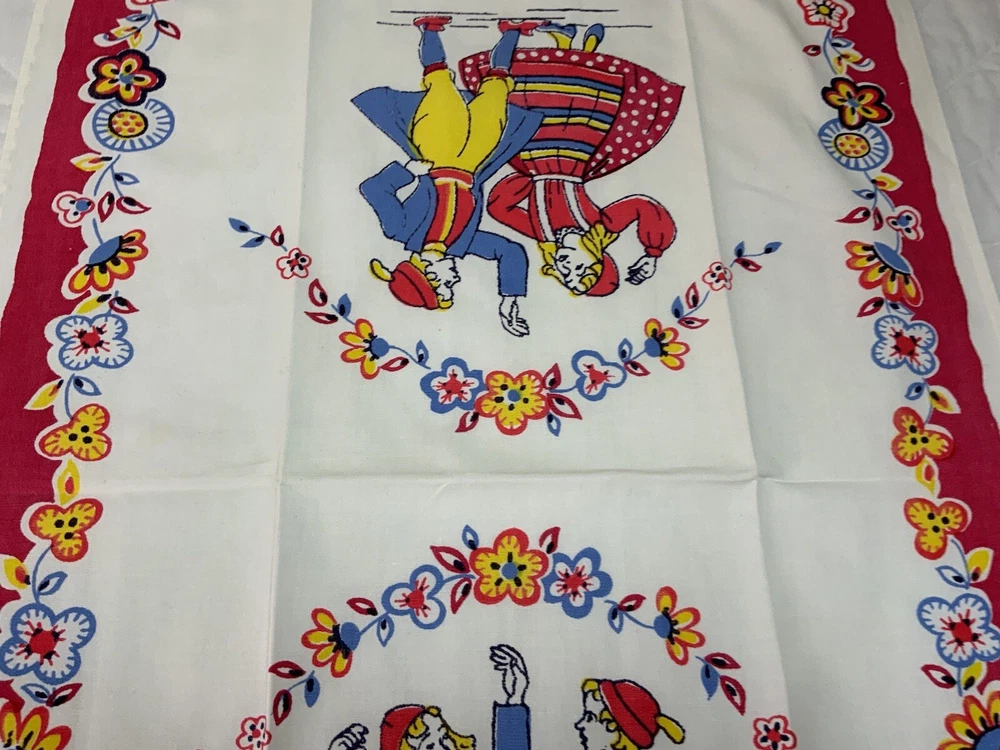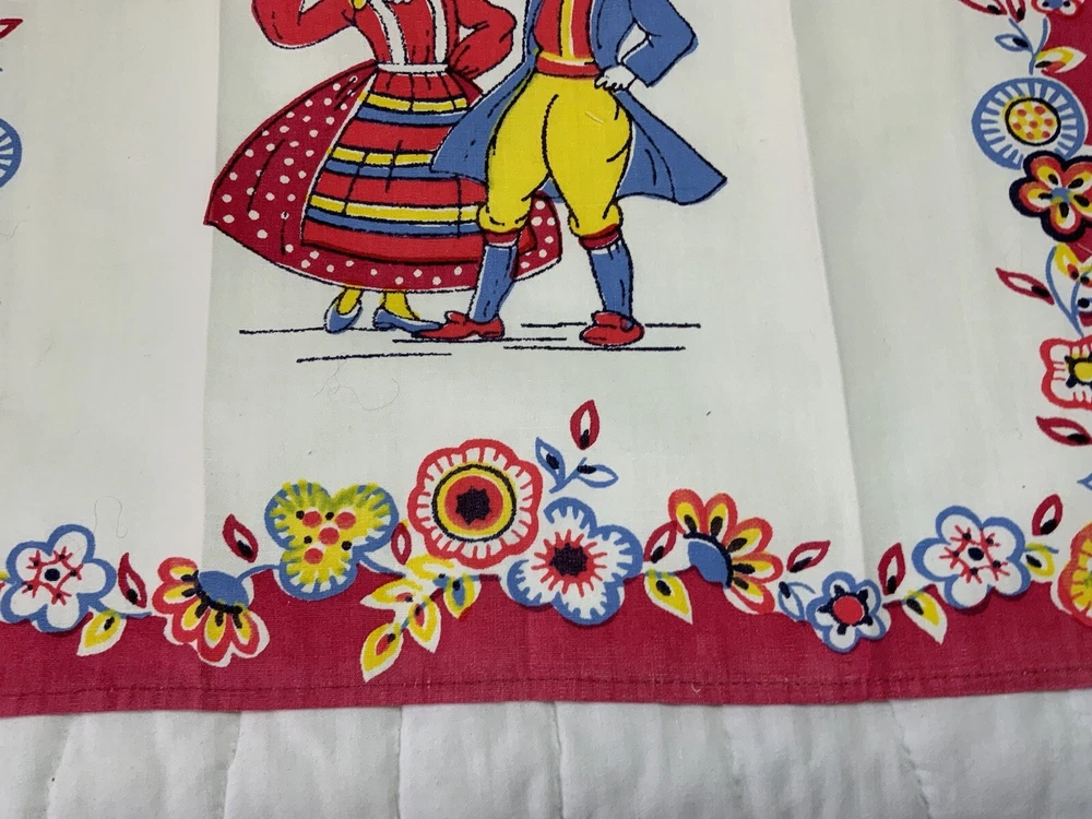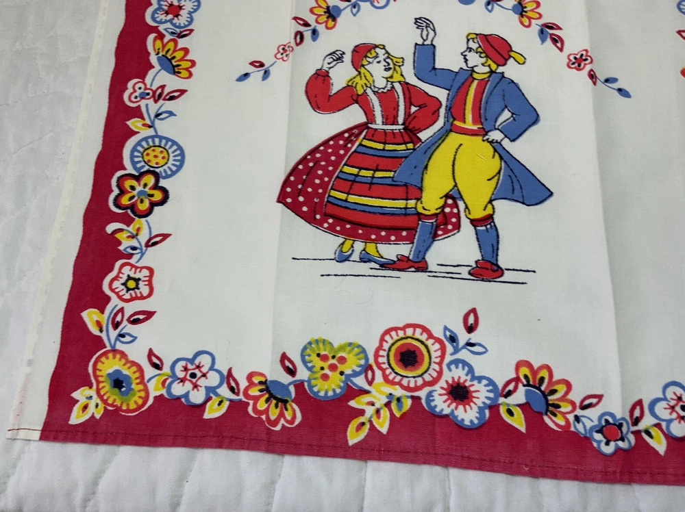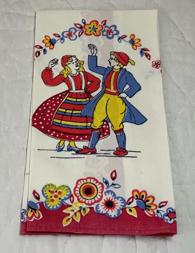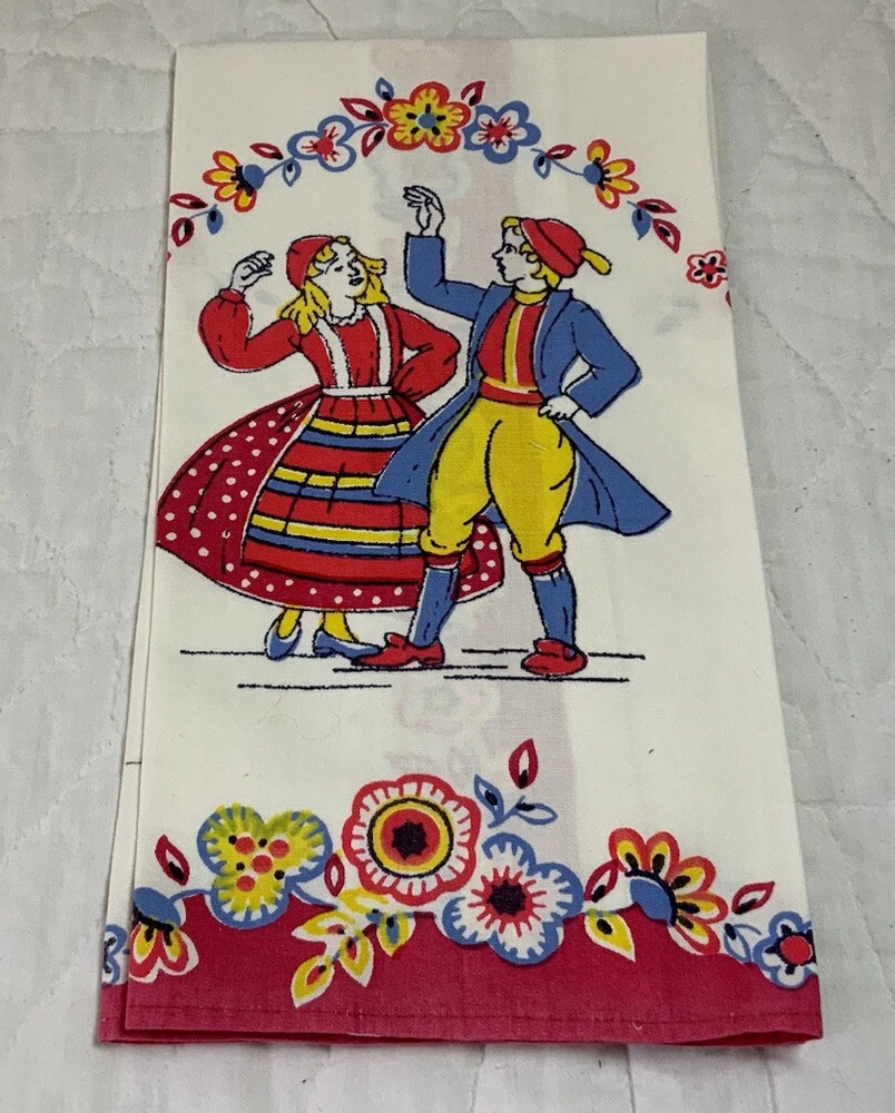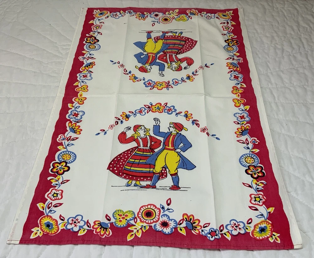 Up for sale is a vintage kitchen towel. The design is printed — European couple dancing, fancy outfits, apron, etc. with flowers. The colors are vivid — red, yellow, blue, black, white, multi. Machine sewn hems all around. Cotton. Measures 17” by 25”. Very, very good condition. Thank you and happy bidding. I will combine shipping charges. Smoke free home. Please make payment within three days. Please visit my eBay store: webbsamericancountry1 for over 2000 vintage and collectible items.