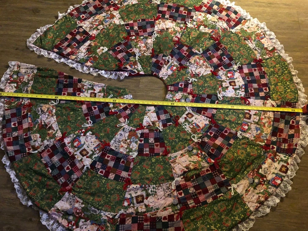 Measures about 60" across. Gorgous tree skirt full of kittens with lace on the outside. Excellent condition.
