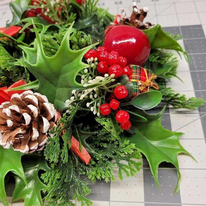 • Artificial greenery & festive accents • Includes pinecones & red berries • Diameter: 10 inches • Center opening for candle