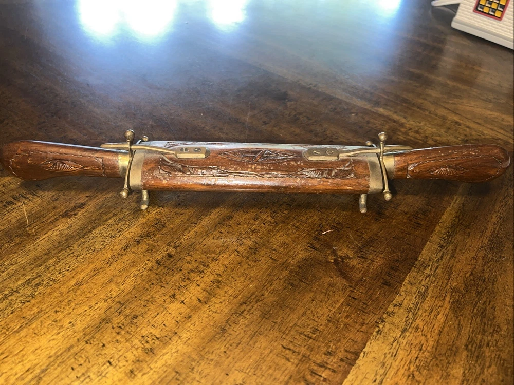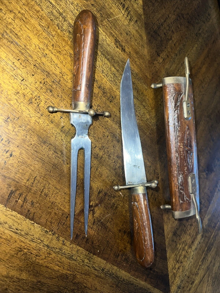 This vintage knife and fork set is a stunning addition to any collection. The set is handcrafted with wood handles and brass trimming, giving it a unique and elegant look. Made in India, this set is a true vintage find with a brand name of Case. The set includes a knife, fork, and spoon, all of which are beautifully crafted and perfect for any collector or enthusiast. The handle material is wood, which adds to the durability and charm of the set. This set is a must-have for anyone who appreciates handmade, vintage items.