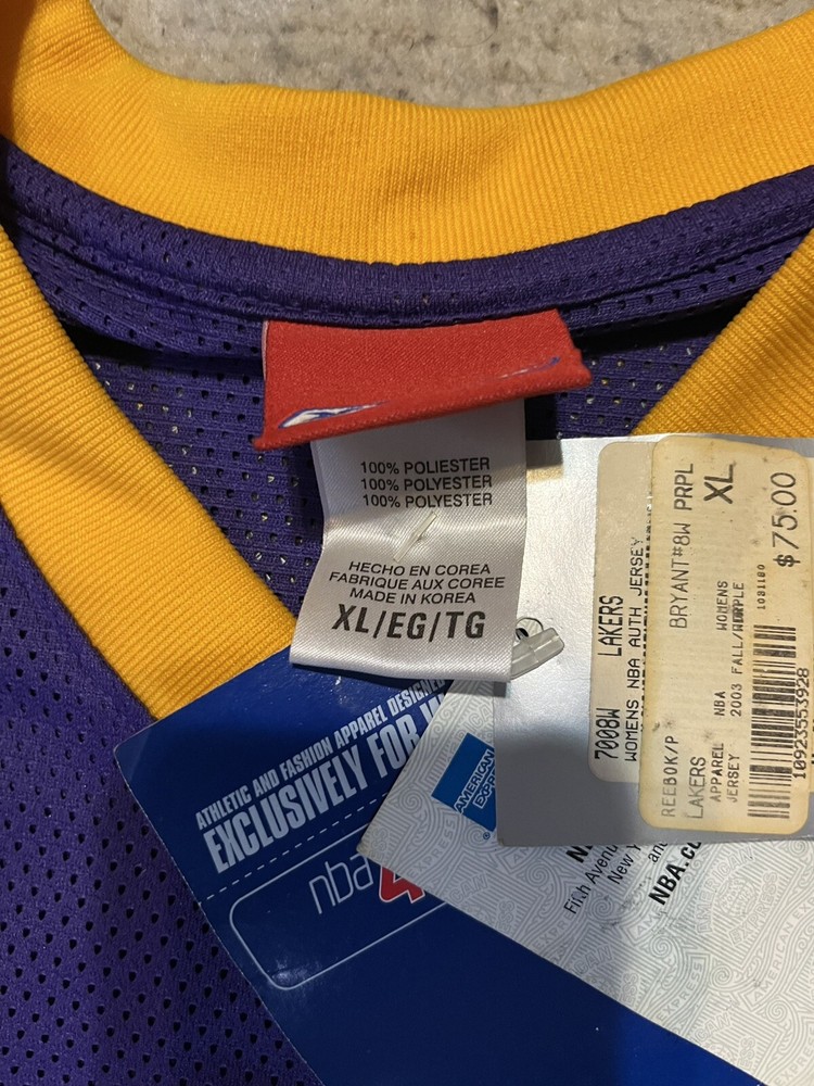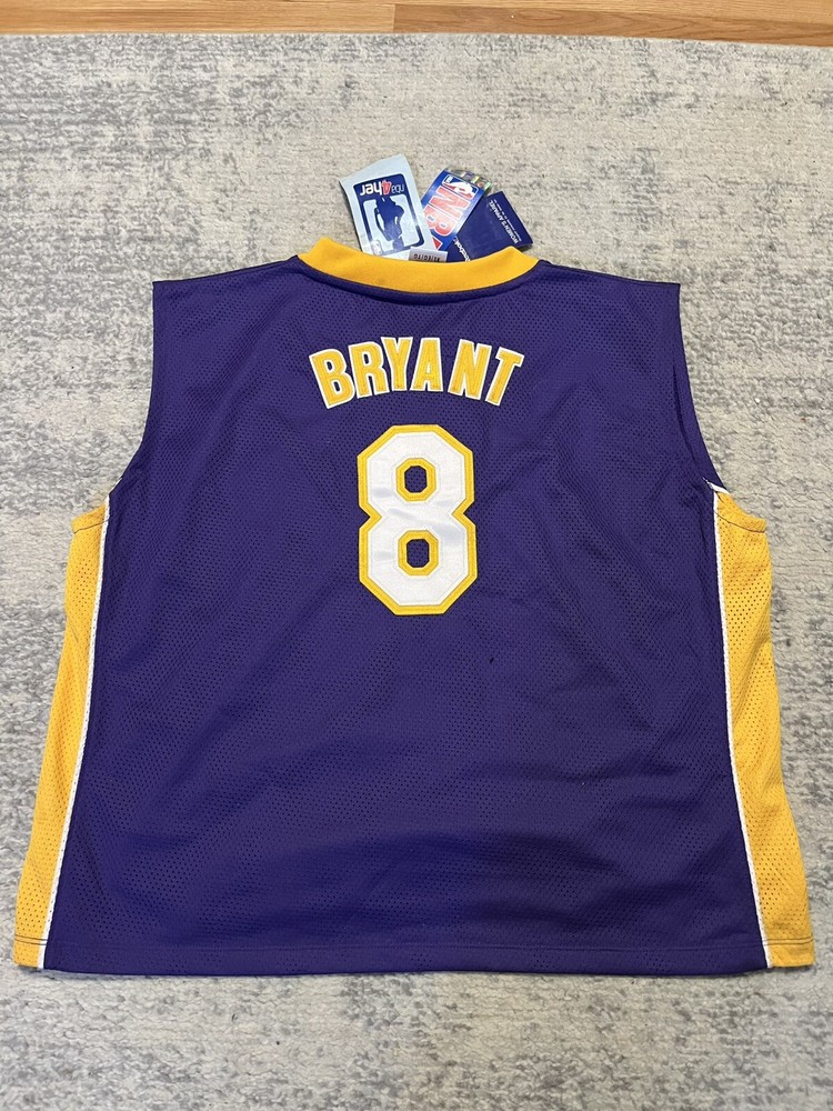 The product is a vintage Los Angeles Lakers Kobe Bryant #8 basketball jersey made by Champion in size XL. It is a purple jersey representing the National Basketball Association (NBA) team.