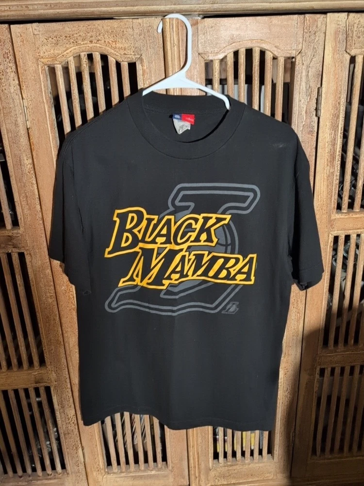 Show your love for the Los Angeles Lakers and the late Kobe Bryant with this vintage black Mamba t-shirt. Featuring Bryant's iconic number 24 and his nickname "Black Mamba," this shirt is perfect for any Lakers fan or collector of vintage clothing. Made from comfortable cotton material, this shirt is suitable for wearing to the beach or for everyday sportswear. The shirt is available in a men's medium size and is perfect for any fan of the black color.