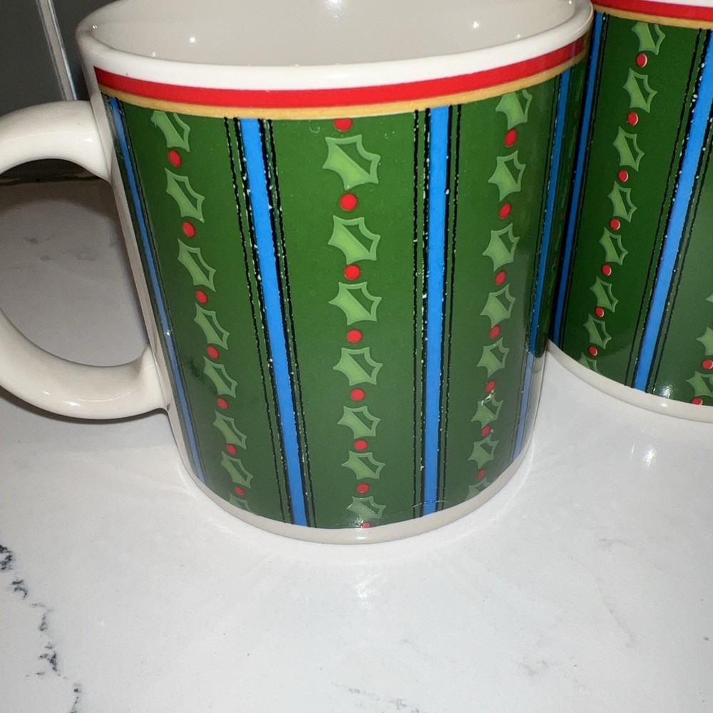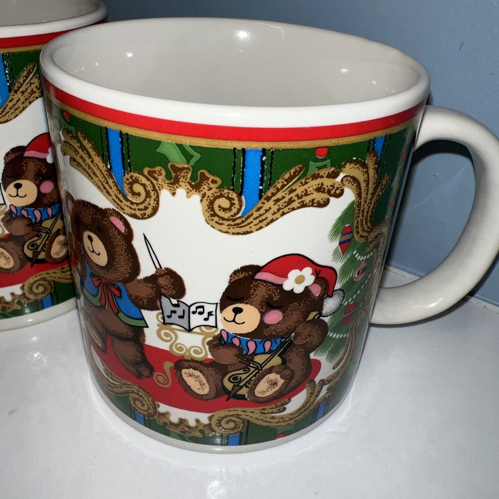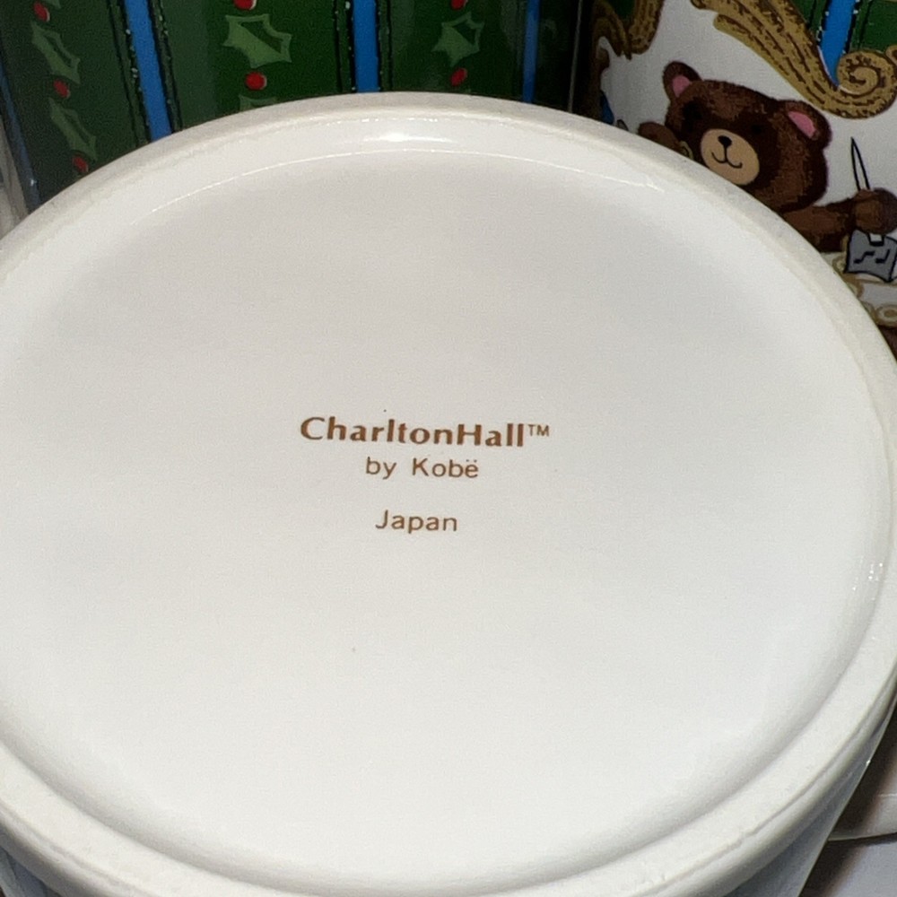 This vintage coffee/cocoa mug set from Charlton Hall by Kobe Japan features a charming design with bears and holly, perfect for Christmas and all occasions. The round mugs are small in size and made of ceramic art pottery, showcasing a traditional holiday style. The set includes four mugs with design on each side. The foam insert of original box is taped together. They appear to not have been used, one mug (see picture) may have fissure crack during storage. The box is reduced in price due to this compromise.