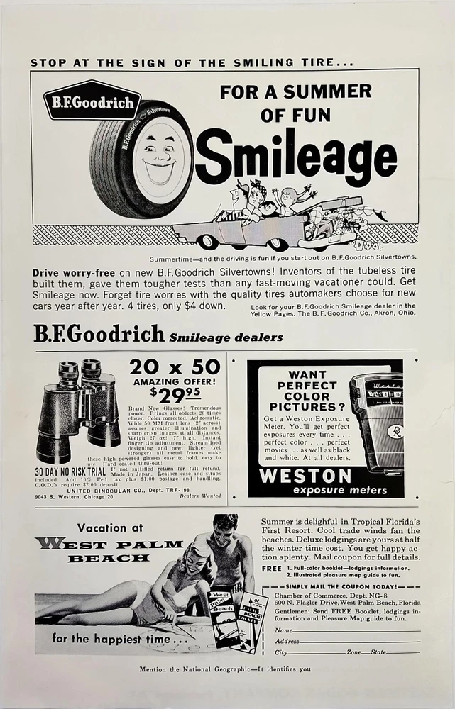 Vintage July 1959 National Geographic Kodak Camera BF Goodrich Print Ad 1959 National Geographic This page measures 6 1/2 x 10 Suitable for framing Came from a smoke free home