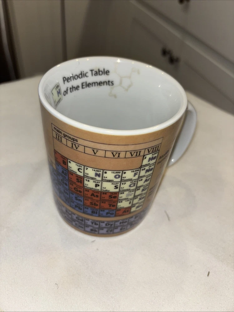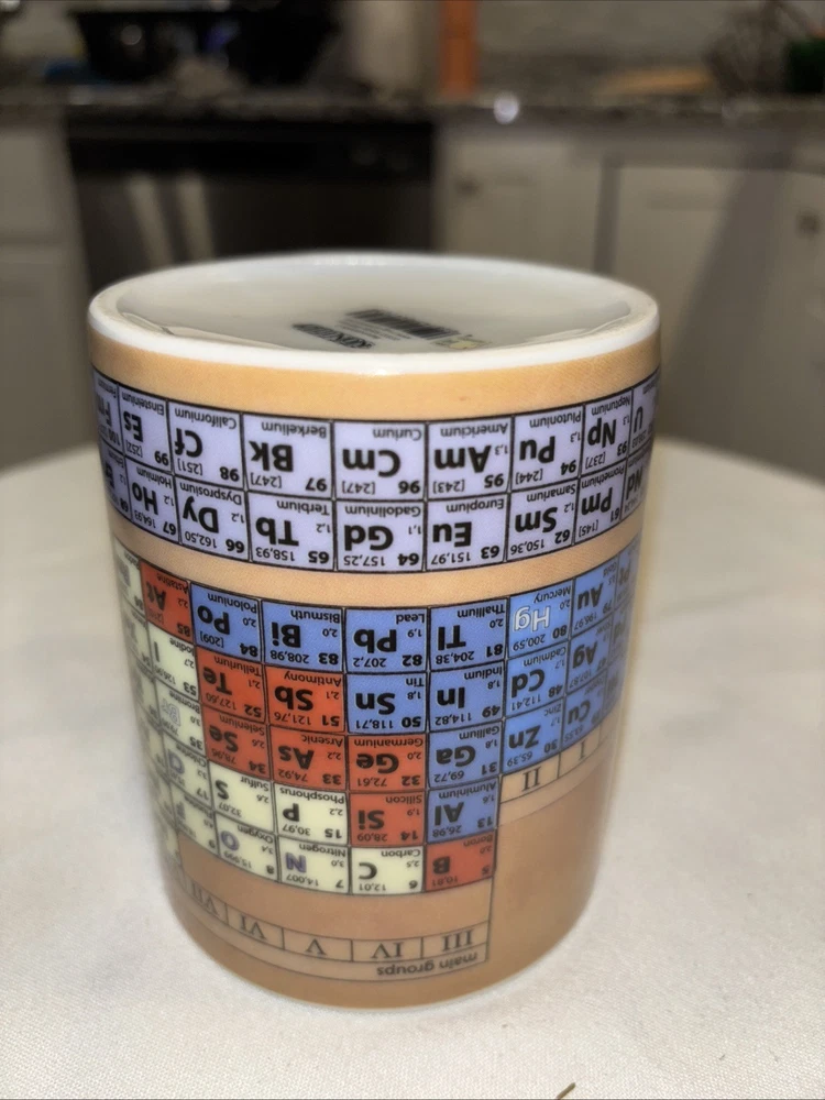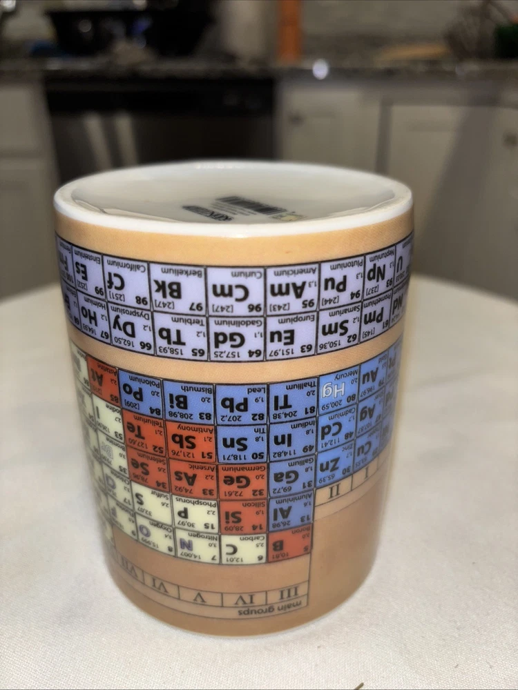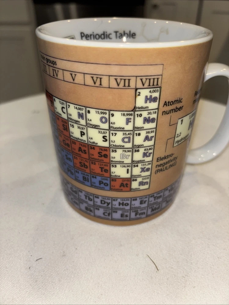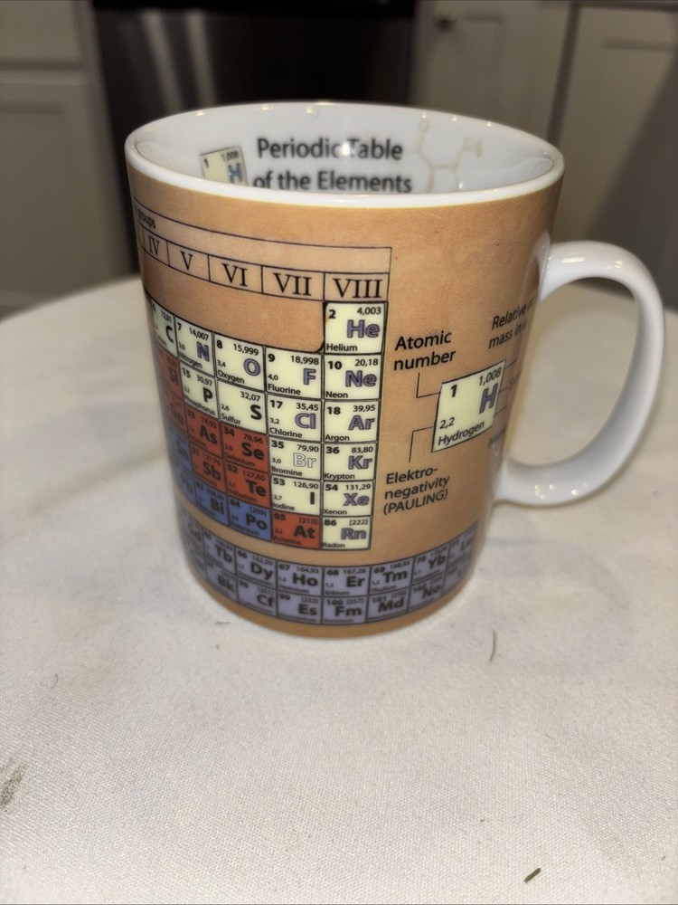 The Konitz Periodic Table of the Elements Coffee Mug is a unique and vintage ceramic cup featuring a modern design and a capacity of 10 oz. This school-themed mug is perfect for all occasions and can be used for hot or cold beverages. With a colorful multicolor pattern and a handle for easy gripping, this original Könitz brand mug is a collectible item that is ideal for any science enthusiast. Made in Thailand in 2001, this one-of-a-kind cup is a stylish addition to any kitchen or home decor. Preowned but not used. Great student gift. Return accepted within 30 days; buyer pays return shipping