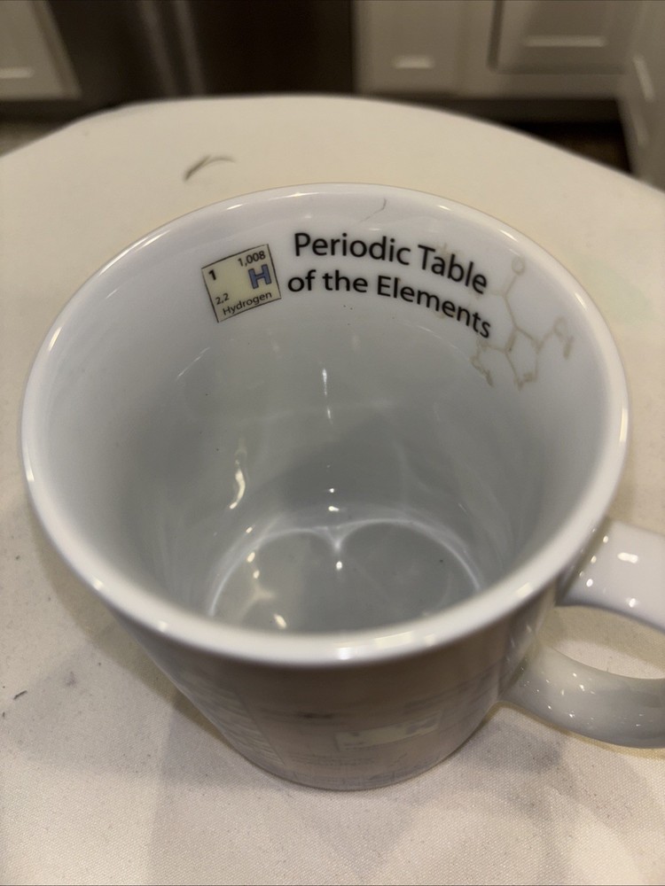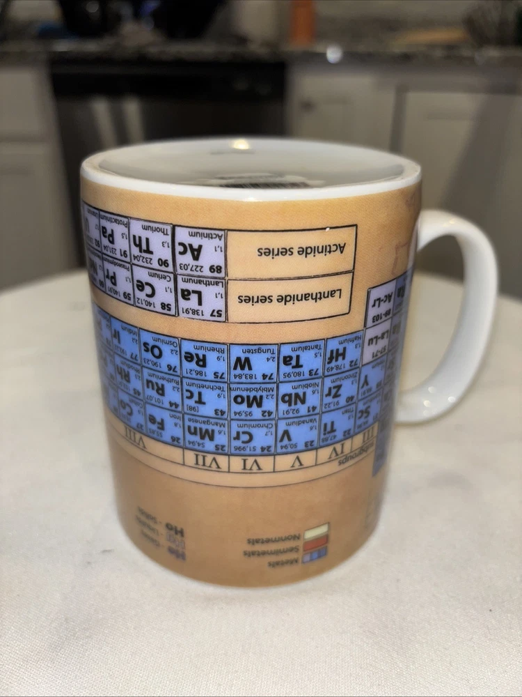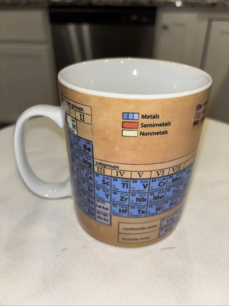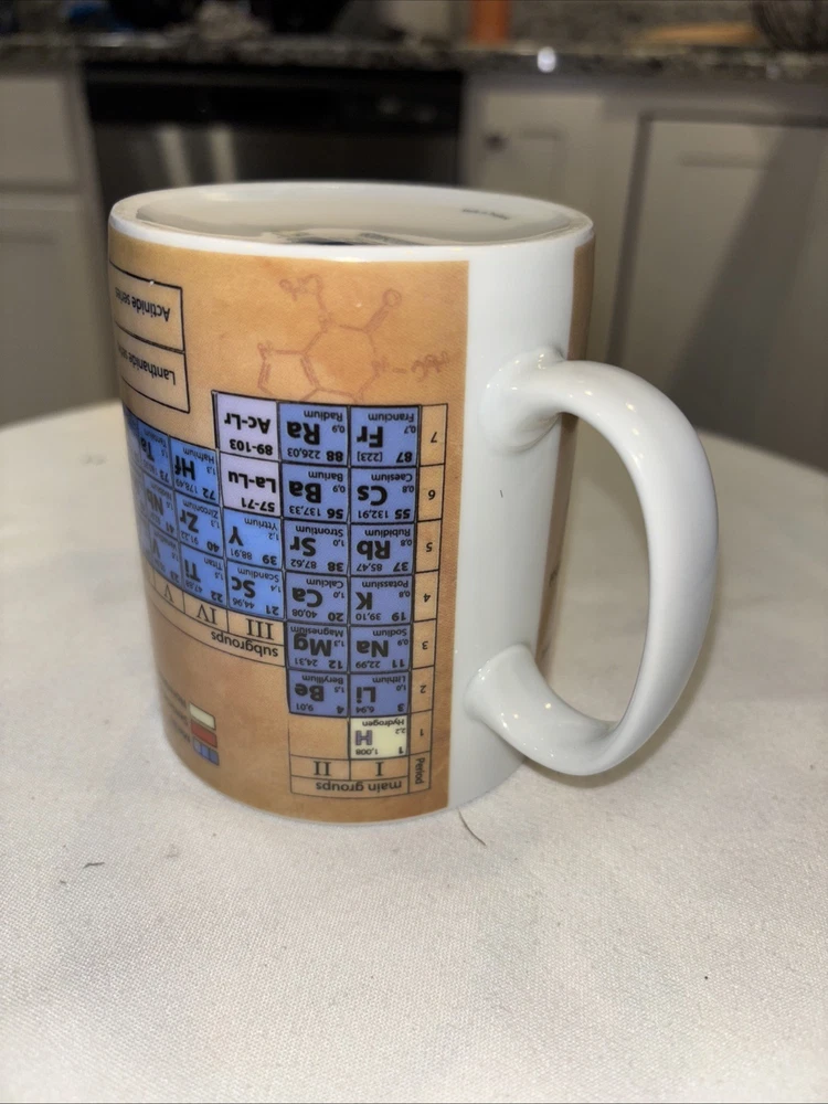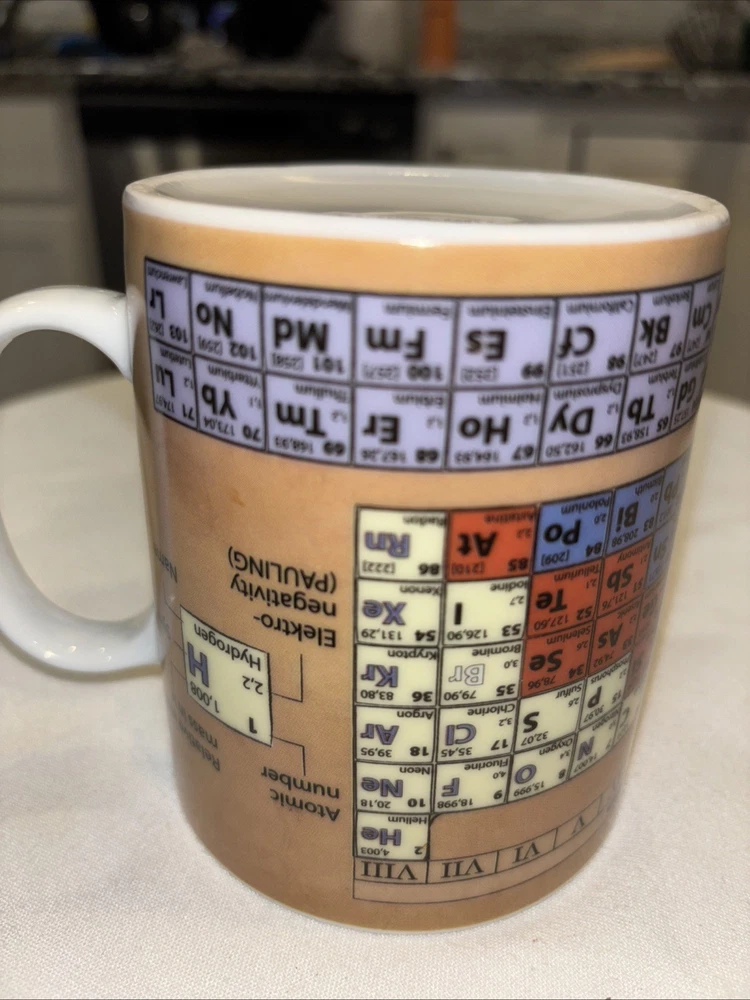 The Konitz Periodic Table of the Elements Coffee Mug is a unique and vintage ceramic cup featuring a modern design and a capacity of 10 oz. This school-themed mug is perfect for all occasions and can be used for hot or cold beverages. With a colorful multicolor pattern and a handle for easy gripping, this original Könitz brand mug is a collectible item that is ideal for any science enthusiast. Made in Thailand in 2001, this one-of-a-kind cup is a stylish addition to any kitchen or home decor. Preowned but not used. Great student gift. Return accepted within 30 days; buyer pays return shipping